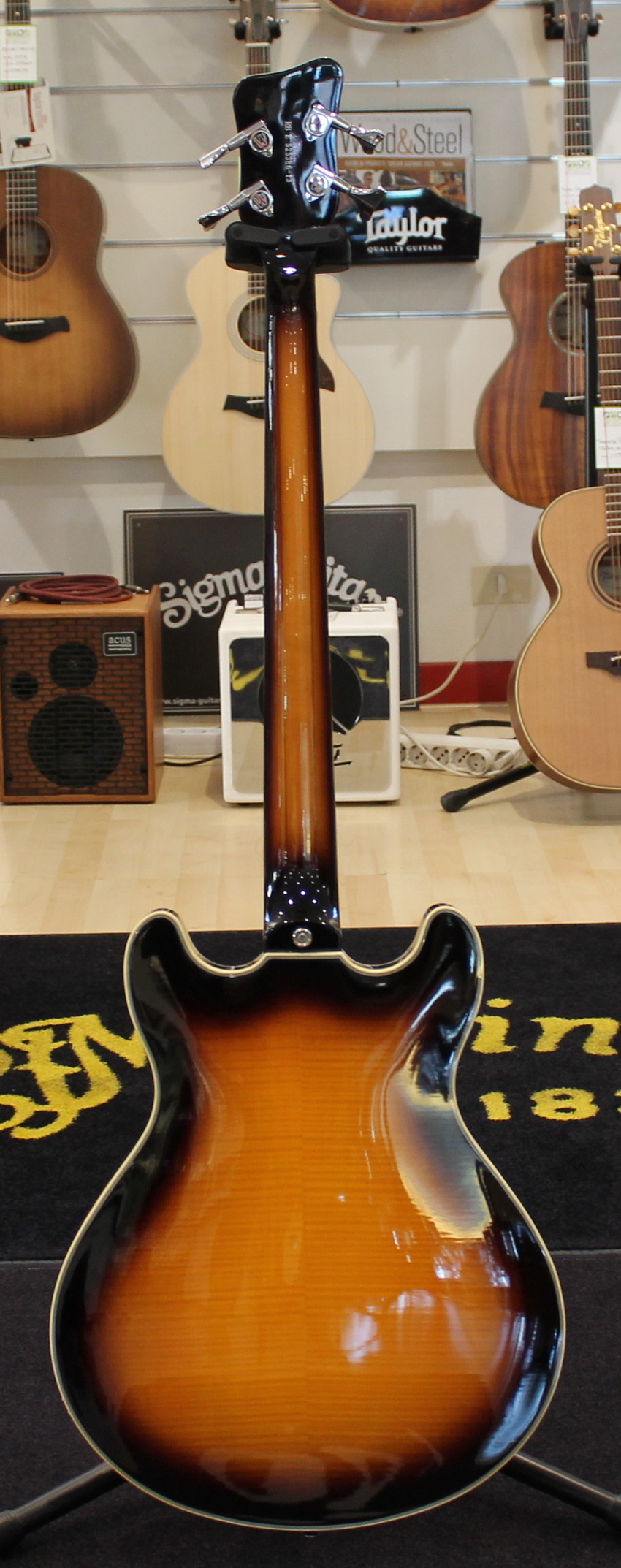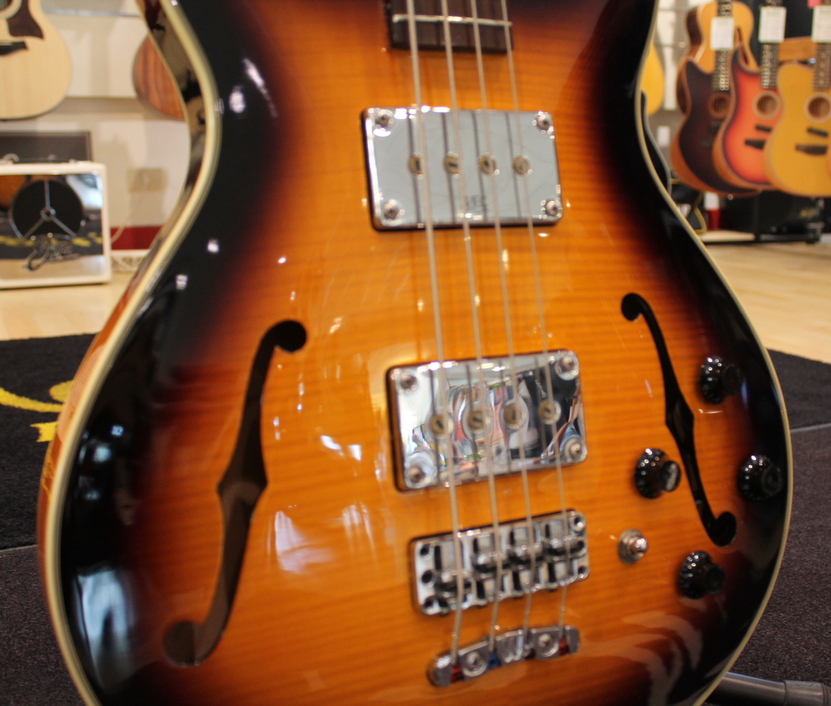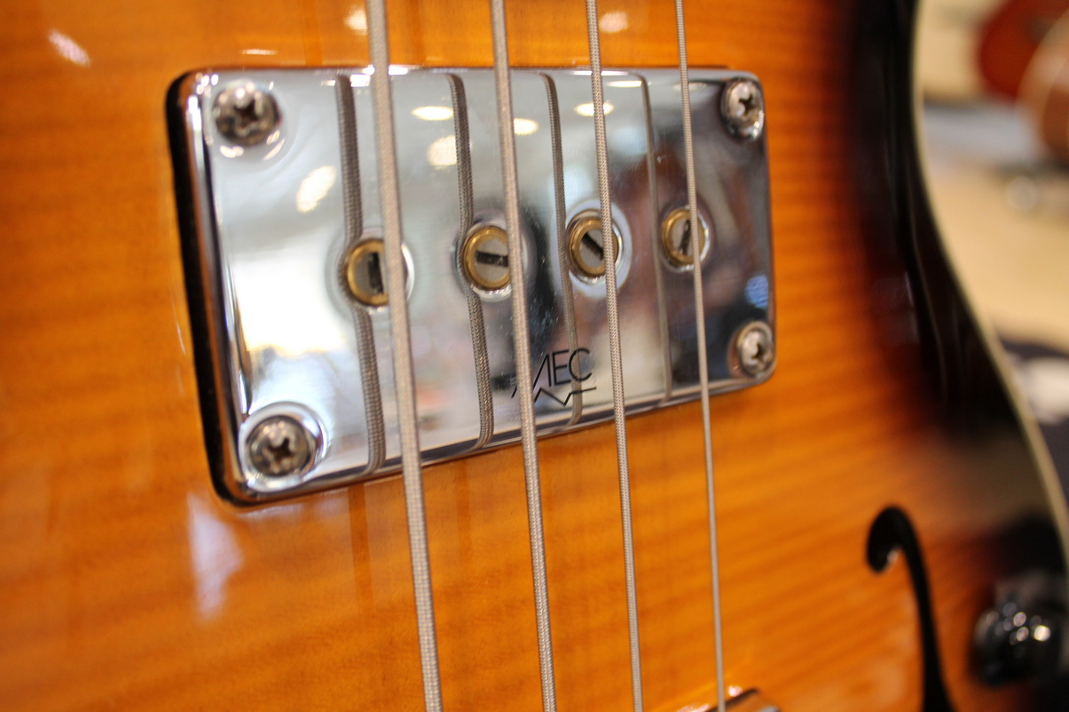 The hollow body of the RockBass Star Bass is made with laminated Maple back, sides and top. The neck is laminated Maple with Ekanga veneer and rosewood fingerboard. The four-string Star Bass has a medium scale (32″) and features passive electronics with passive MEC single coil pickups at the neck and bridge.