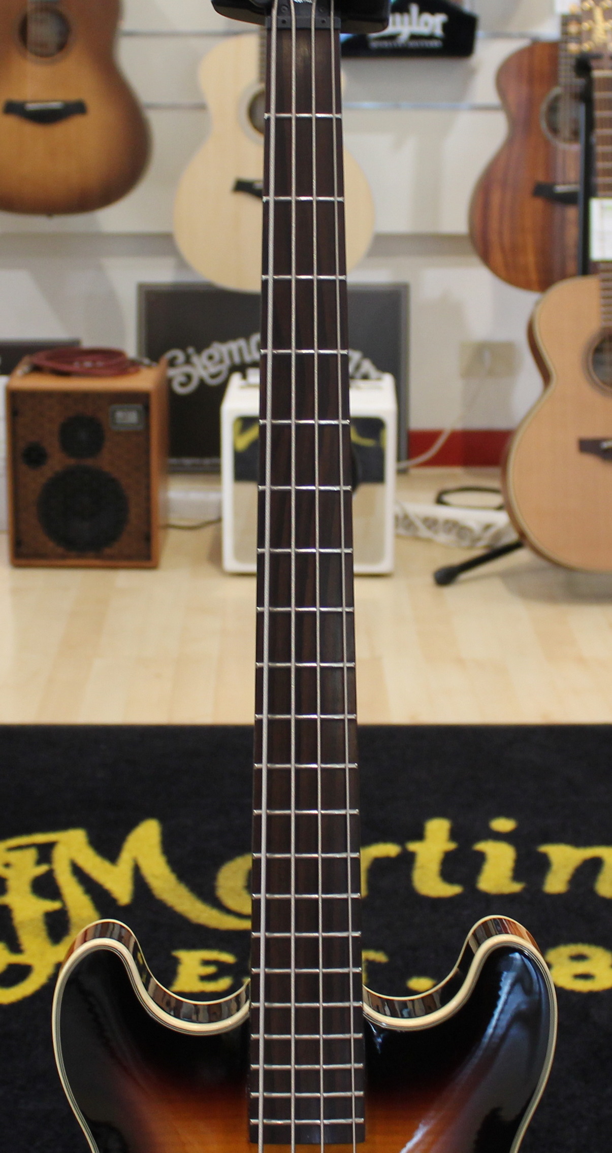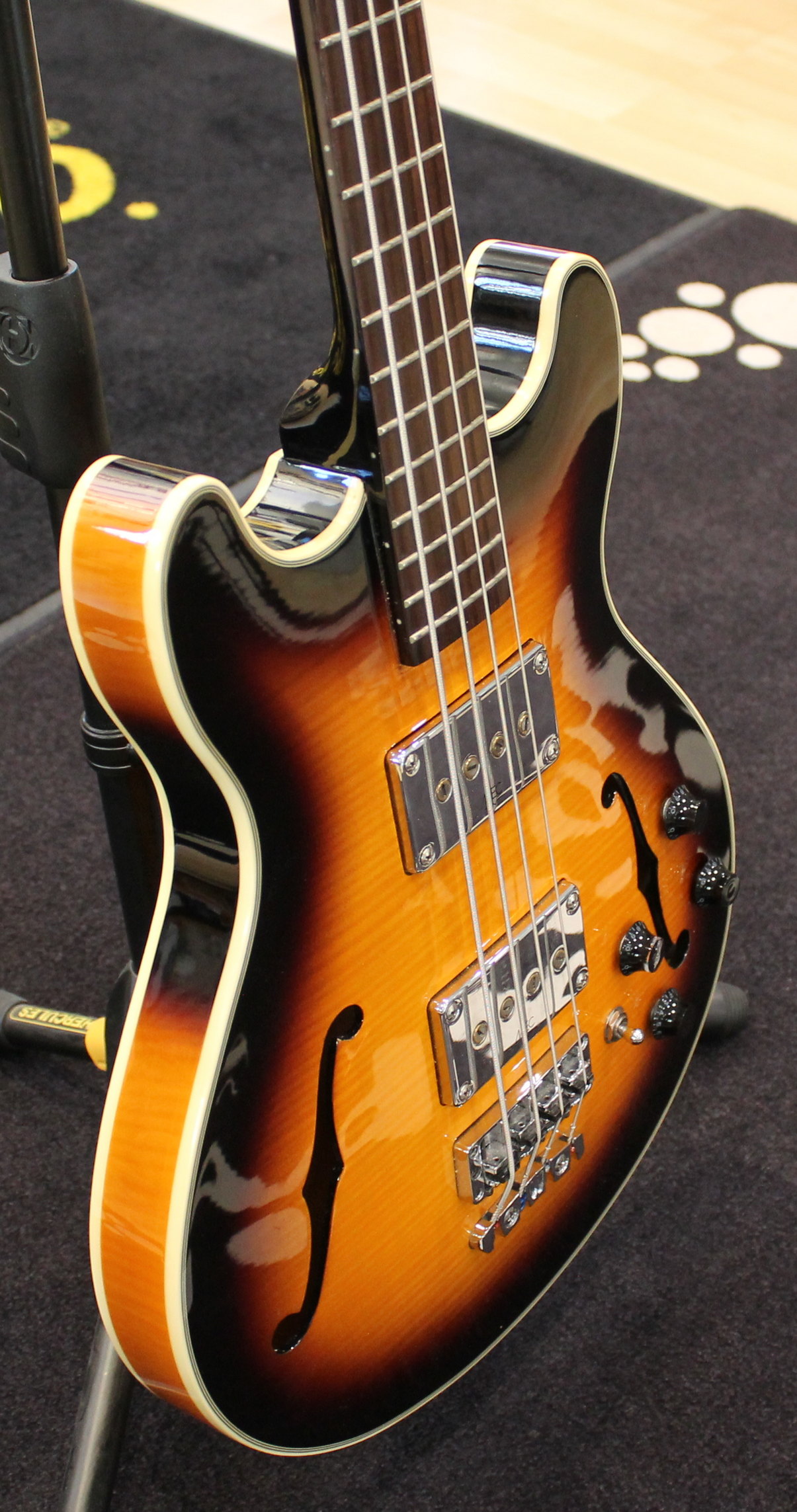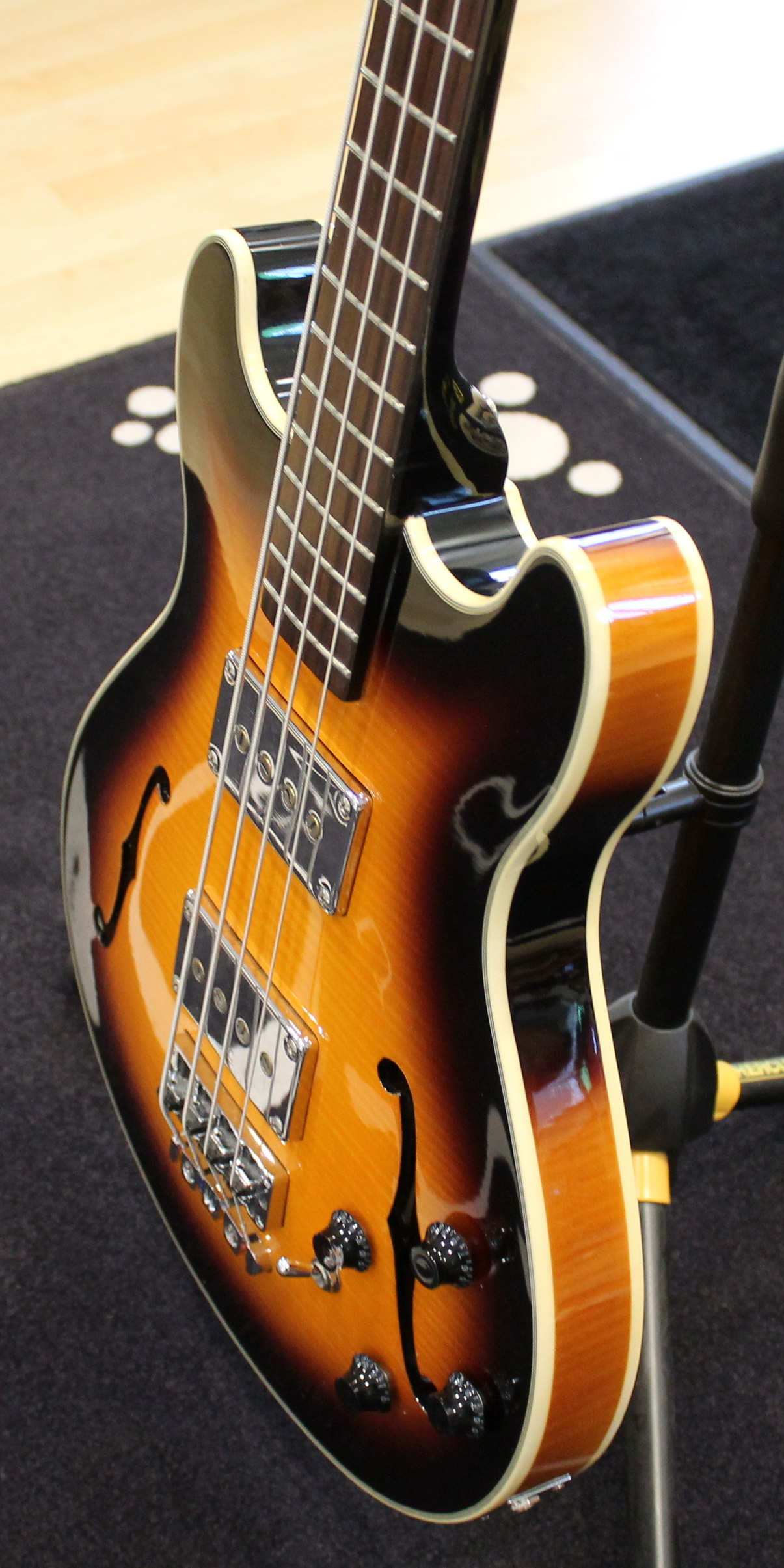 The hollow body of the RockBass Star Bass is made with laminated Maple back, sides and top. The neck is laminated Maple with Ekanga veneer and rosewood fingerboard. The four-string Star Bass has a medium scale (32″) and features passive electronics with passive MEC single coil pickups at the neck and bridge.