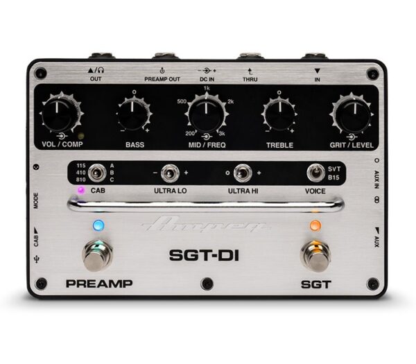 Il preamplificatore e la DI SGT-DI offre ai bassisti moderni un intero rig in un unico stompbox. Offre un circuito overdrive potenziato con tecnologia Super Grit con voci iconiche Ampeg SVT e B15, versatile EQ a 3 bande ora con circuito Mid regolabile, interruttori Ultra-Hi e Ultra-Lo a 3 vie, un compressore variabile e una sezione Aux/Headphone. Di Più! C’è il primo IR Loader / Cab Simulator di Ampeg. Scegli tra tre cabinet di fabbrica classici o fino a tre cabinet personali utilizzando l’applicazione gratuita Ampeg IR Loader.