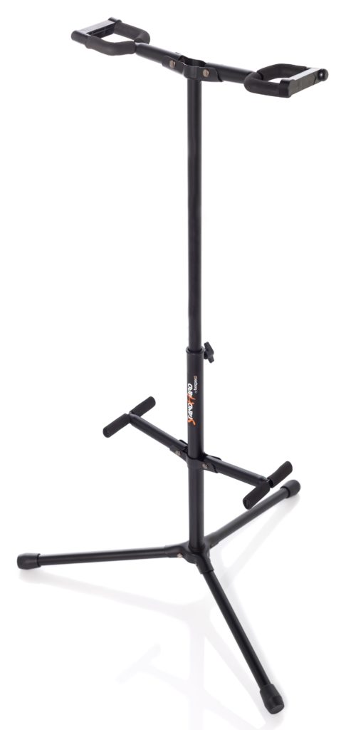 Supporto da terra per due chitarre, regolabile in altezza. Punti di appoggio dello strumento protetti in EVA.