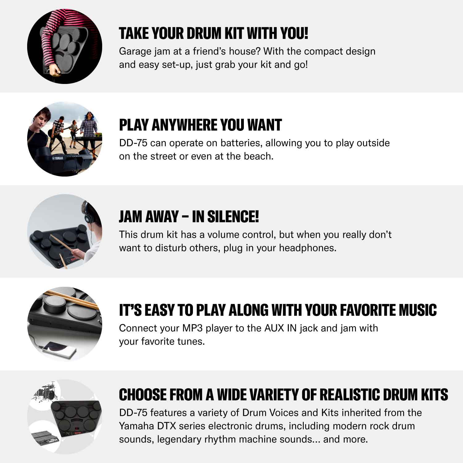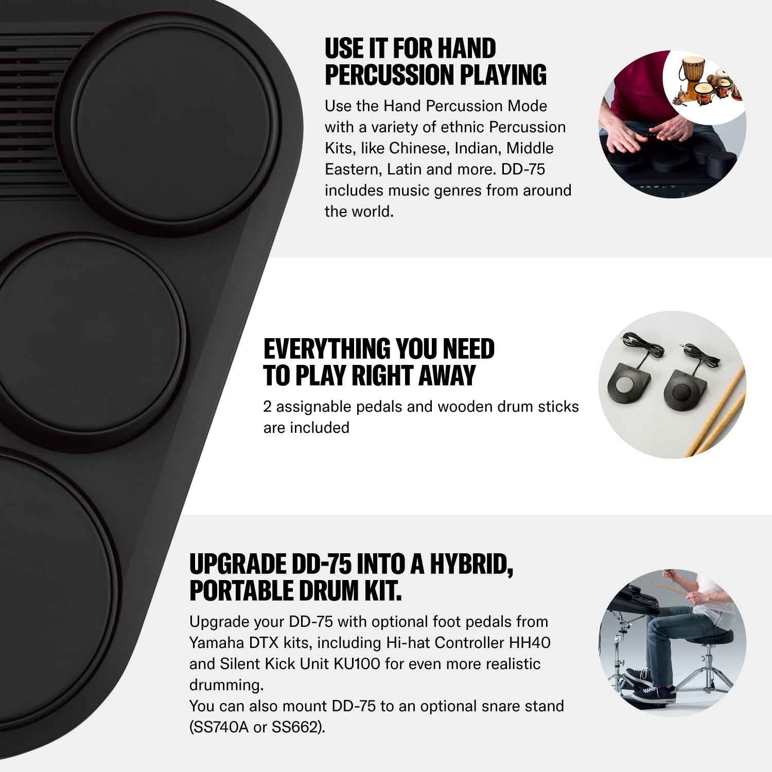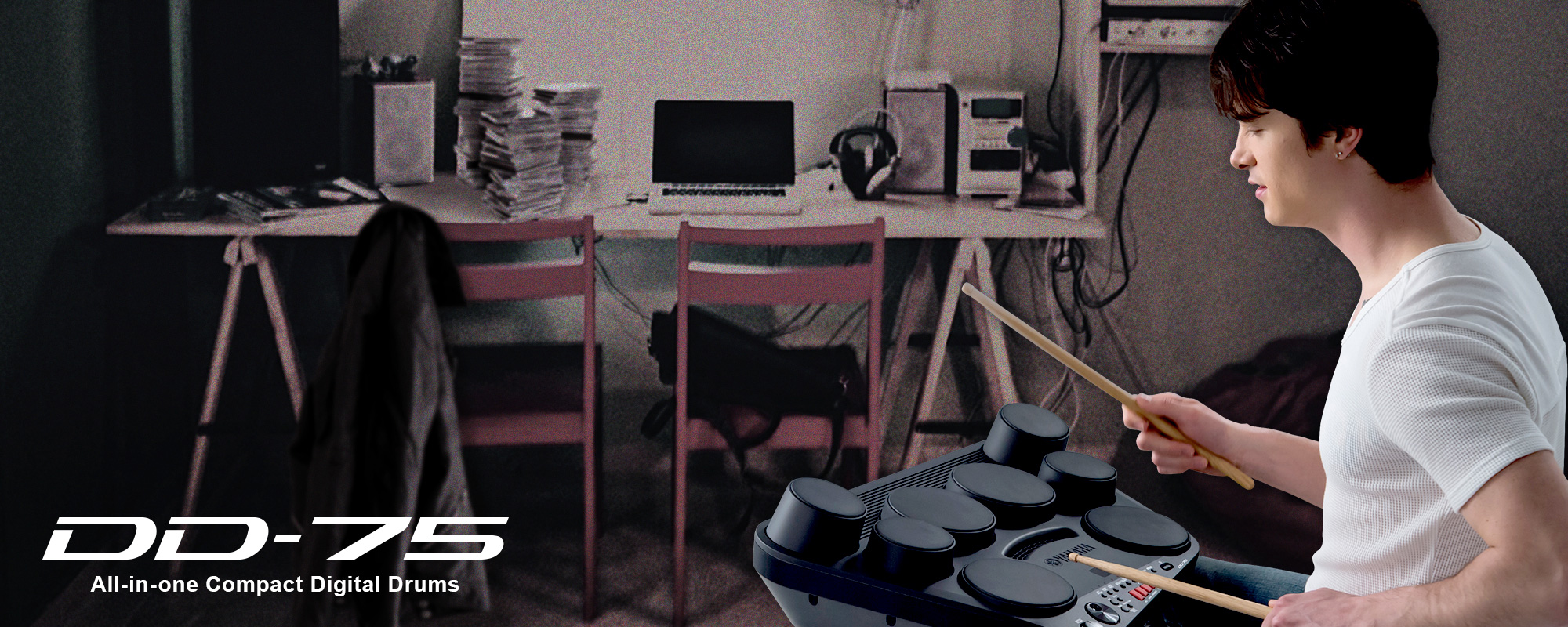 DD-75 è una batteria digitale con otto pad sensibili al tocco e due pedali. Batterie di alta qualità ed una grande varietà di suoni di percussioni provenienti da tutto il mondo sono mixate con voci d’orchestra per fornire una ampia gamma di opportunità musicali. Il jack Aux In consente di collegare un lettore MP3 e suonare assieme alla tua musica preferita.