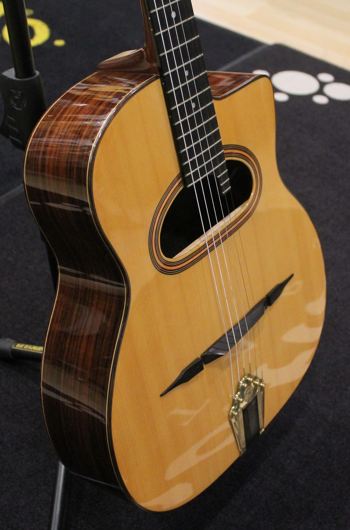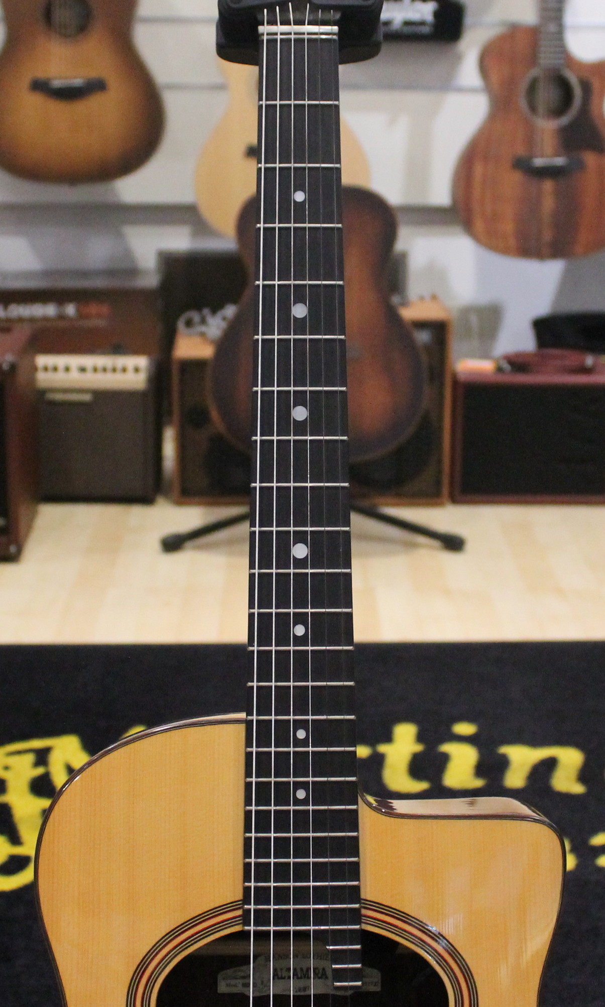 This finely crafted M01D Gypsy Jazz guitar from Altamira is a dedication to the history of the Gypsy Jazz era. In particular, this D-hole guitar has a solid European spruce top, with rosewood back and sides. Additionally, a feature of this guitar is its gently arched top, one of the secrets of the Macafferi design. This instrument comes in a gloss finish.
