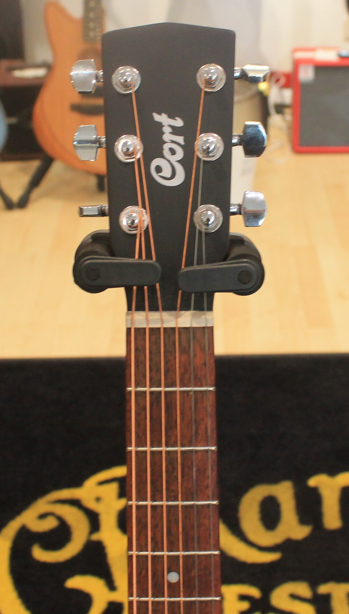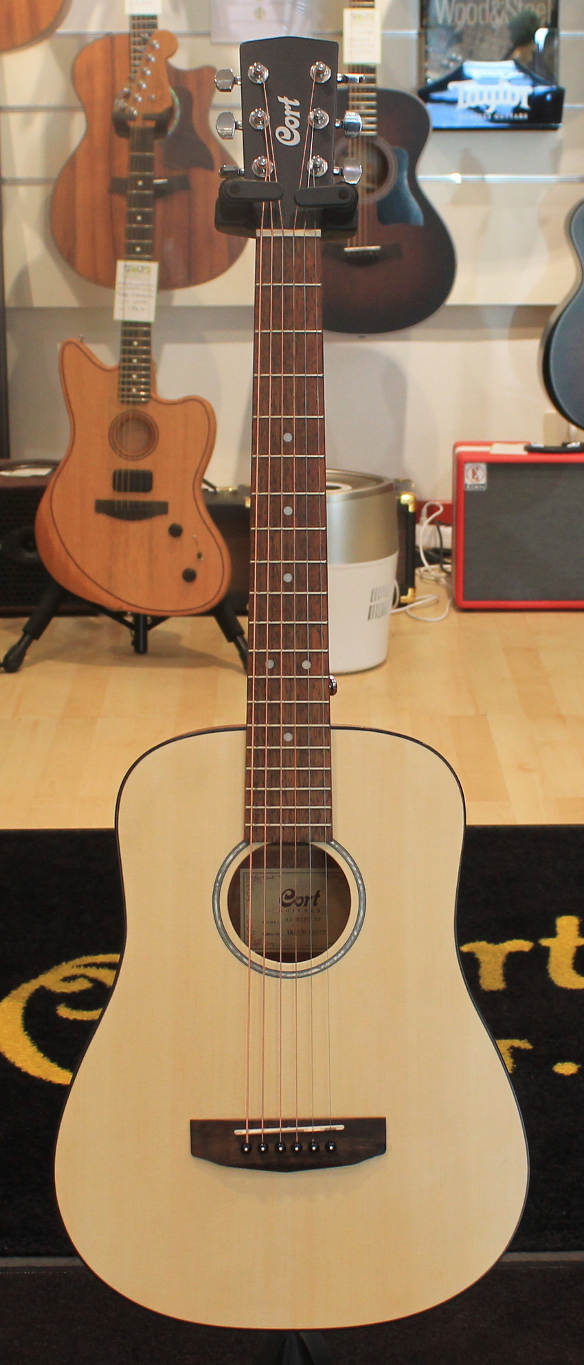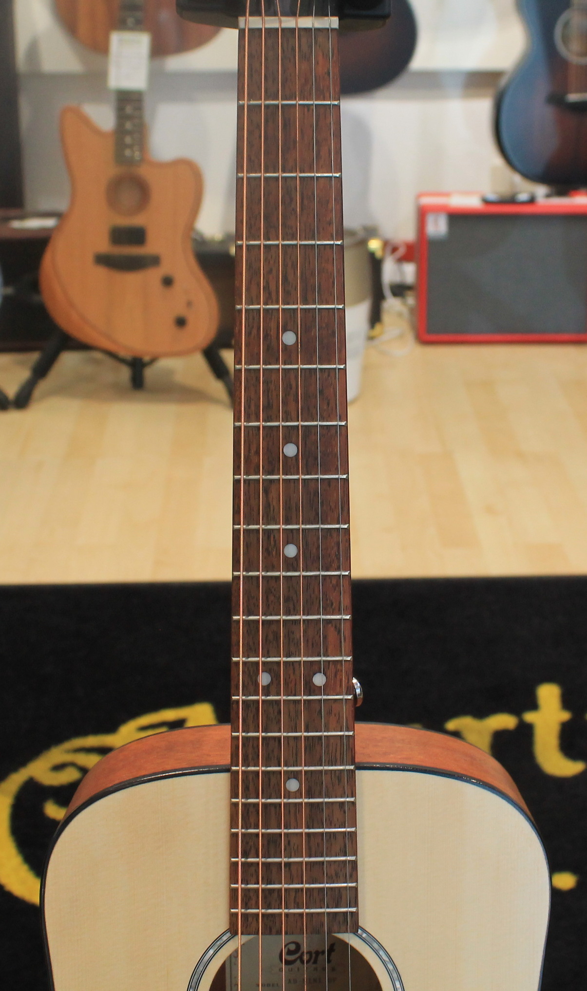 3/4 acoustic guitar Spruce top Mahogany back and sides Mahogany neck Rosewood fingerboard Chrome-plated Cort tuners Color: Natural Open Pore