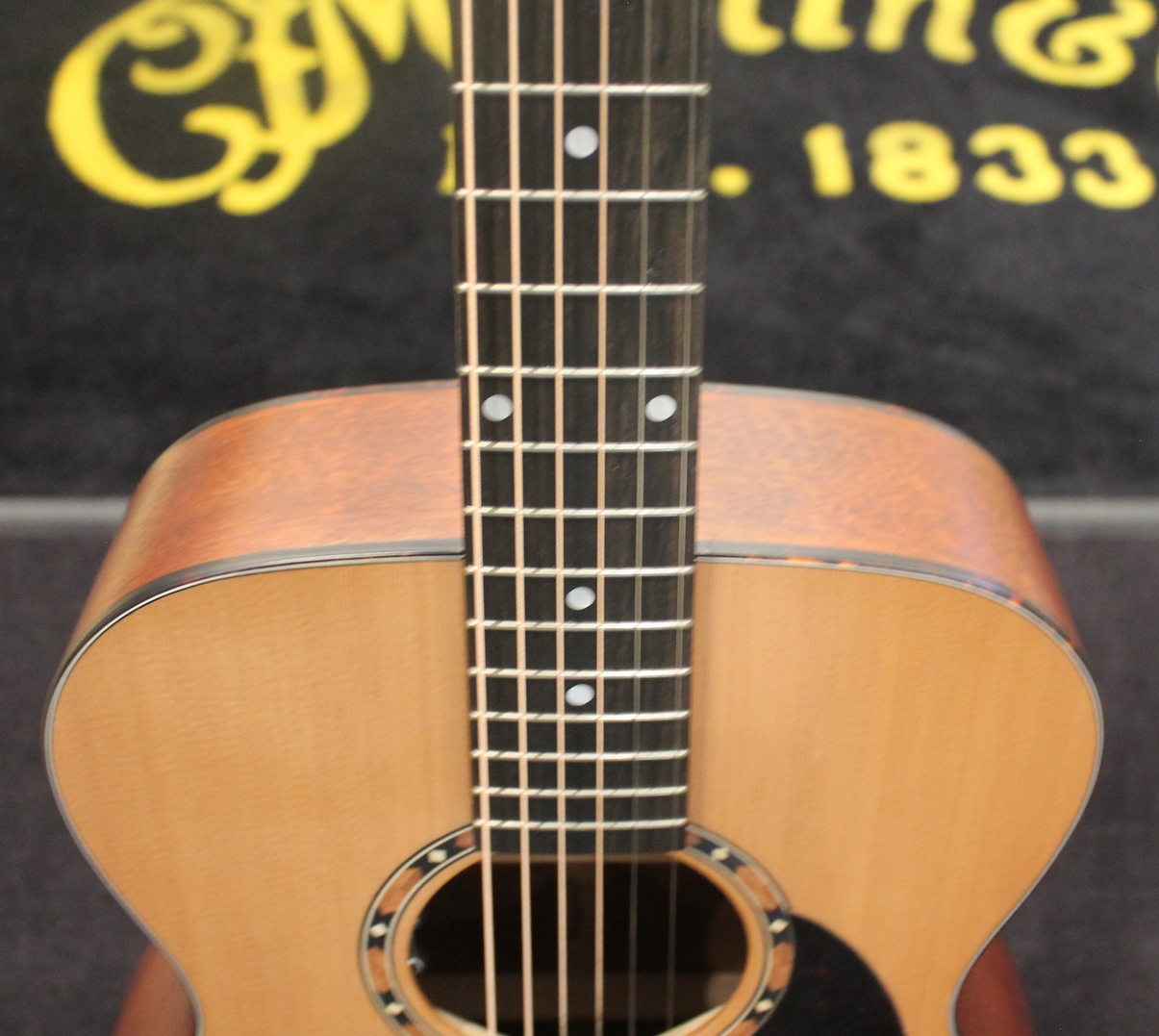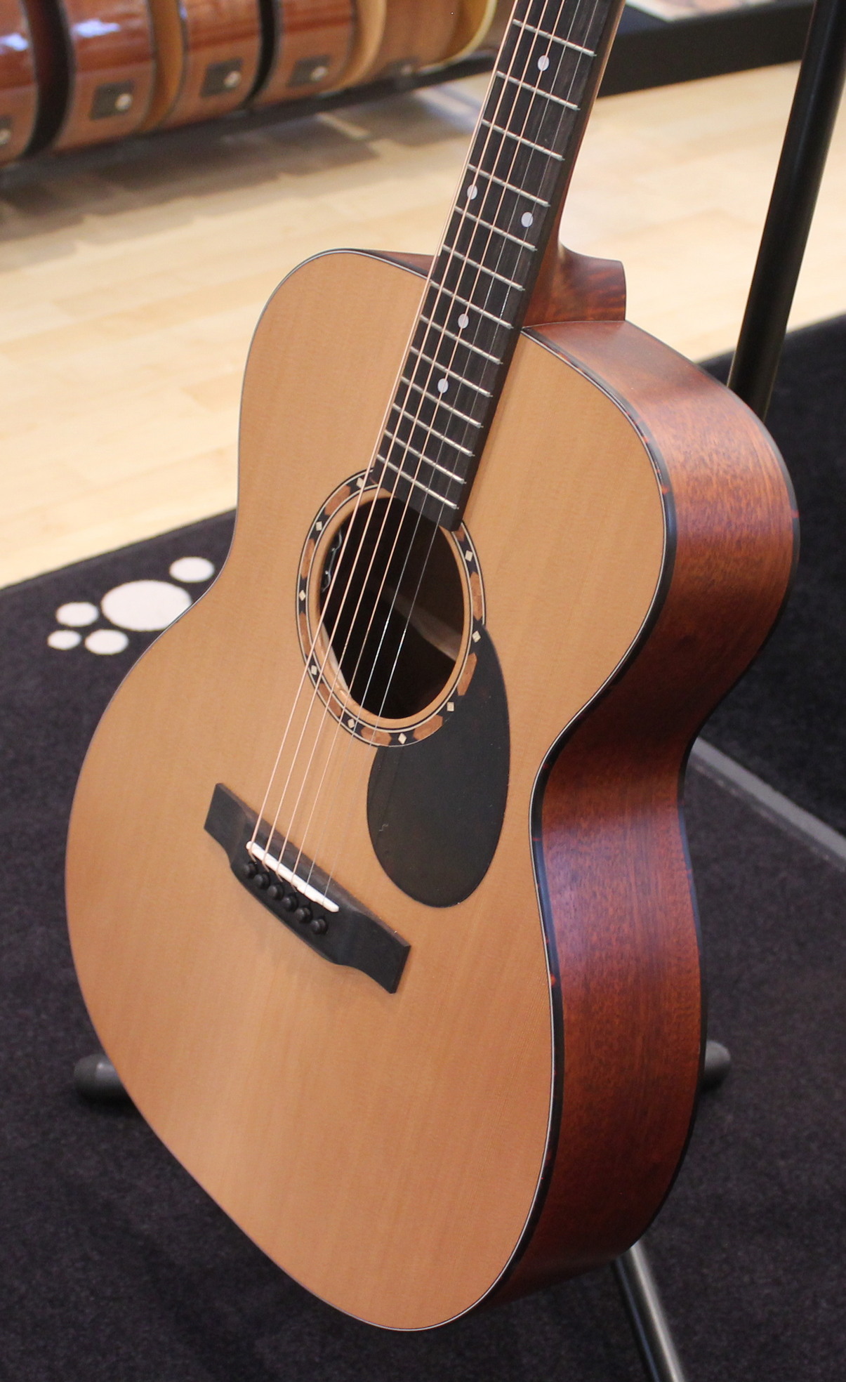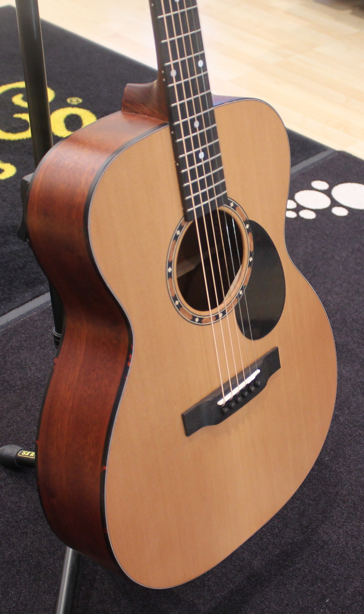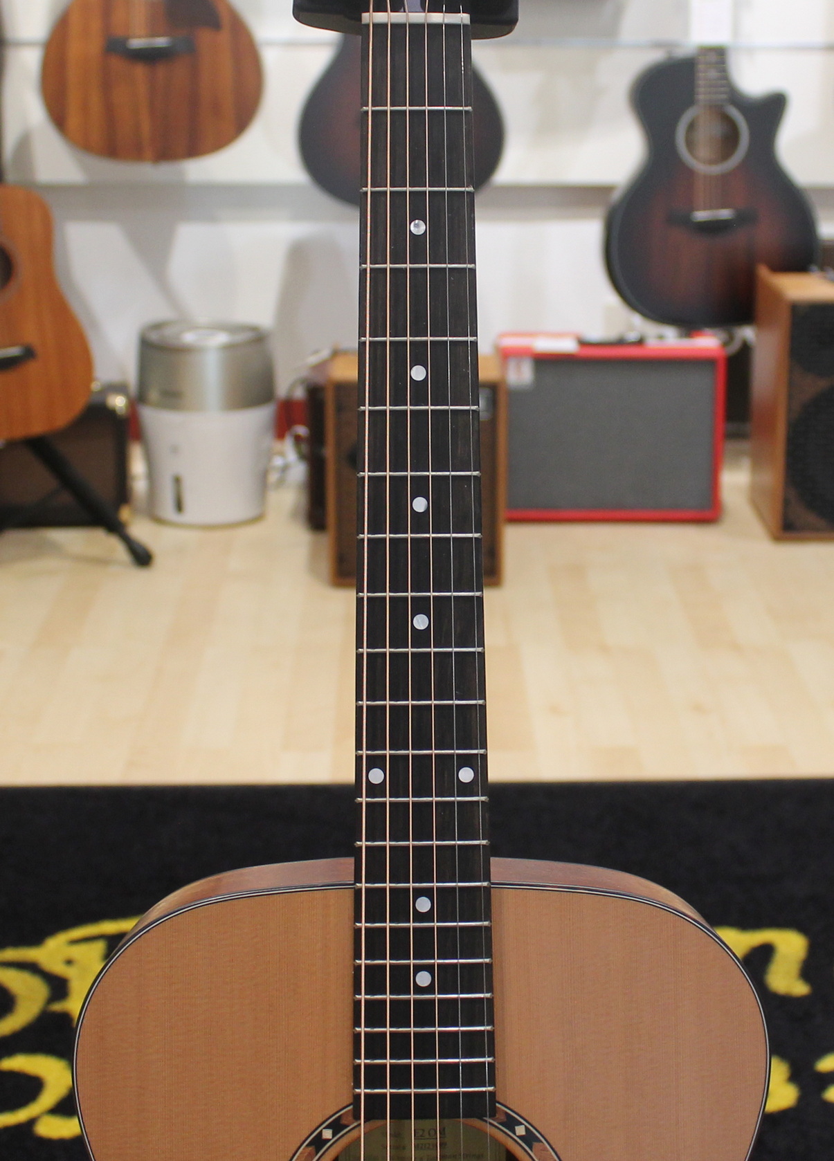This Eastman is a comfortable OM guitar with binding around the top and back. Add the beautiful rosette by Ebben and Maple and you have the Eastman E2OM. The sound of this guitar is dominated by the Cedar top, which provides a nicely defined sound, with sufficient highs and a solid presence in the low spectrum.