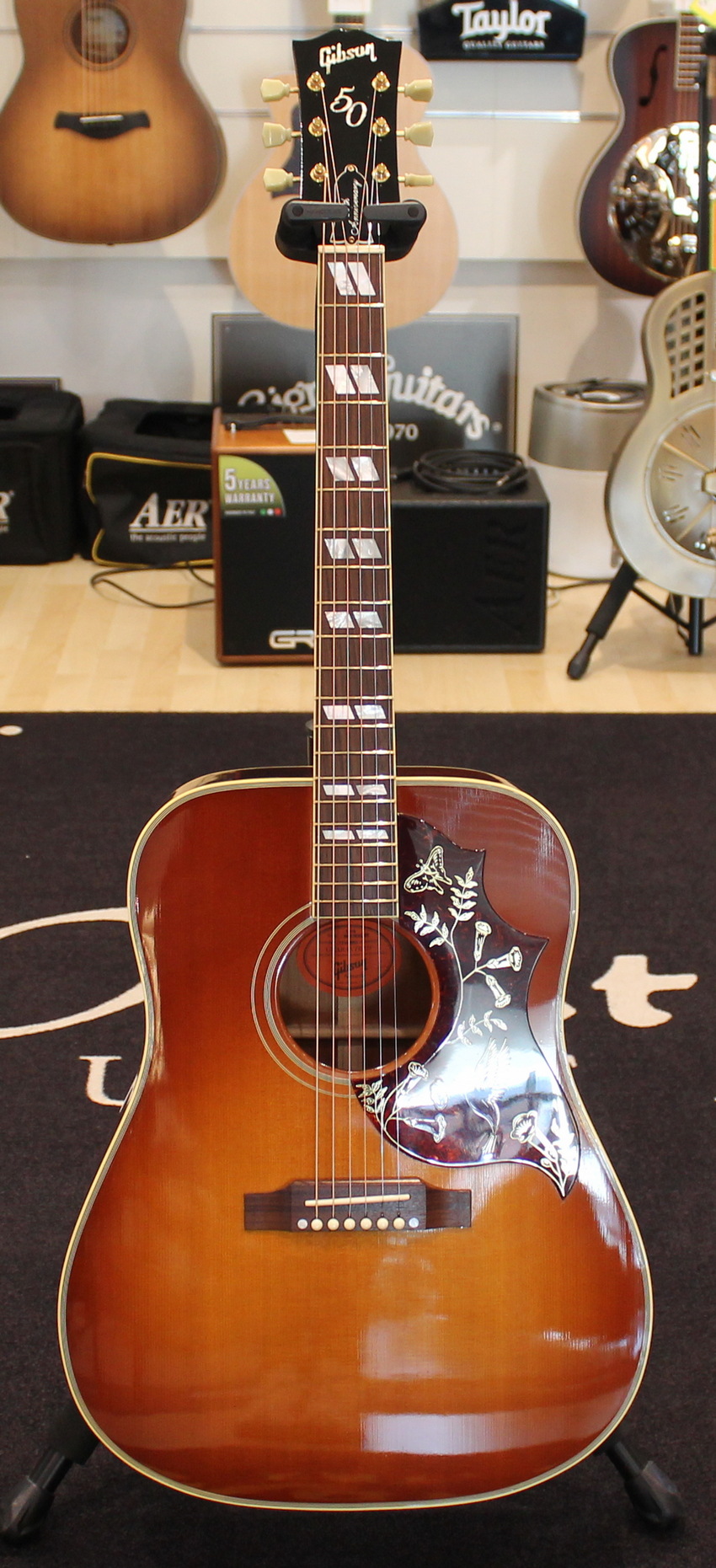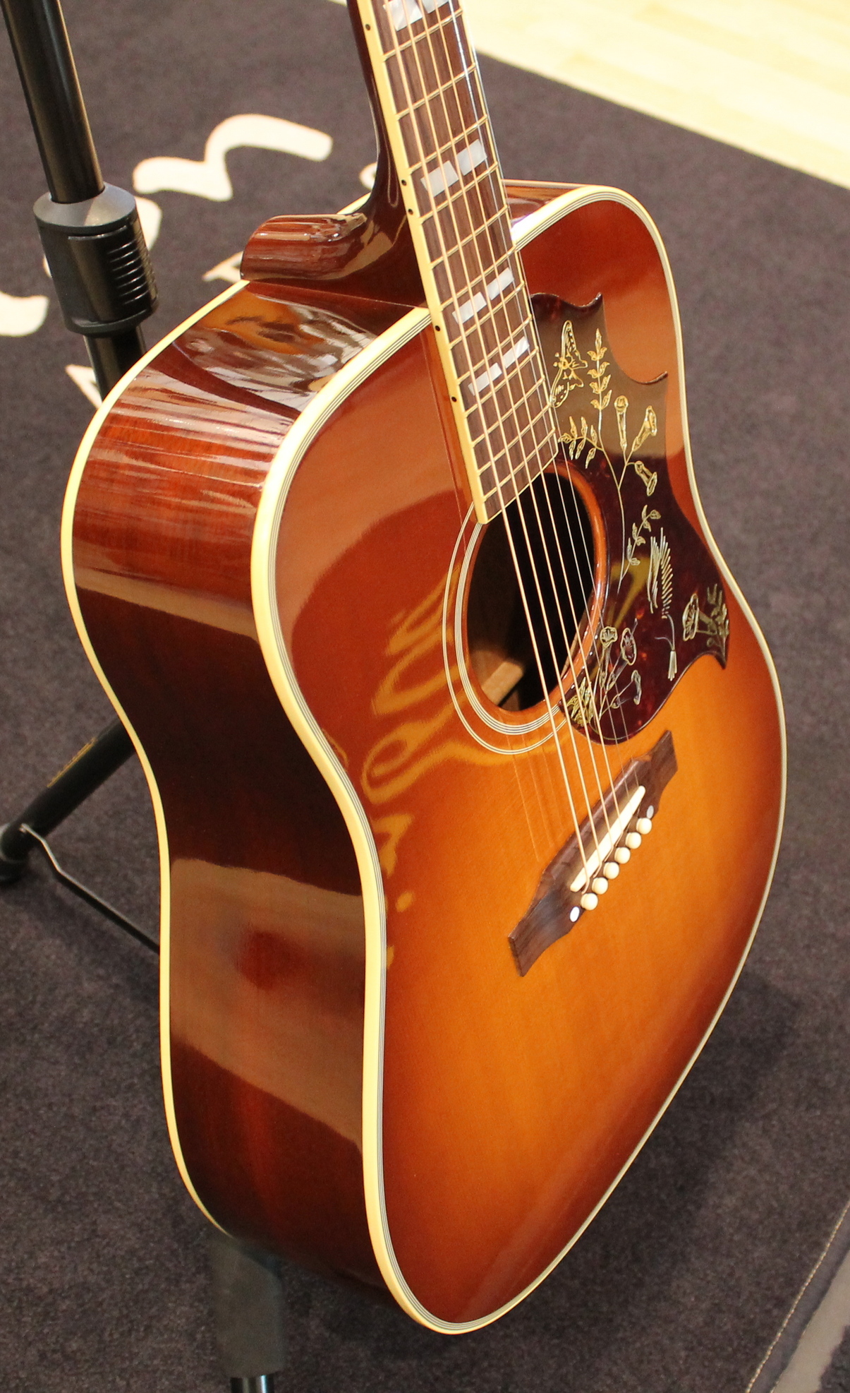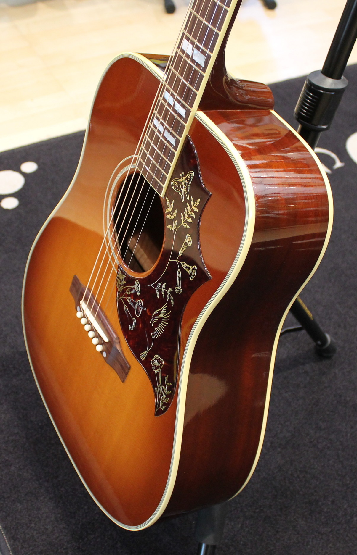 The Hummingbird was introduced in 1960 as next to top of the line after the J-200. Gibson dreadnoughts were mostly round-shouldered, but the Hummingbird used the square-shoulder, Martin style body. It was an immediate hit with players of all styles, and has retained its popularity.