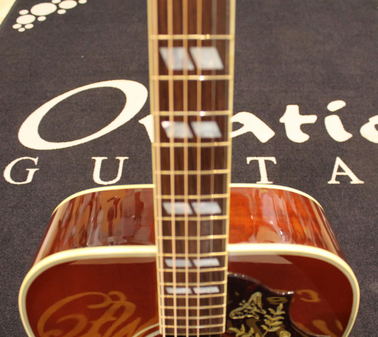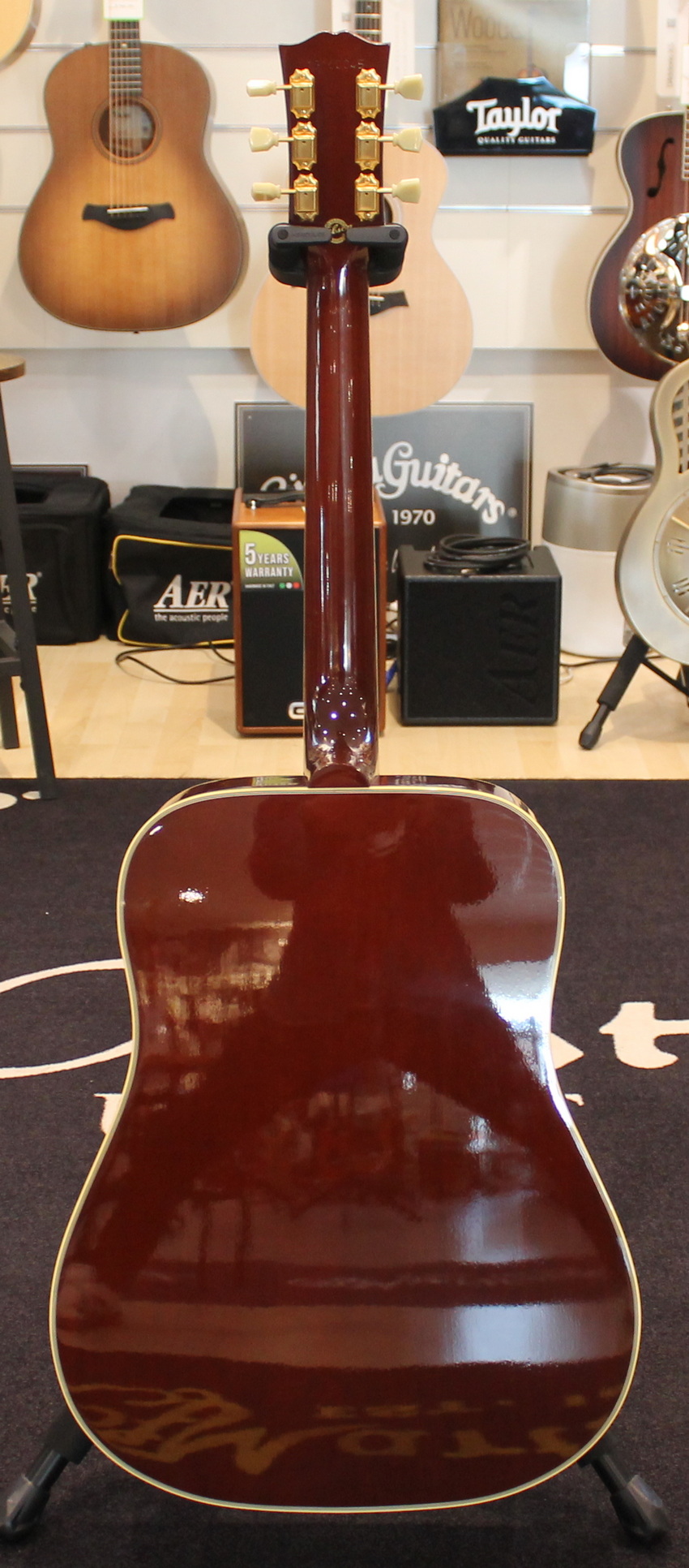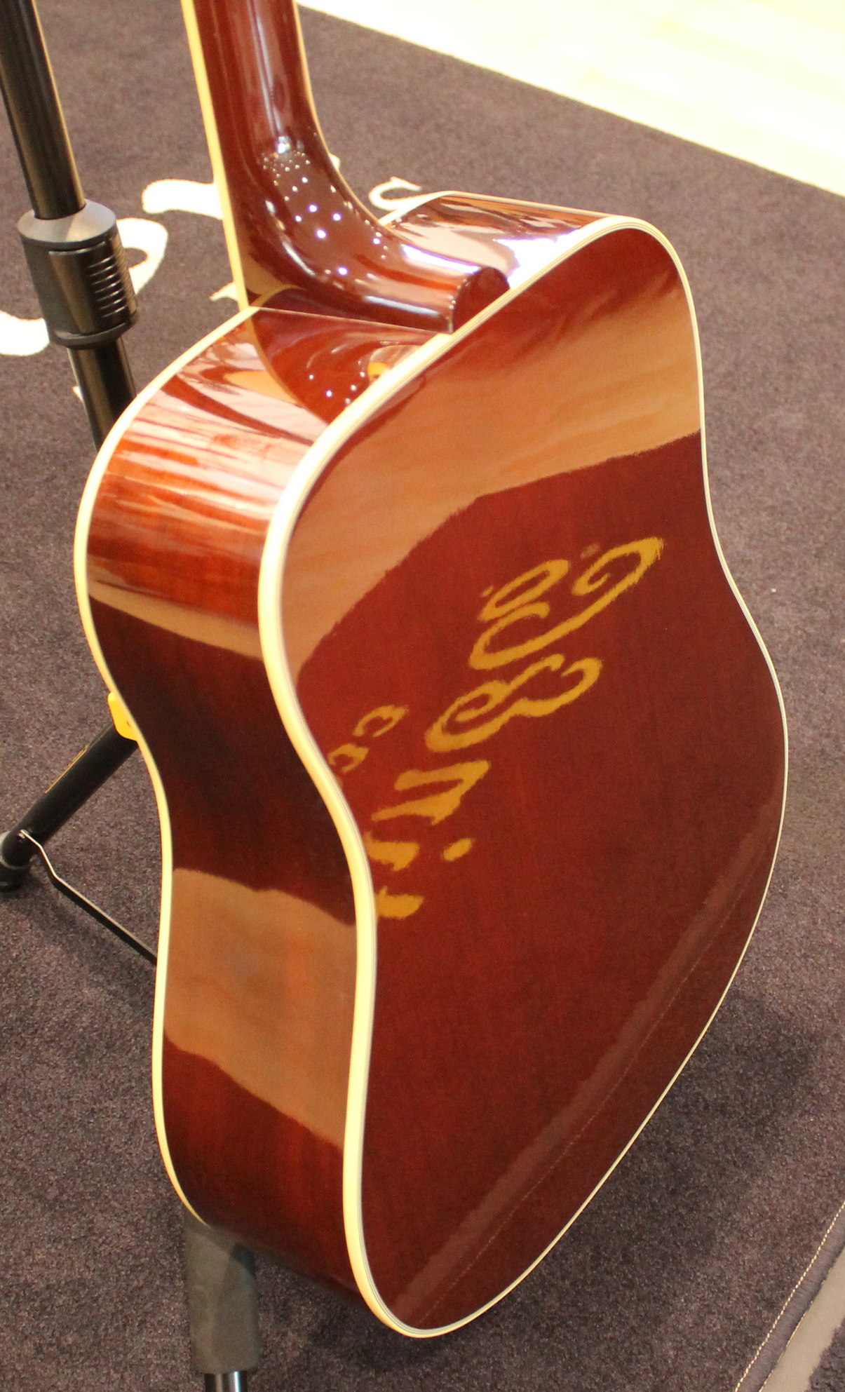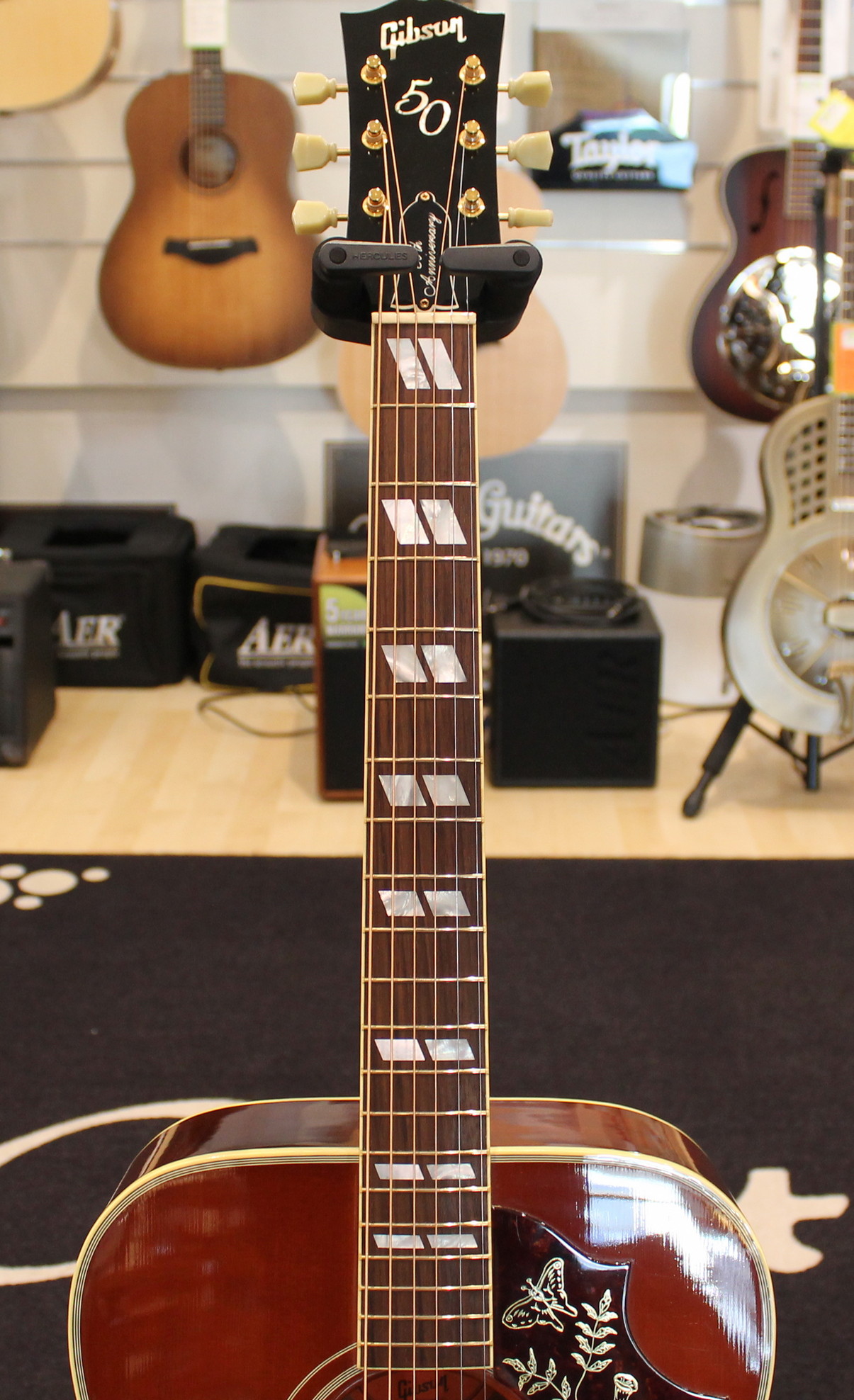 The Hummingbird was introduced in 1960 as next to top of the line after the J-200. Gibson dreadnoughts were mostly round-shouldered, but the Hummingbird used the square-shoulder, Martin style body. It was an immediate hit with players of all styles, and has retained its popularity.