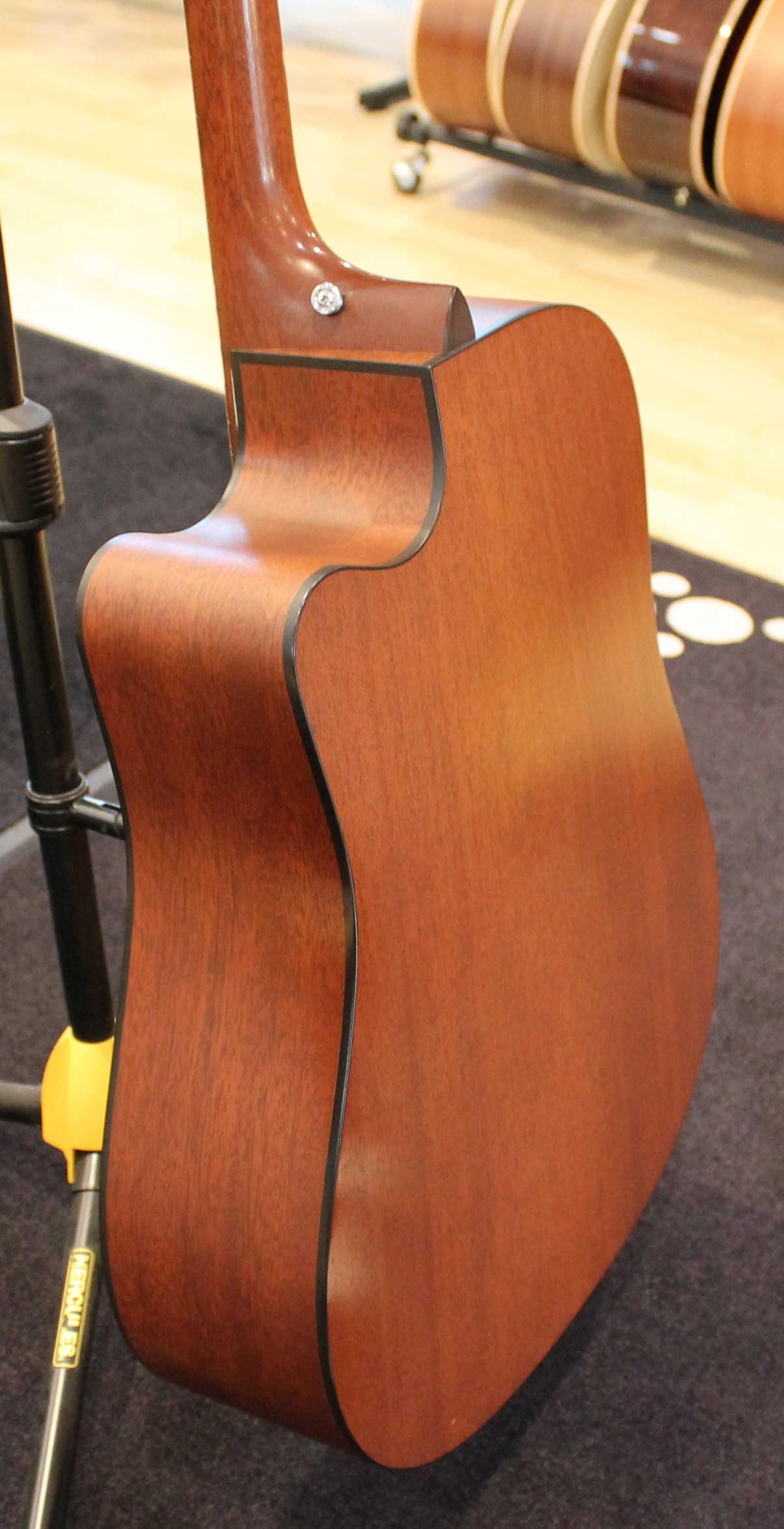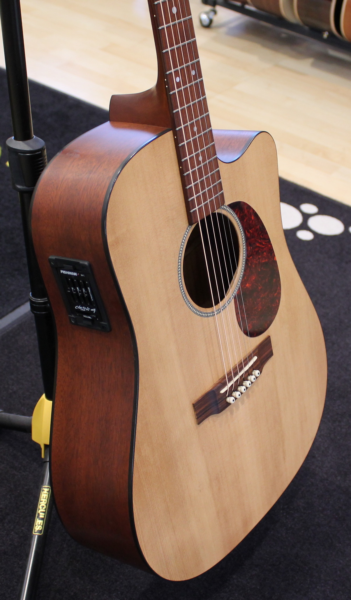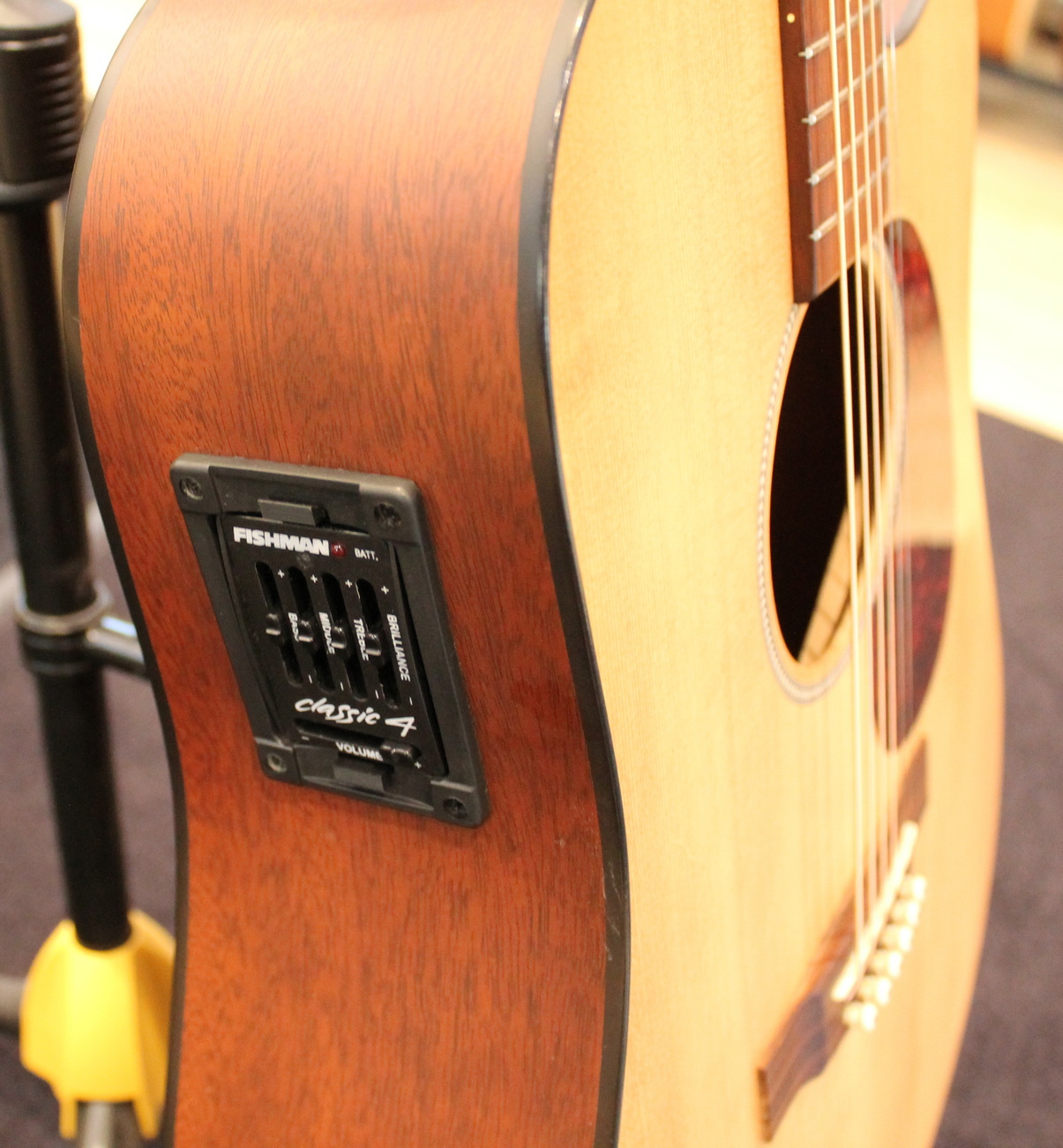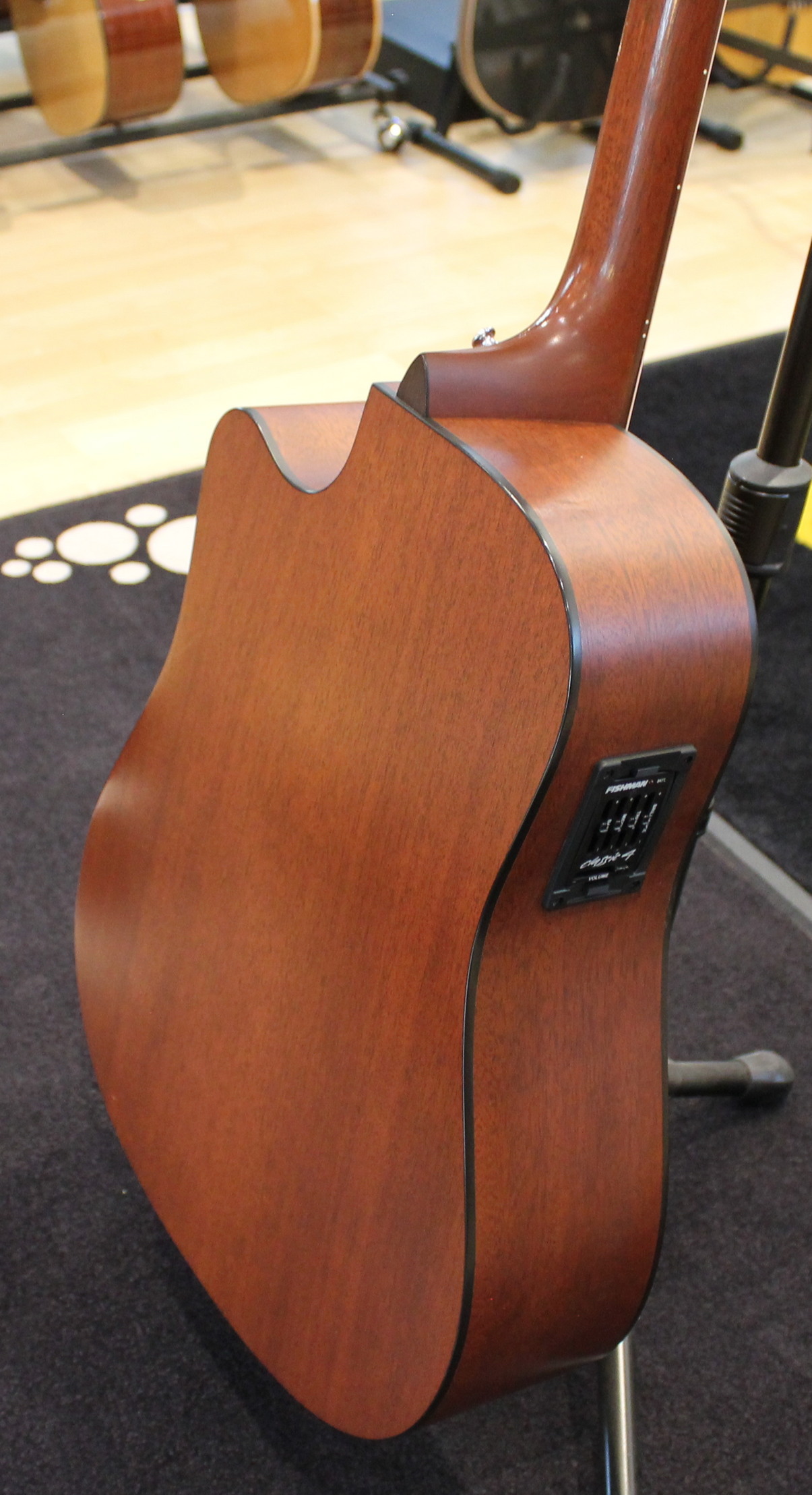 Electrified cutaway acoustic guitar, solid spruce top, mahogany sides, back and neck, rosewood fingerboard and bridge. Chrome-plated tuners, complete with molded hard case. Natural satin finish. FISHMAN CLASSIC 4 electronics.