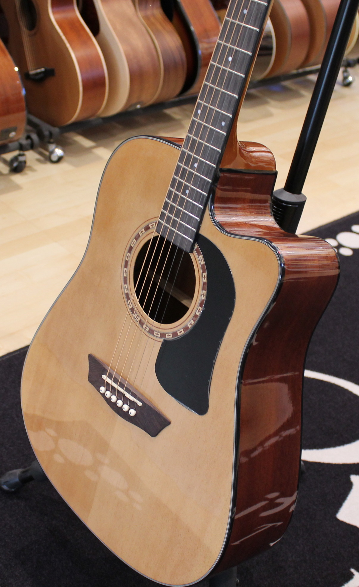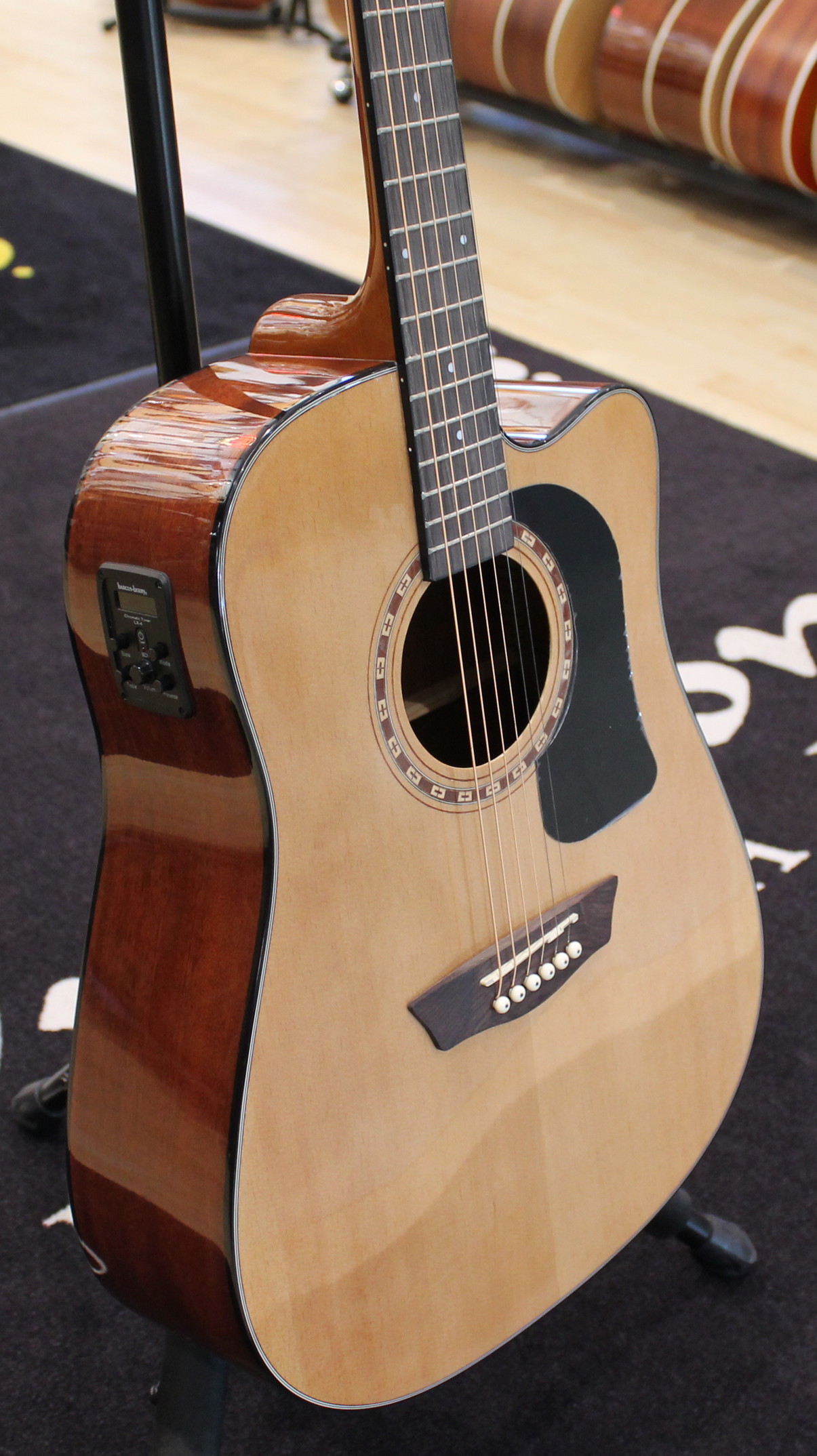 Washburn AD5CE is a natural single cutaway Dreadnought electro-acoustic guitar from Washburn’s Apprentice series. Washburn’s expertise ensures that you get a guitar that is perfectly balanced between stability, tone, and looks. This electrified acoustic guitar with a dreadnought body features a premium spruce top with mahogany back and sides for a full, rich tone. Those looking for a guitar that sounds great, looks good, and serves them well as they advance in their study of the instrument will find the Apprentice series perfect for their purposes.