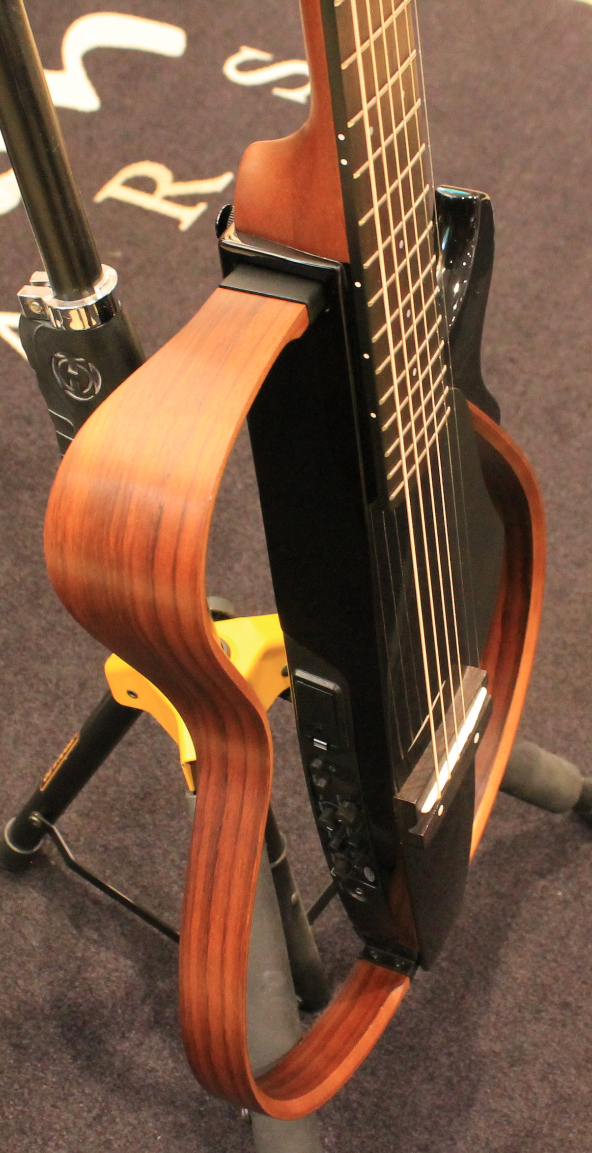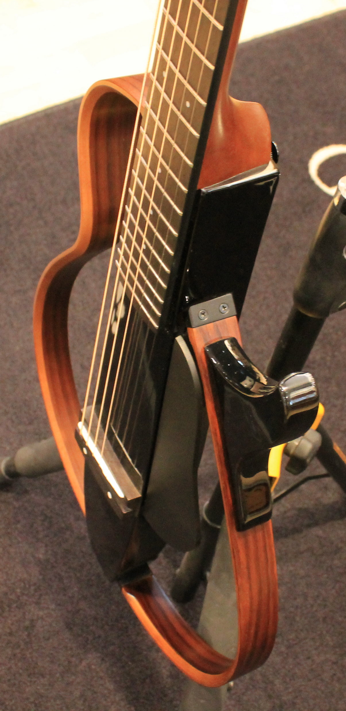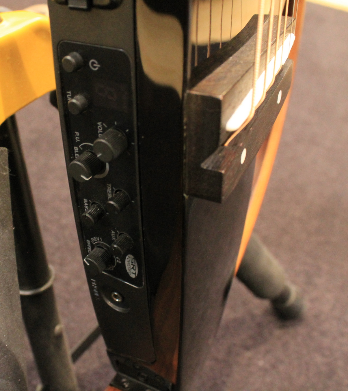 SRT Powered is a new system designed to recreate the resonance of an acoustic guitar body in a body-less guitar. Yamaha developed SRT Powered in collaboration with recording artists to create a system tailored to the unique properties of the new SLG body and modeled on the sounds of a high-end Yamaha acoustic guitar captured using a carefully selected microphone in a professional recording studio environment.