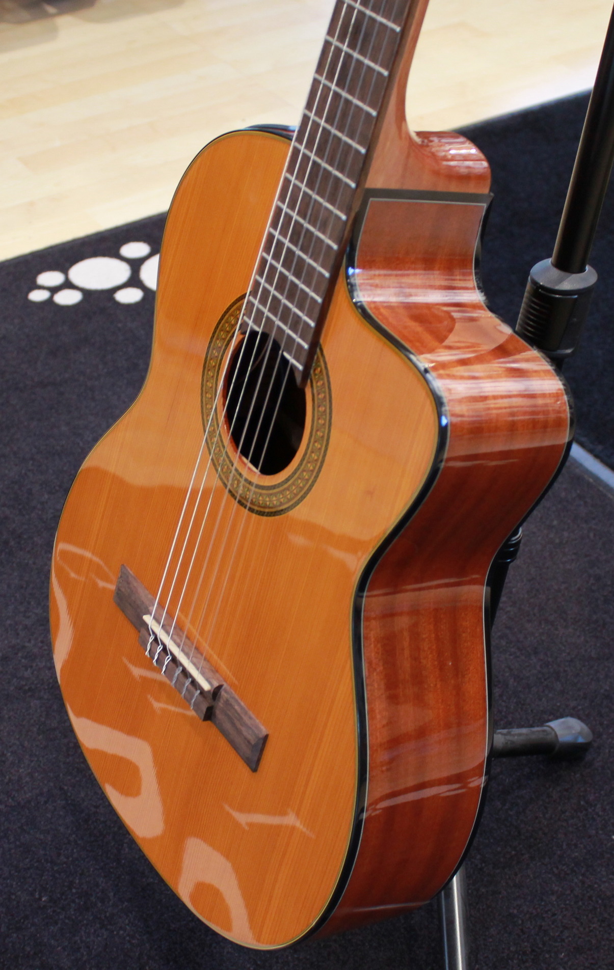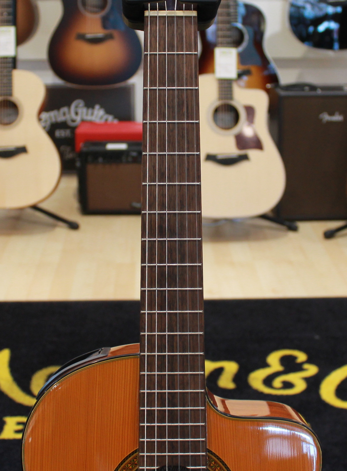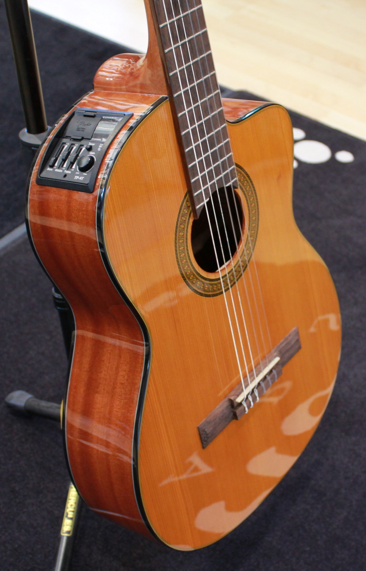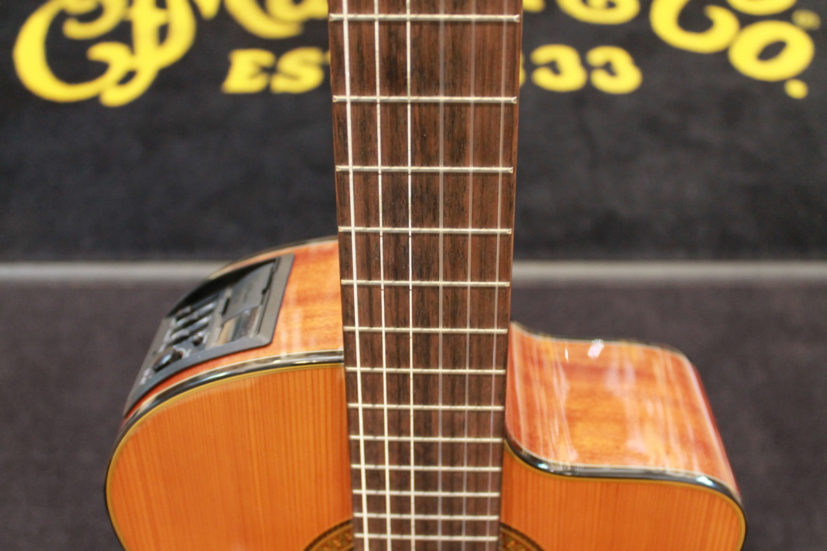 The GC3CE is a stage-worthy electroacoustic classical guitar that features solid-top construction, a soft Venetian-style cutaway, and superior-sounding Takamine electronics.