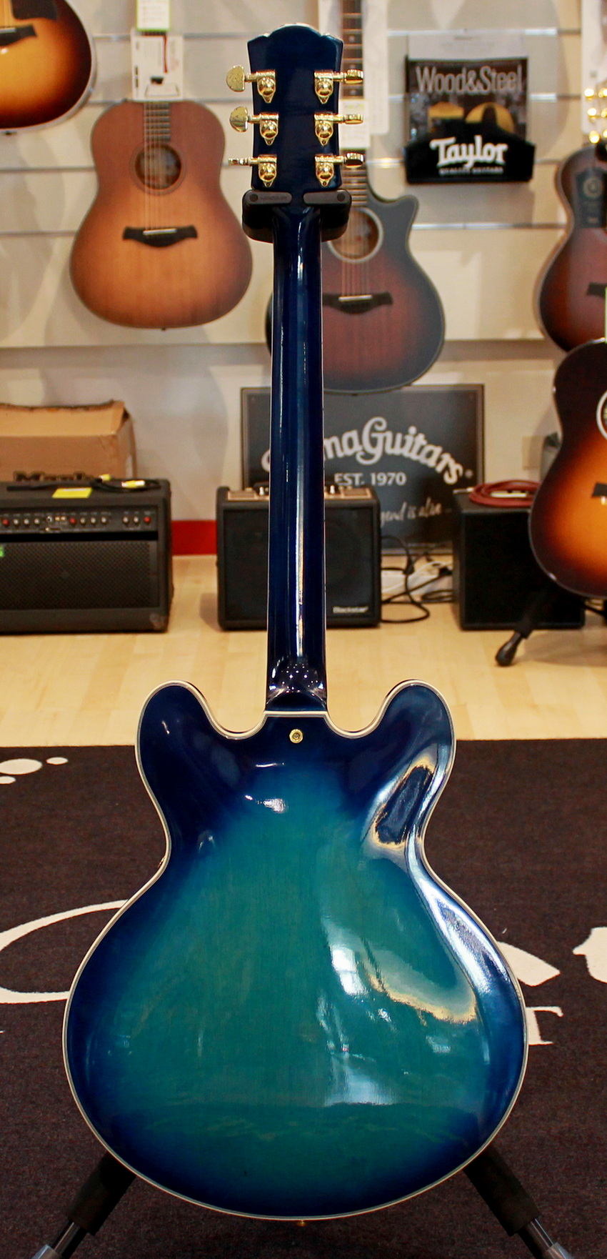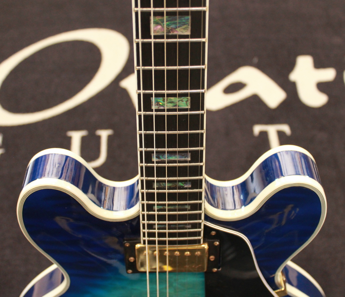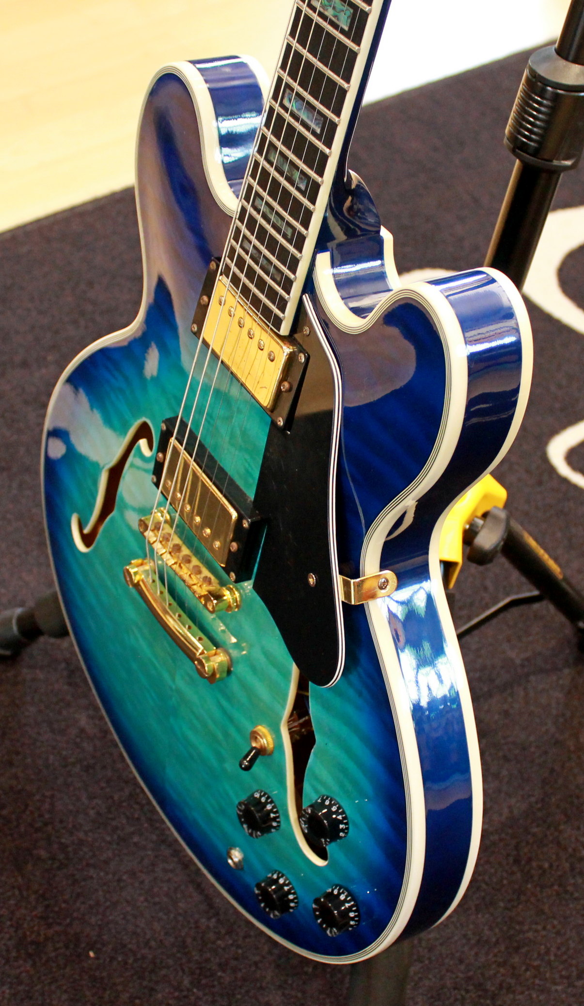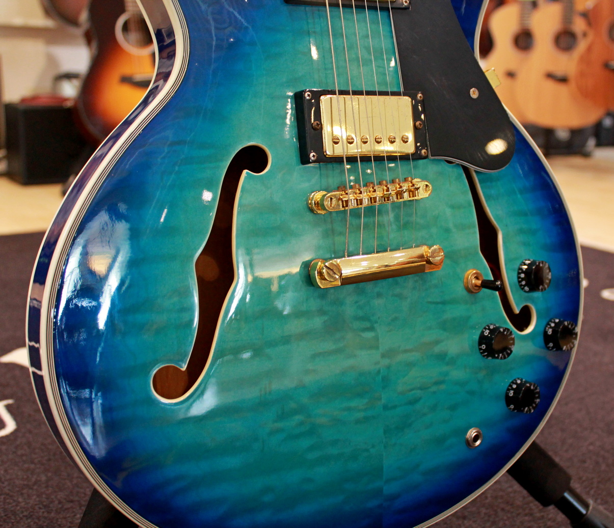 Semi-hollow electric guitar, 2 x humbuker, 2 x tone control, 2 x volume control, 3-way switch, gold hardware