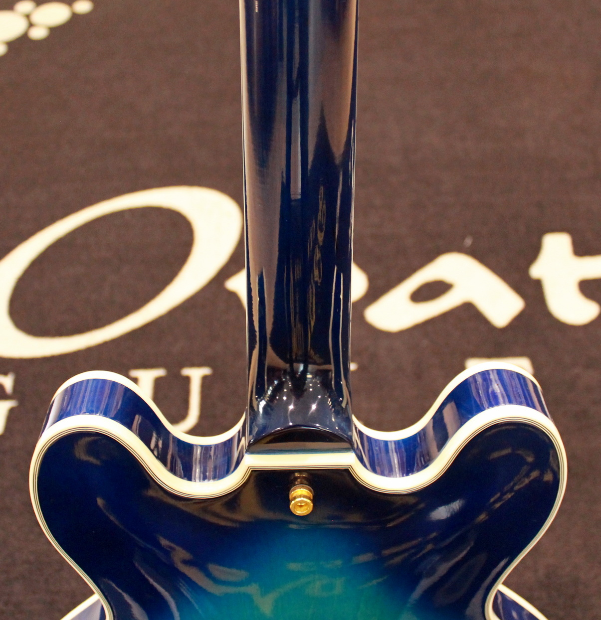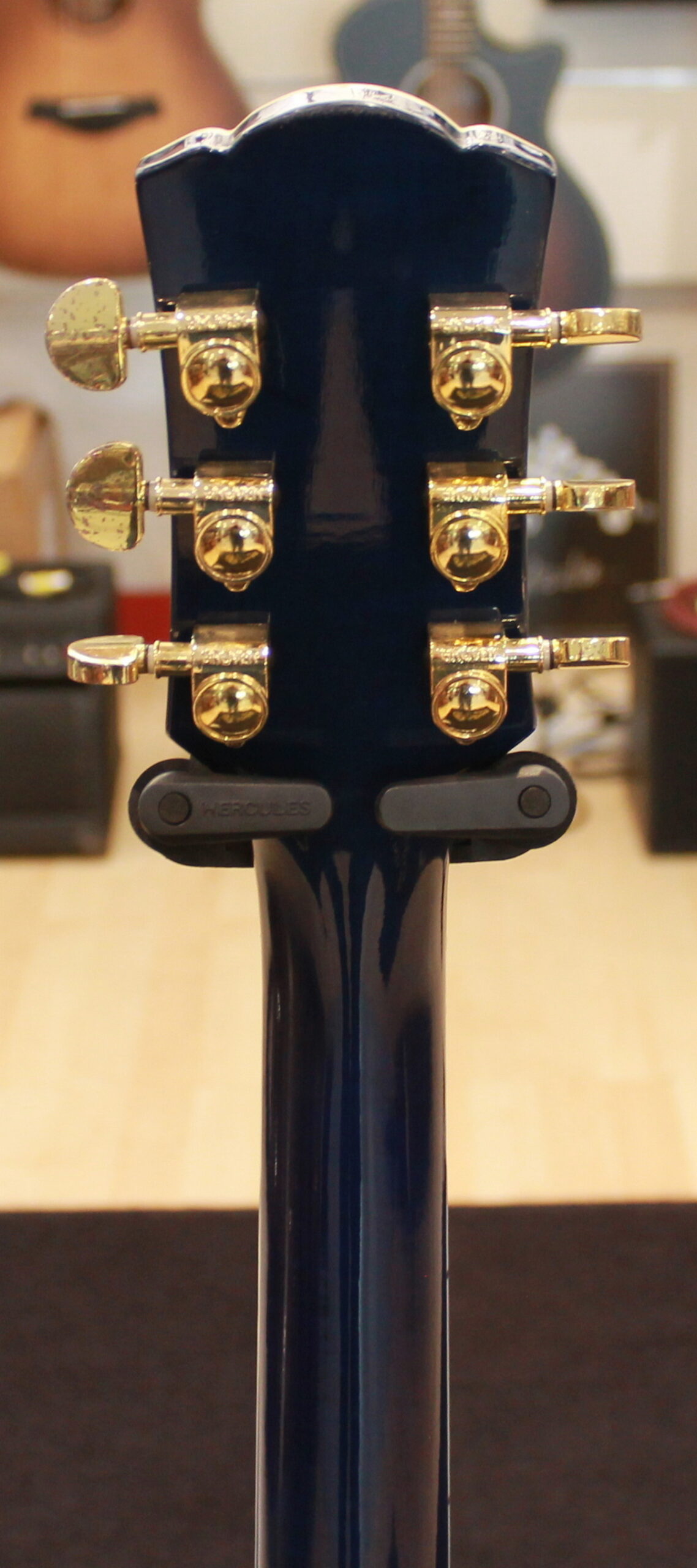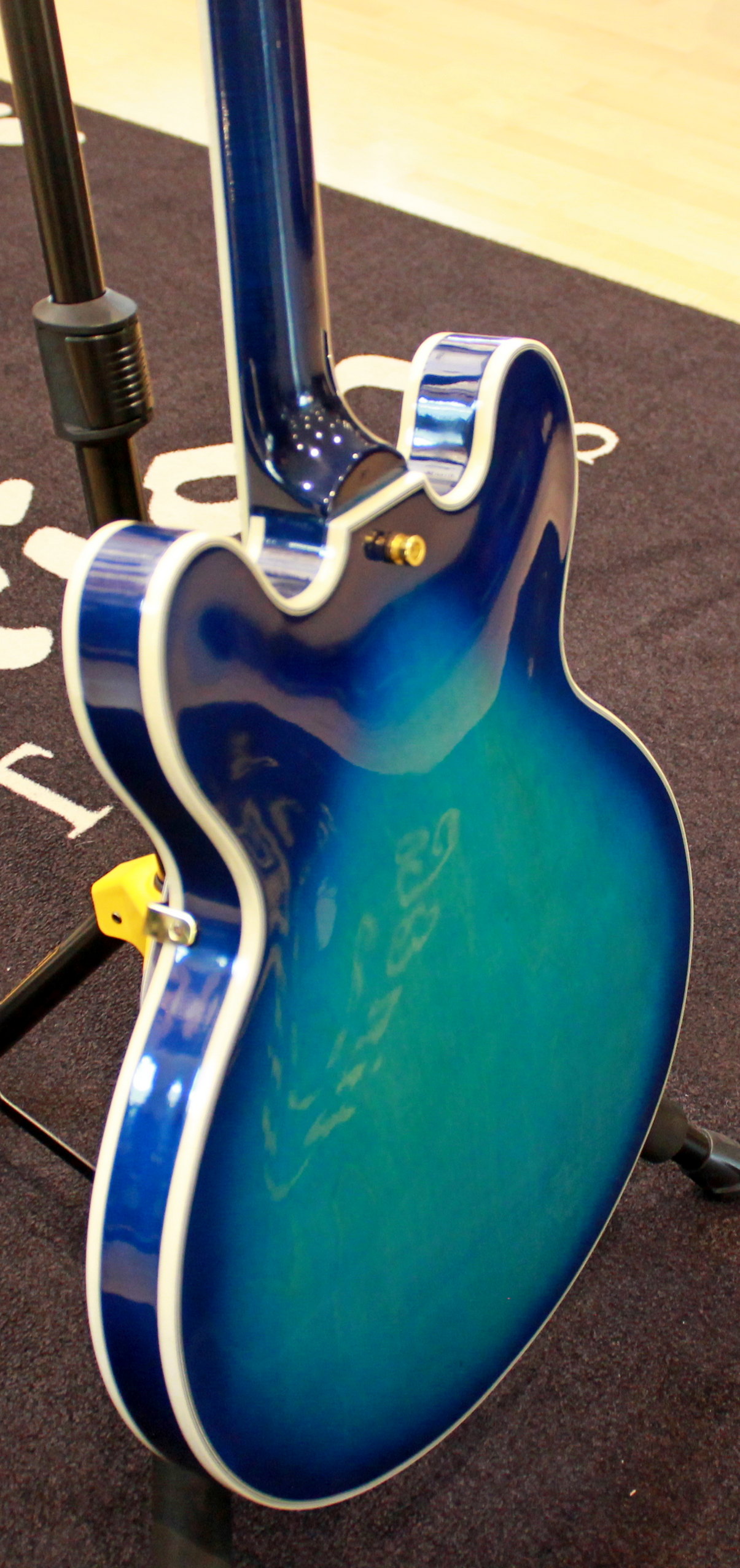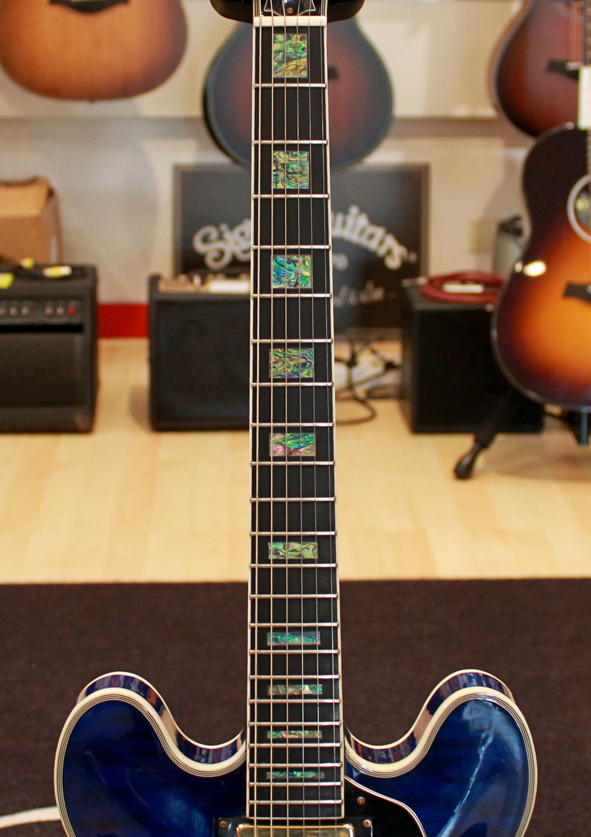 Semi-hollow electric guitar, 2 x humbuker, 2 x tone control, 2 x volume control, 3-way switch, gold hardware