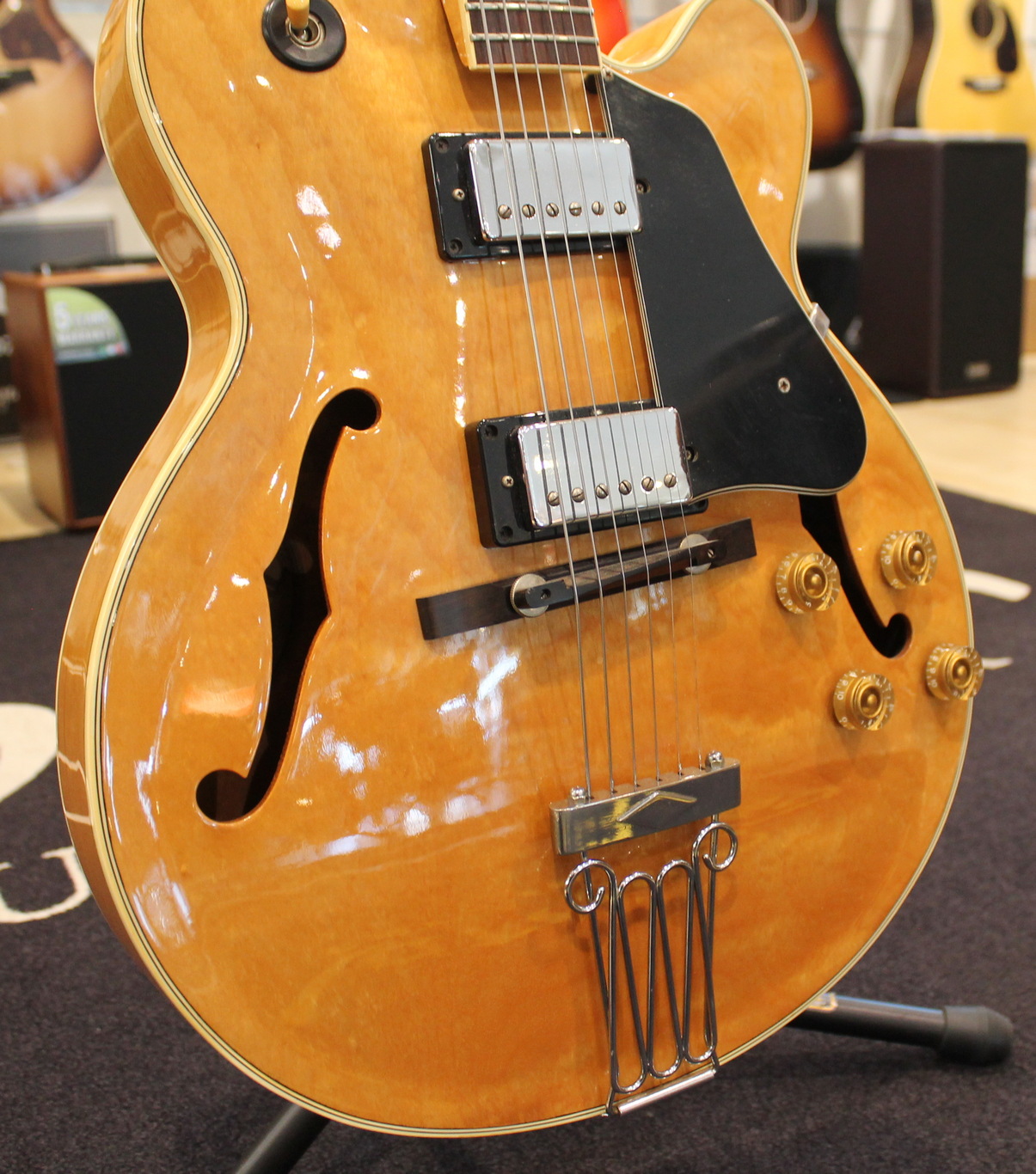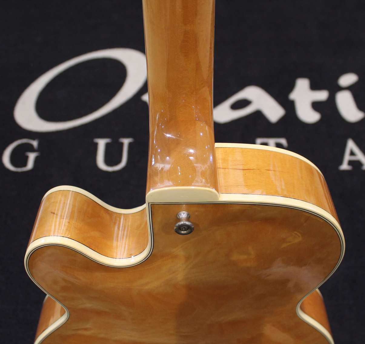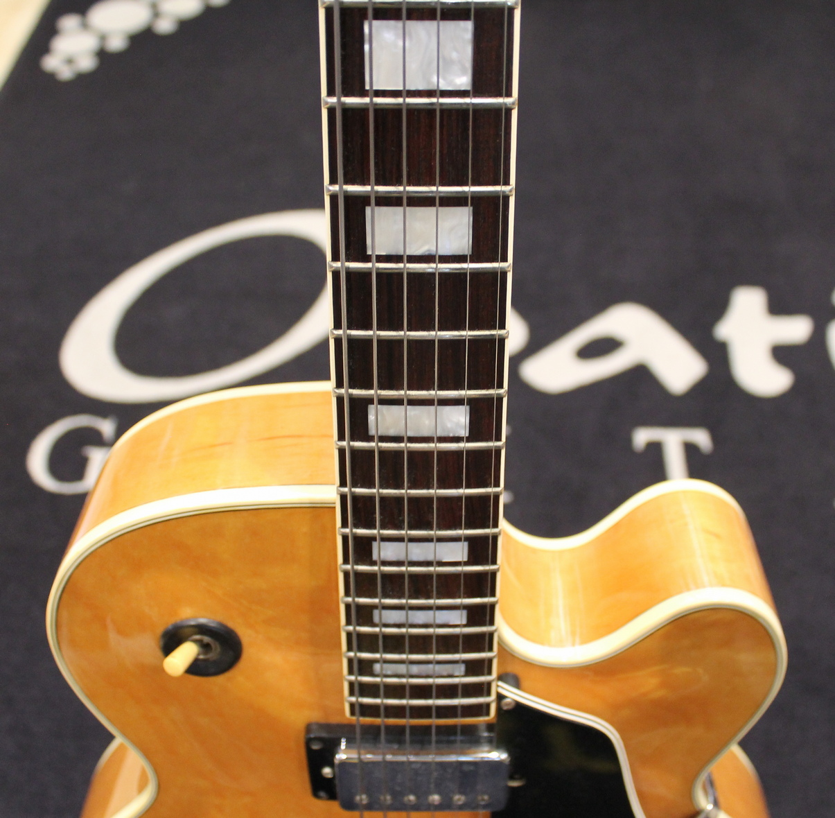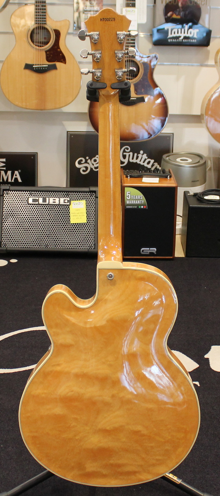 The FG100 features a full-sized, full-hollow, single Venetian cutaway body design with an arched, laminated maple top with ƒ holes and ivory multi-binding on maple sides and arched back mated to a set-in maple neck with a 20-fret rosewood fingerboard with ivory binding and pearl block position markers. Components include a pair of Ibanez Super 58 Z humbucking pickups with chrome covers and individual volume and tone controls, black plastic pickup rings, a rosewood bridge with rosewood saddle, a custom trapeze tailpiece, a bone nut, black pickguard, Sure Grip knobs, and Smooth Tuner machine heads.