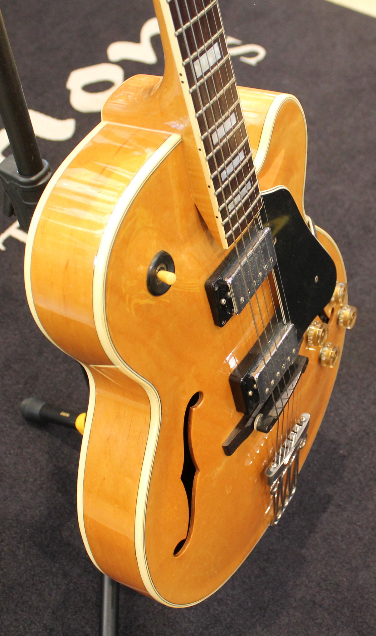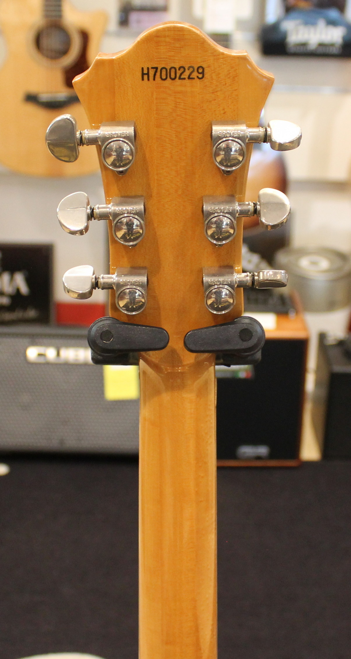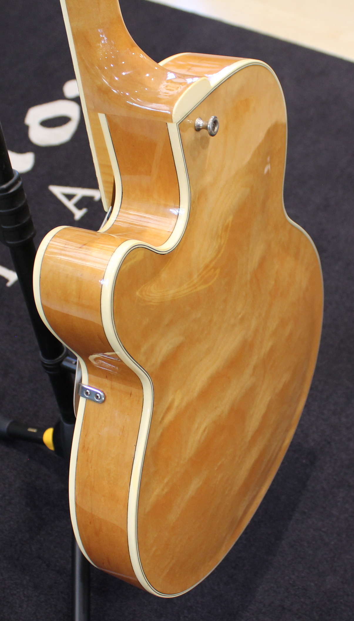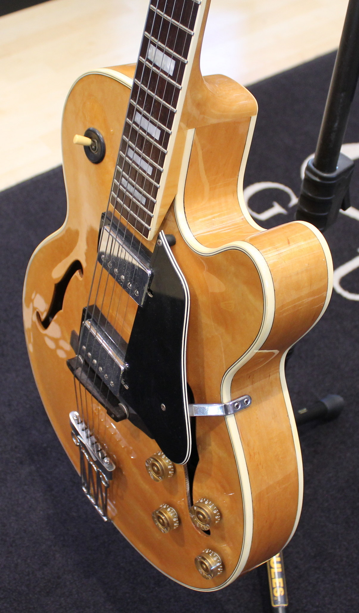 The FG100 features a full-sized, full-hollow, single Venetian cutaway body design with an arched, laminated maple top with ƒ holes and ivory multi-binding on maple sides and arched back mated to a set-in maple neck with a 20-fret rosewood fingerboard with ivory binding and pearl block position markers. Components include a pair of Ibanez Super 58 Z humbucking pickups with chrome covers and individual volume and tone controls, black plastic pickup rings, a rosewood bridge with rosewood saddle, a custom trapeze tailpiece, a bone nut, black pickguard, Sure Grip knobs, and Smooth Tuner machine heads.
