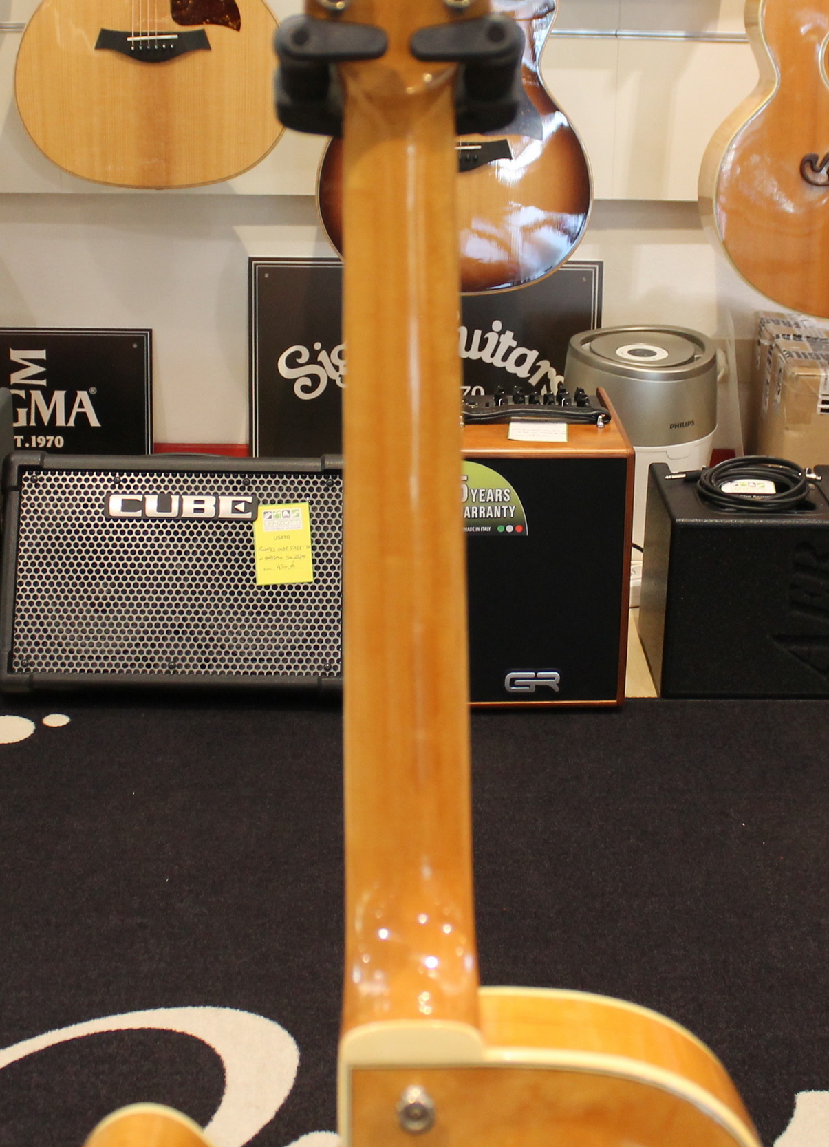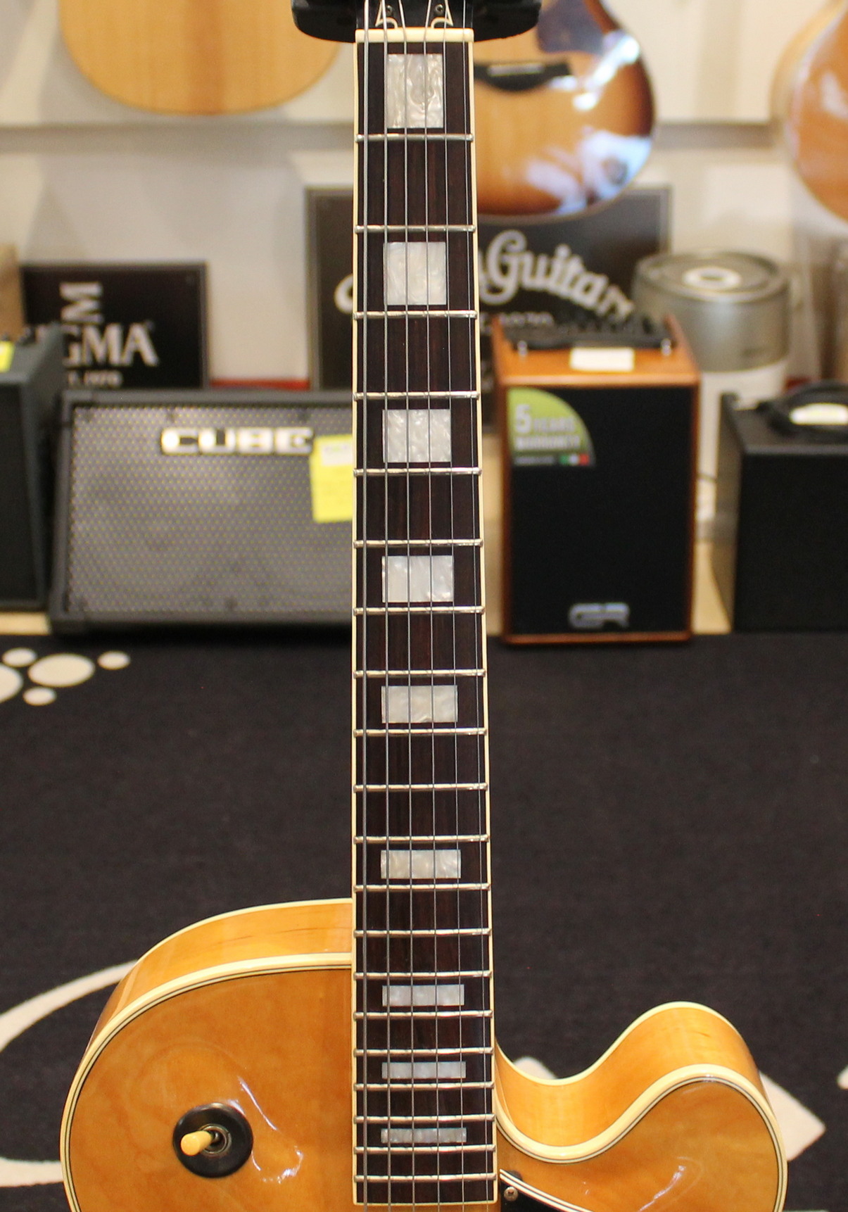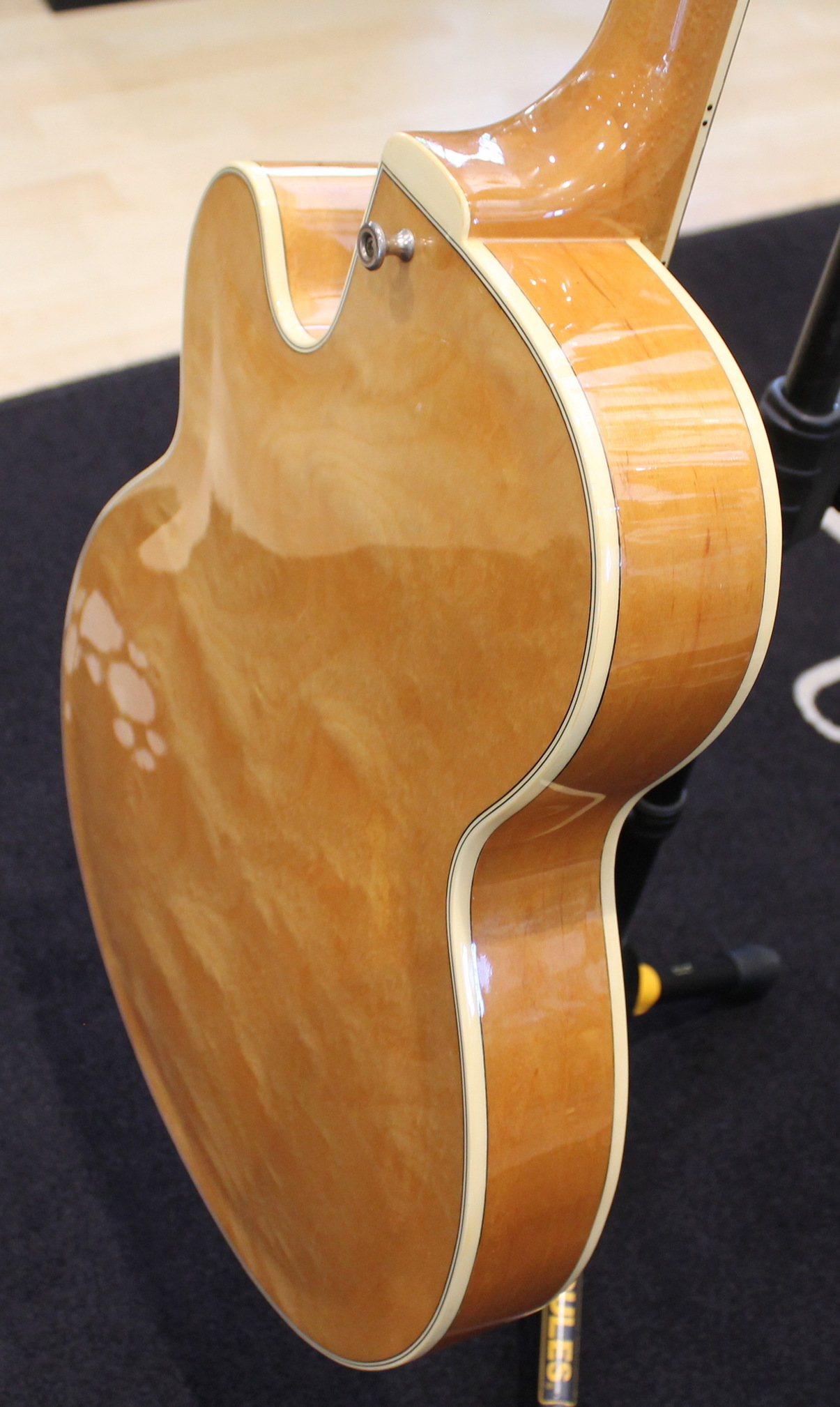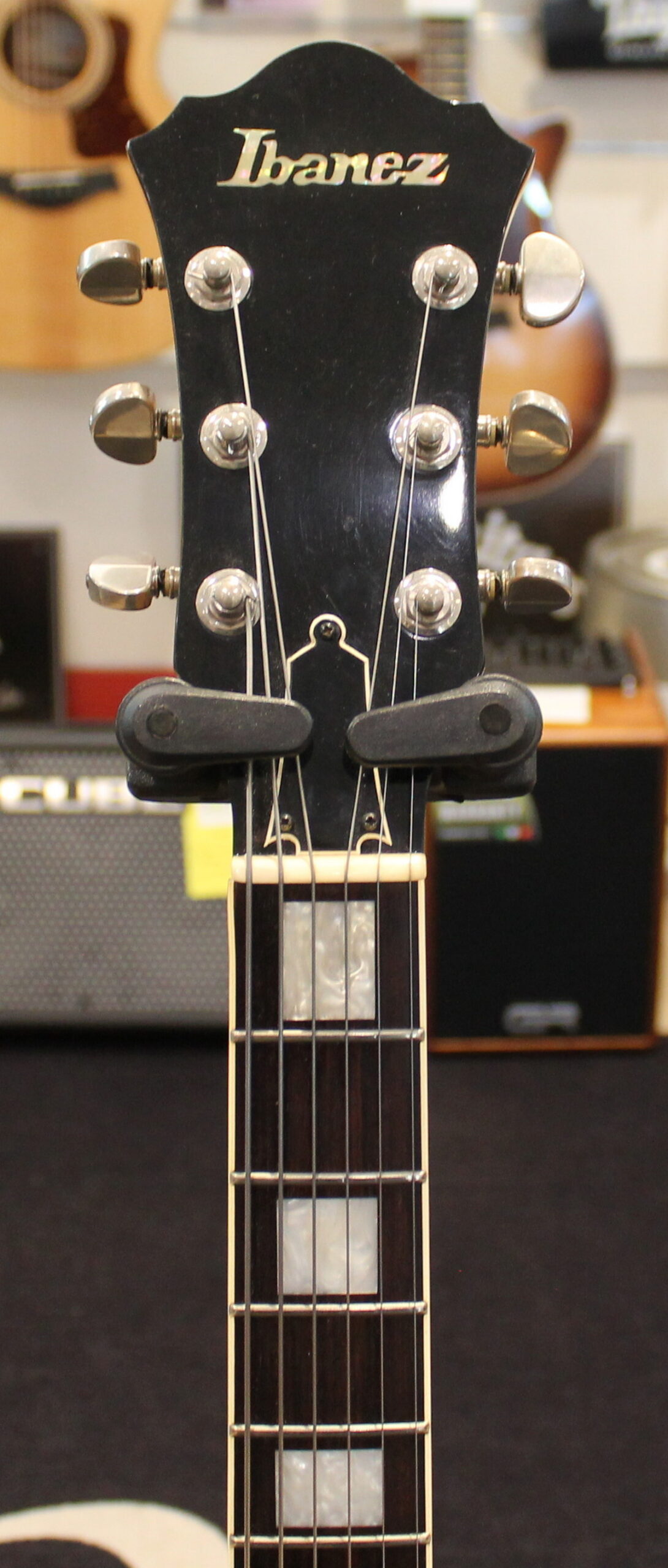 The FG100 features a full-sized, full-hollow, single Venetian cutaway body design with an arched, laminated maple top with ƒ holes and ivory multi-binding on maple sides and arched back mated to a set-in maple neck with a 20-fret rosewood fingerboard with ivory binding and pearl block position markers. Components include a pair of Ibanez Super 58 Z humbucking pickups with chrome covers and individual volume and tone controls, black plastic pickup rings, a rosewood bridge with rosewood saddle, a custom trapeze tailpiece, a bone nut, black pickguard, Sure Grip knobs, and Smooth Tuner machine heads.