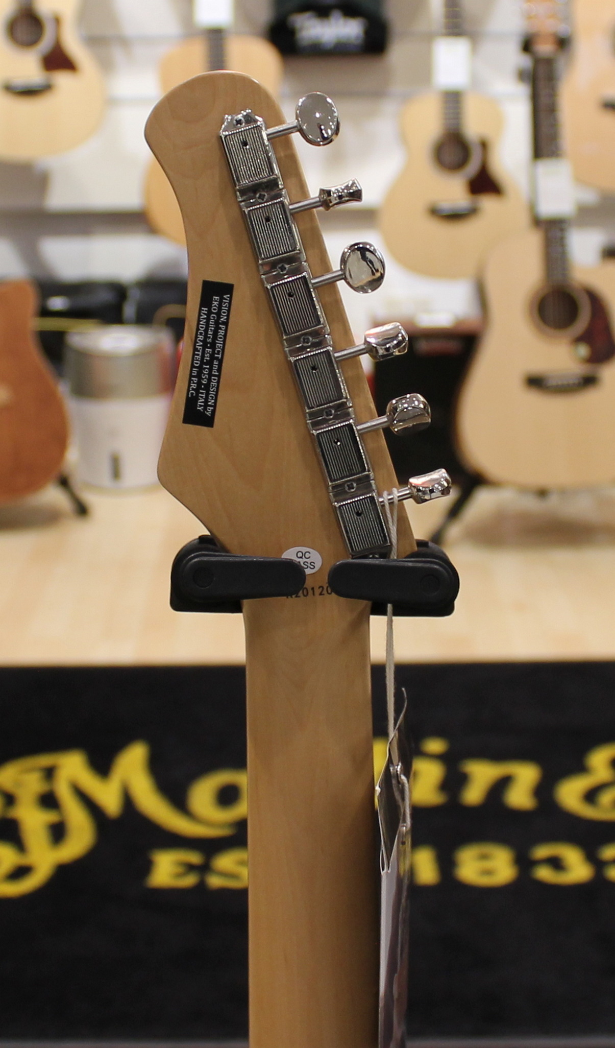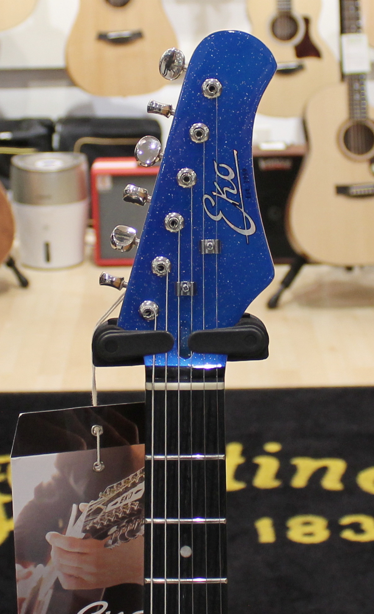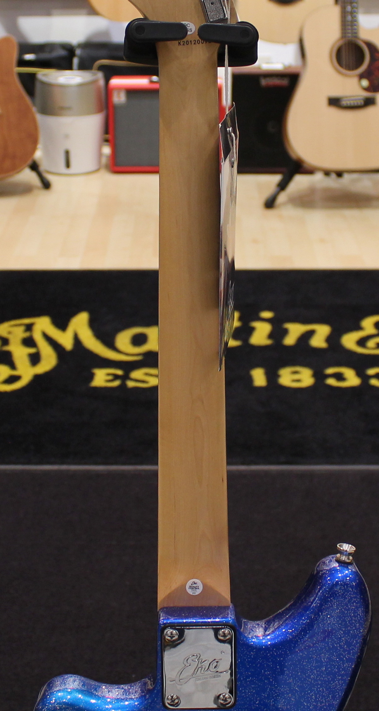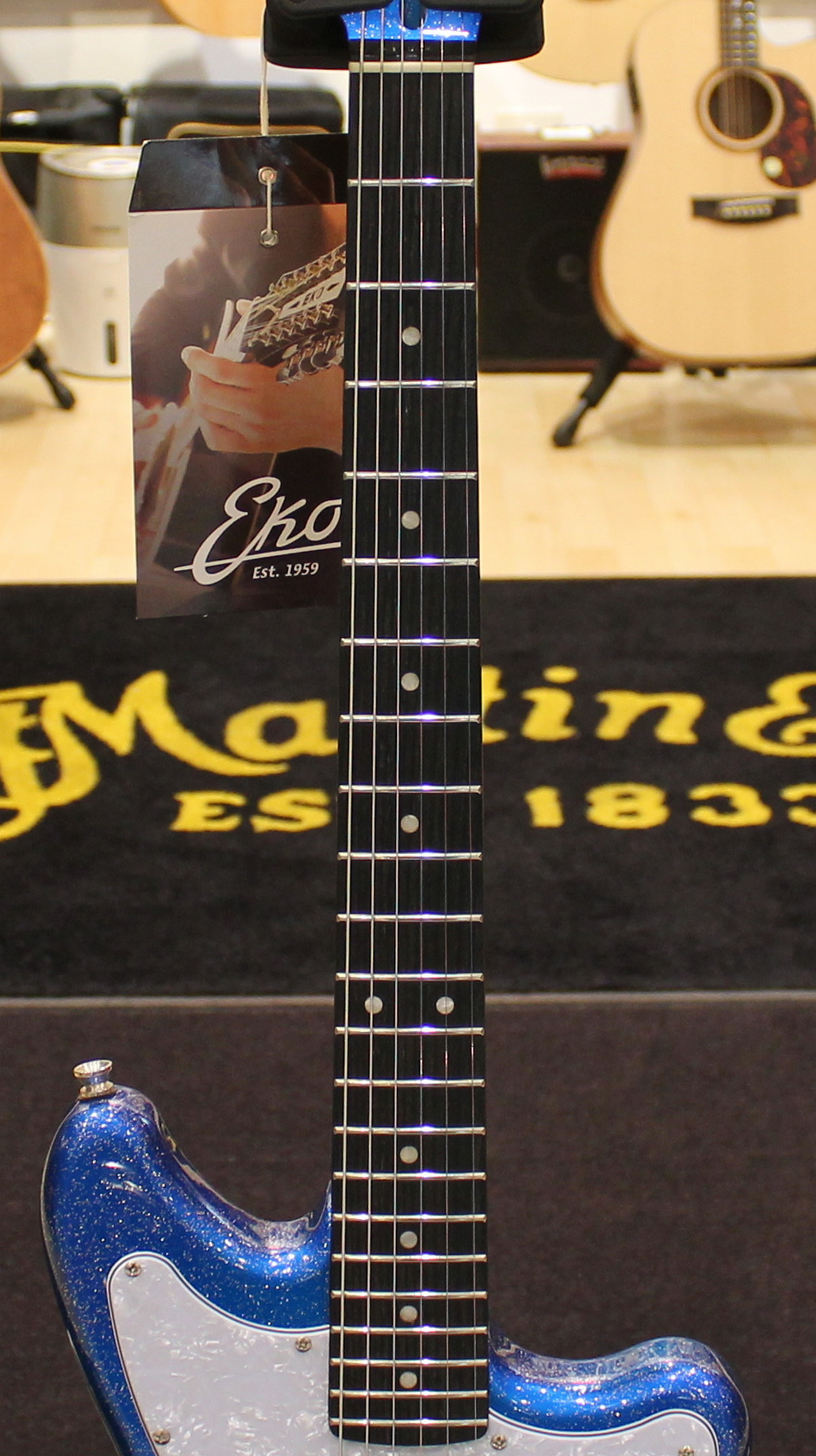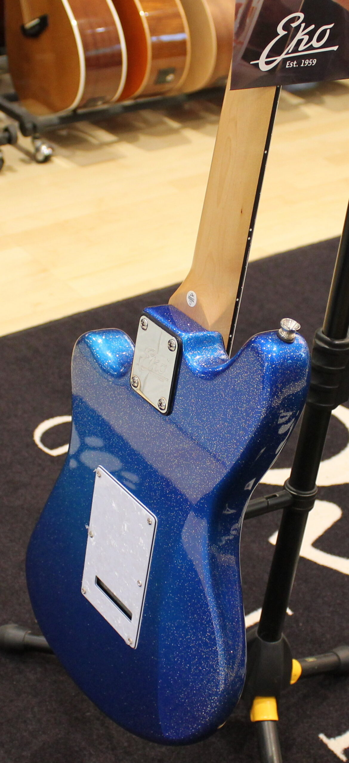 The Camaro VR 2-90 electric guitar by Eko Guitars in the Blue Sparkle coloration stands out for the configuration of the P-90 pickups that can be managed with the three-way selector and for the headstock that matches the sparkling blue shade of the body. The modern Camaro by Eko Guitars, inspired by the historical ’70s model, comes in all available colors, with poplar body, a wood appreciated for its lightness, maple neck and South American Roupana fingerboard. In the Cream and Blue Sparkle models, the two P-90 pickups and the headstock matched to the body, give the Camaro a credible look with a Seventies scent.