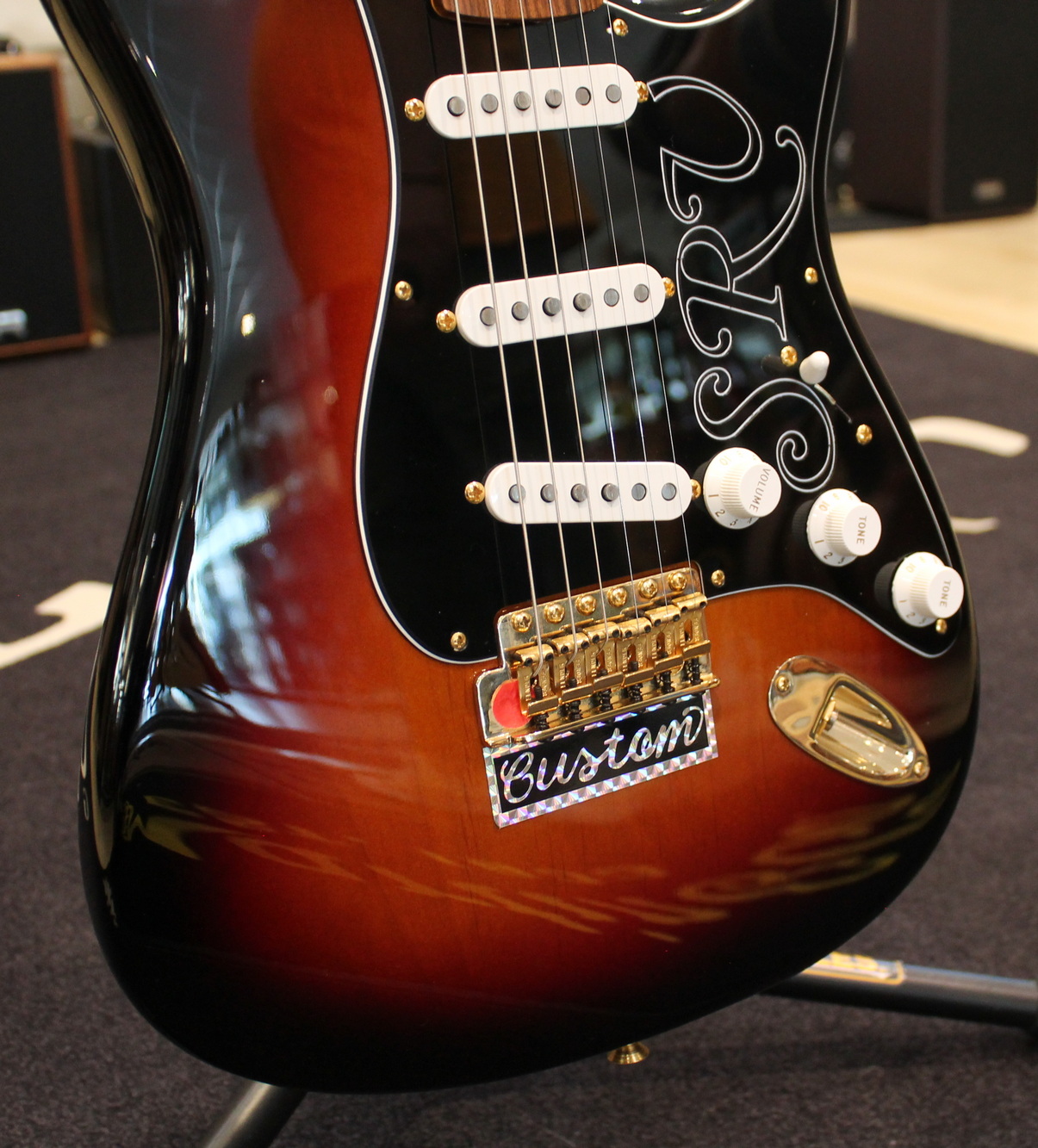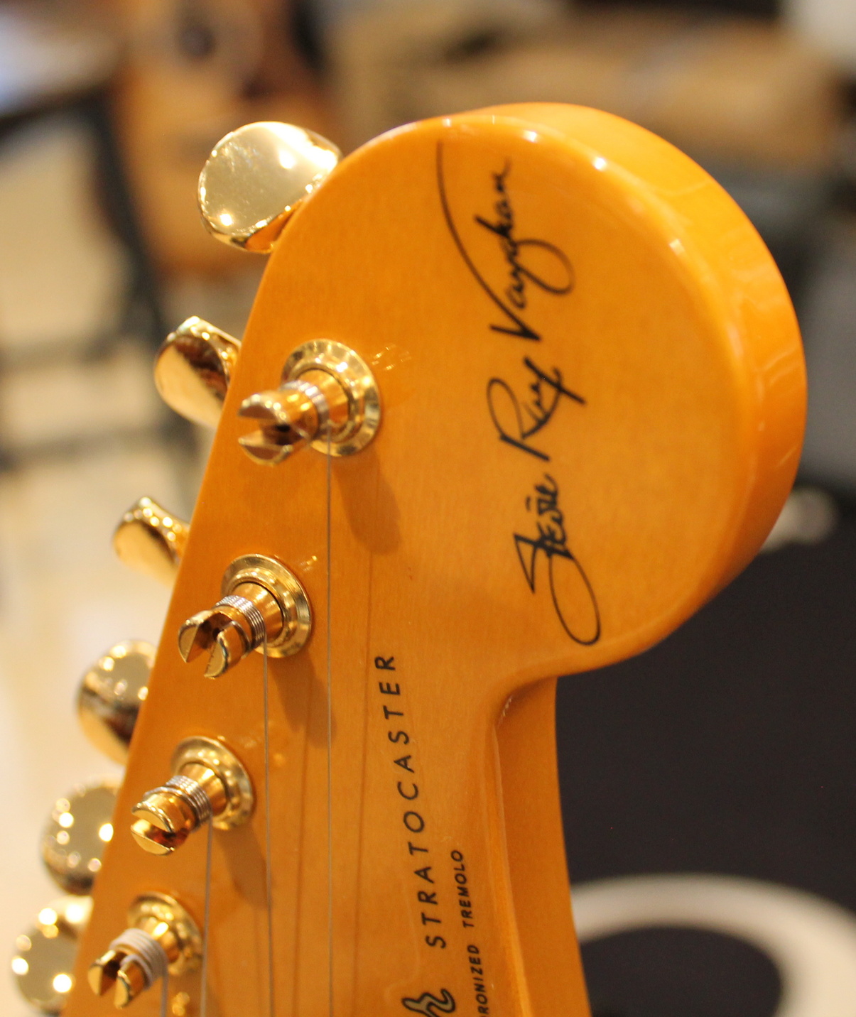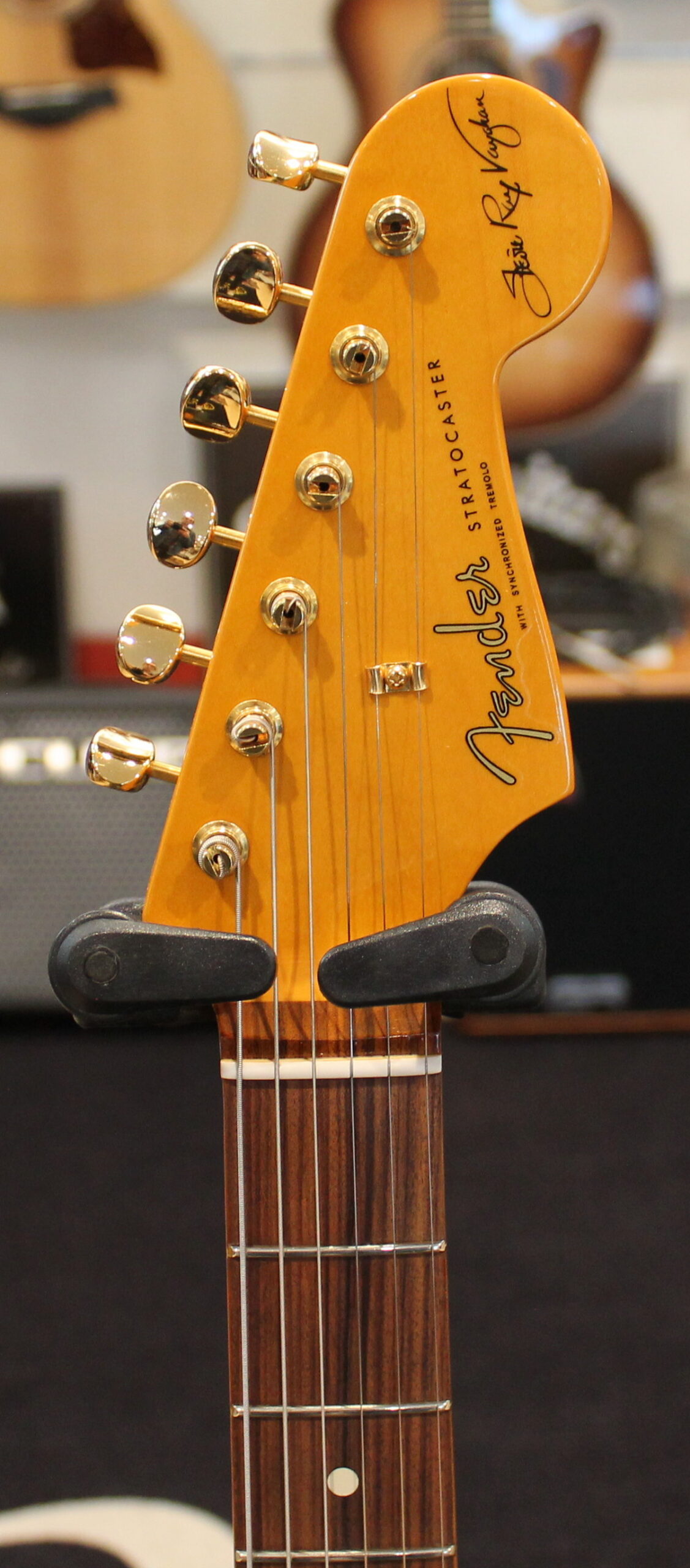 The Stevie Ray Vaughan Stratocaster, born from the guitarist’s collaboration with Fender, features a neck with an “oval” profile typical of the early 1960s, a pau ferro fingerboard with jumbo frets, three Fender Texas Special single-coil pickups, gold hardware, a tremolo bridge with a reverse-mounted lever, and “SRV” screen printing on the pickguard.