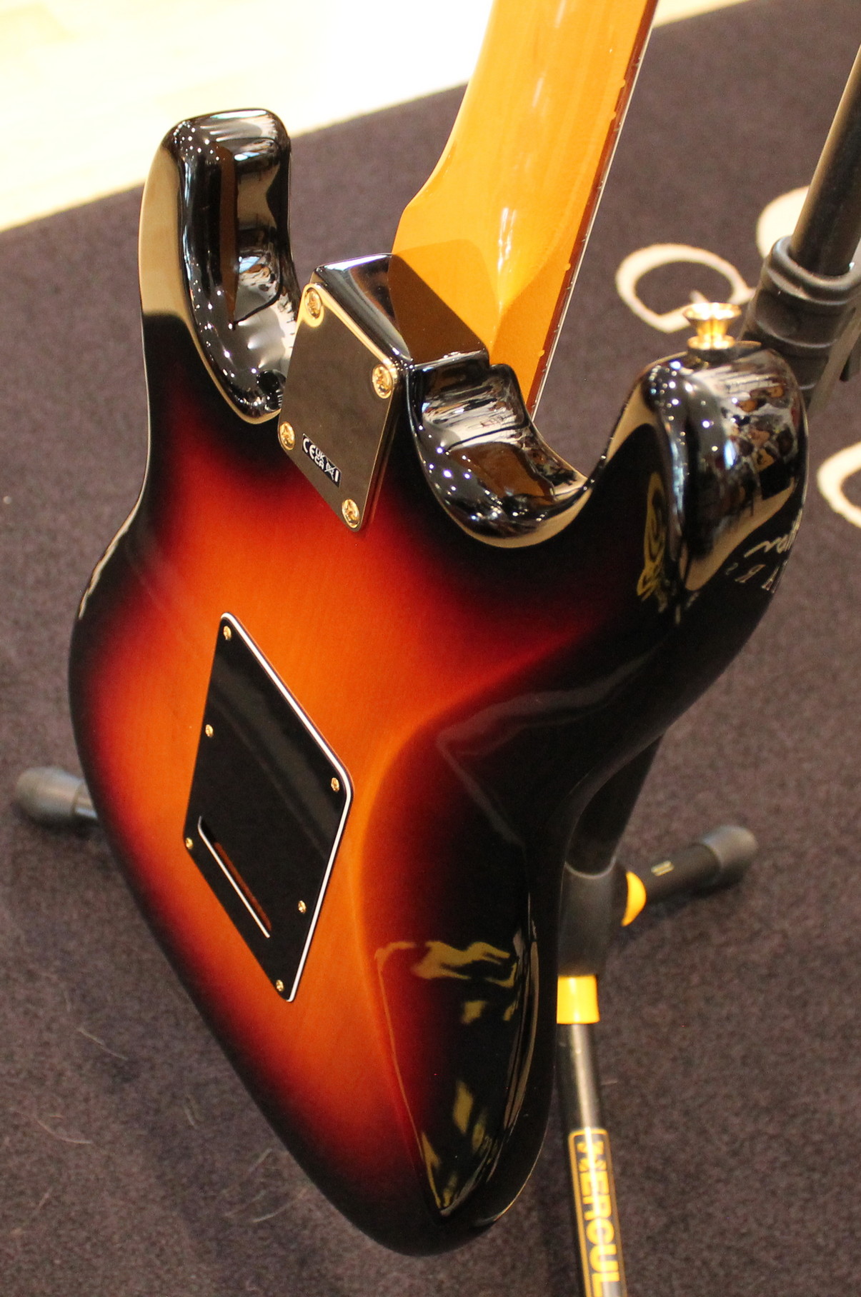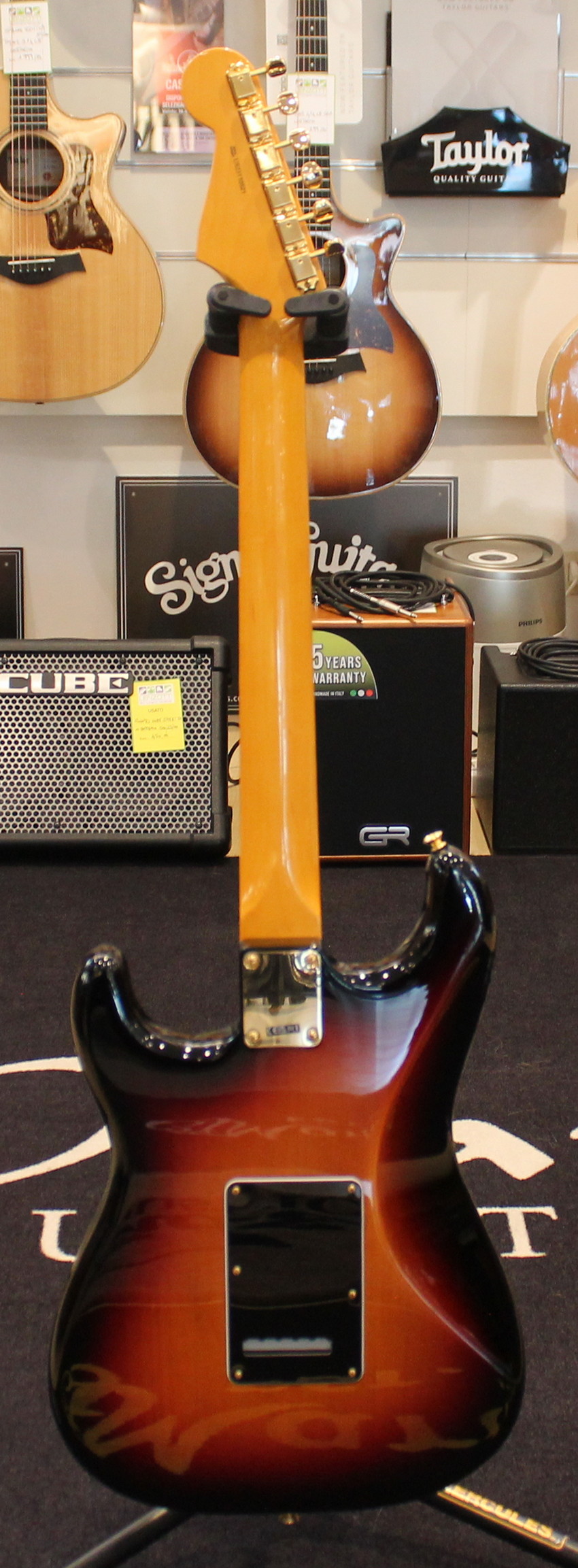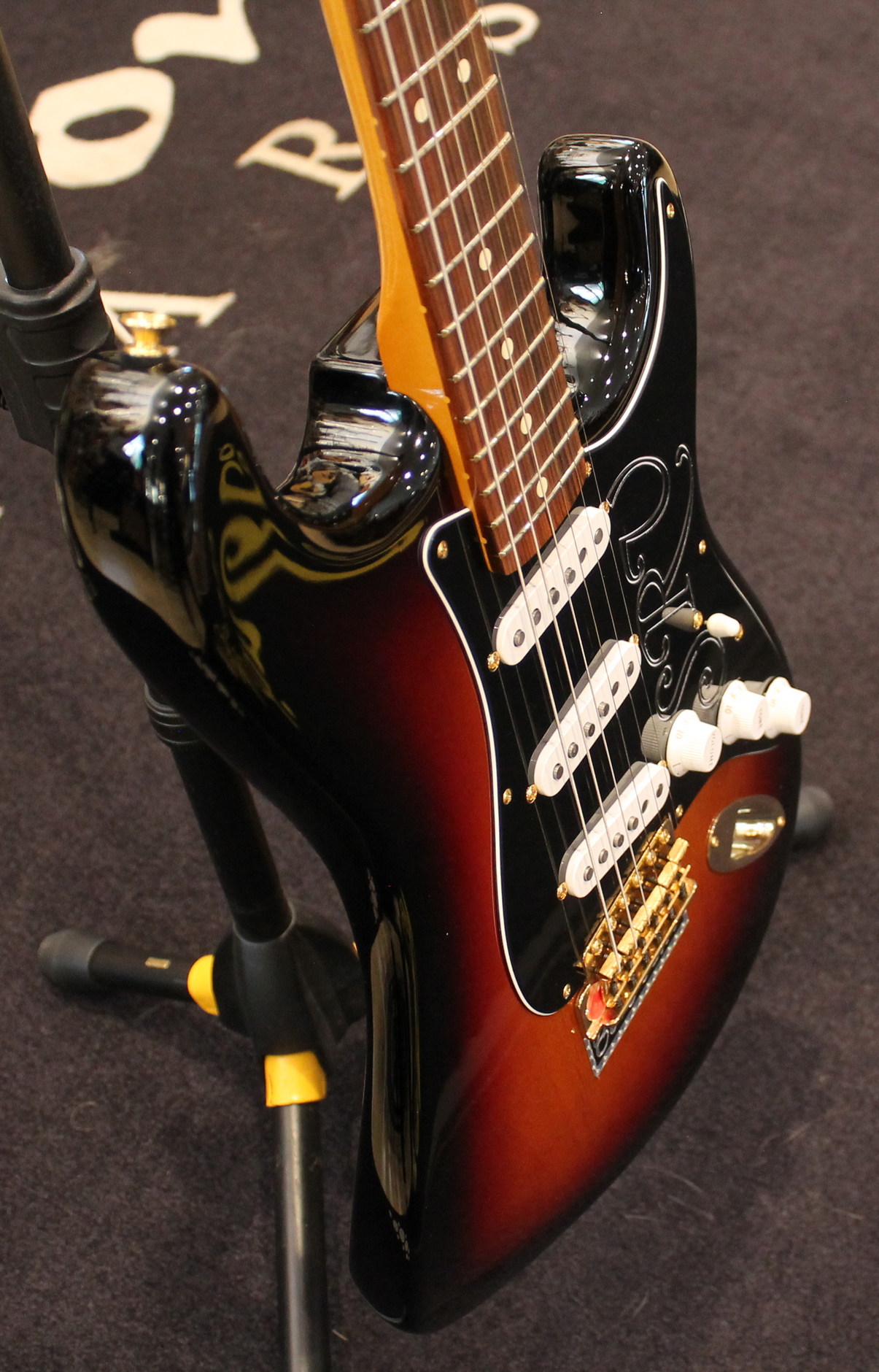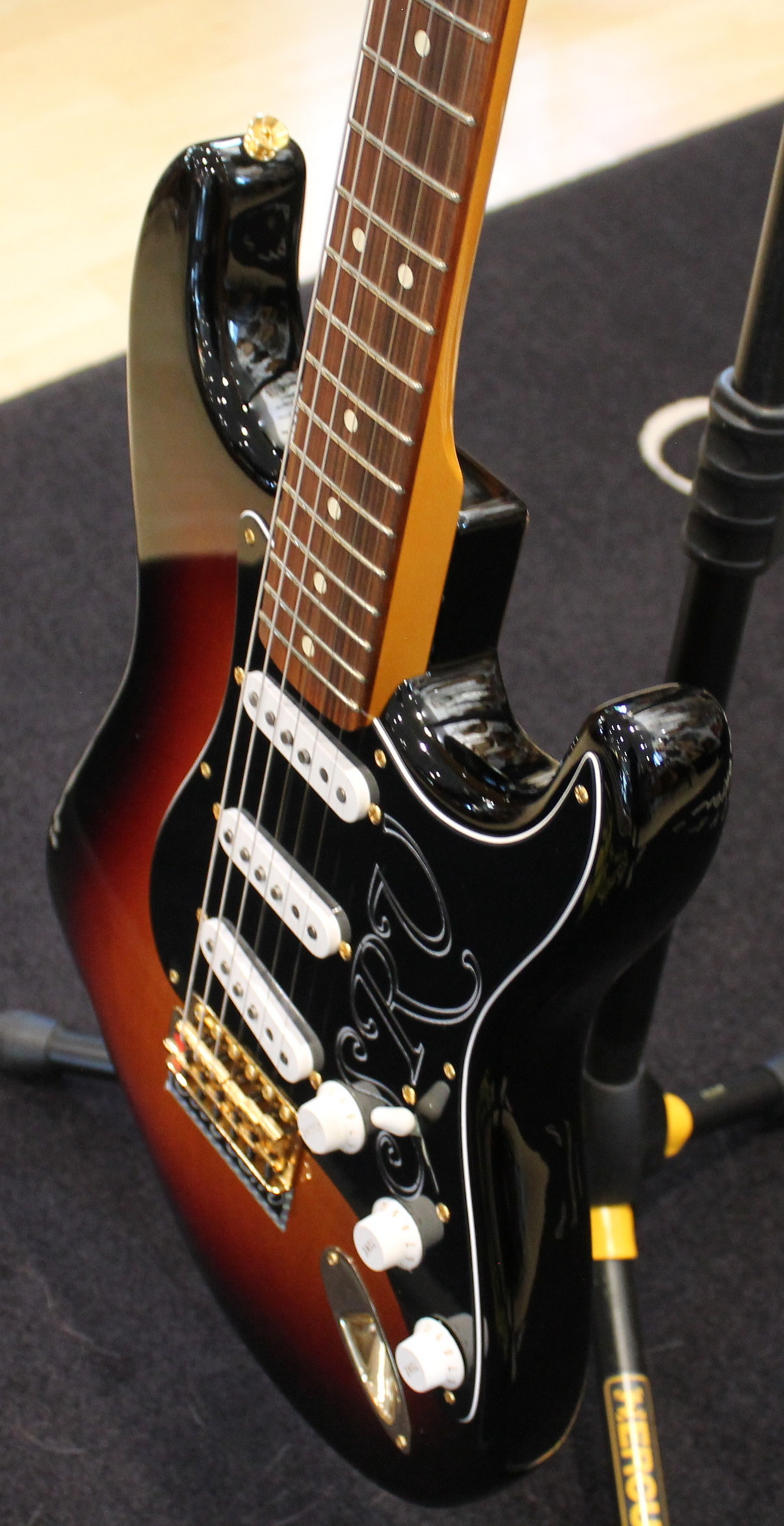 The Stevie Ray Vaughan Stratocaster, born from the guitarist’s collaboration with Fender, features a neck with an “oval” profile typical of the early 1960s, a pau ferro fingerboard with jumbo frets, three Fender Texas Special single-coil pickups, gold hardware, a tremolo bridge with a reverse-mounted lever, and “SRV” screen printing on the pickguard.