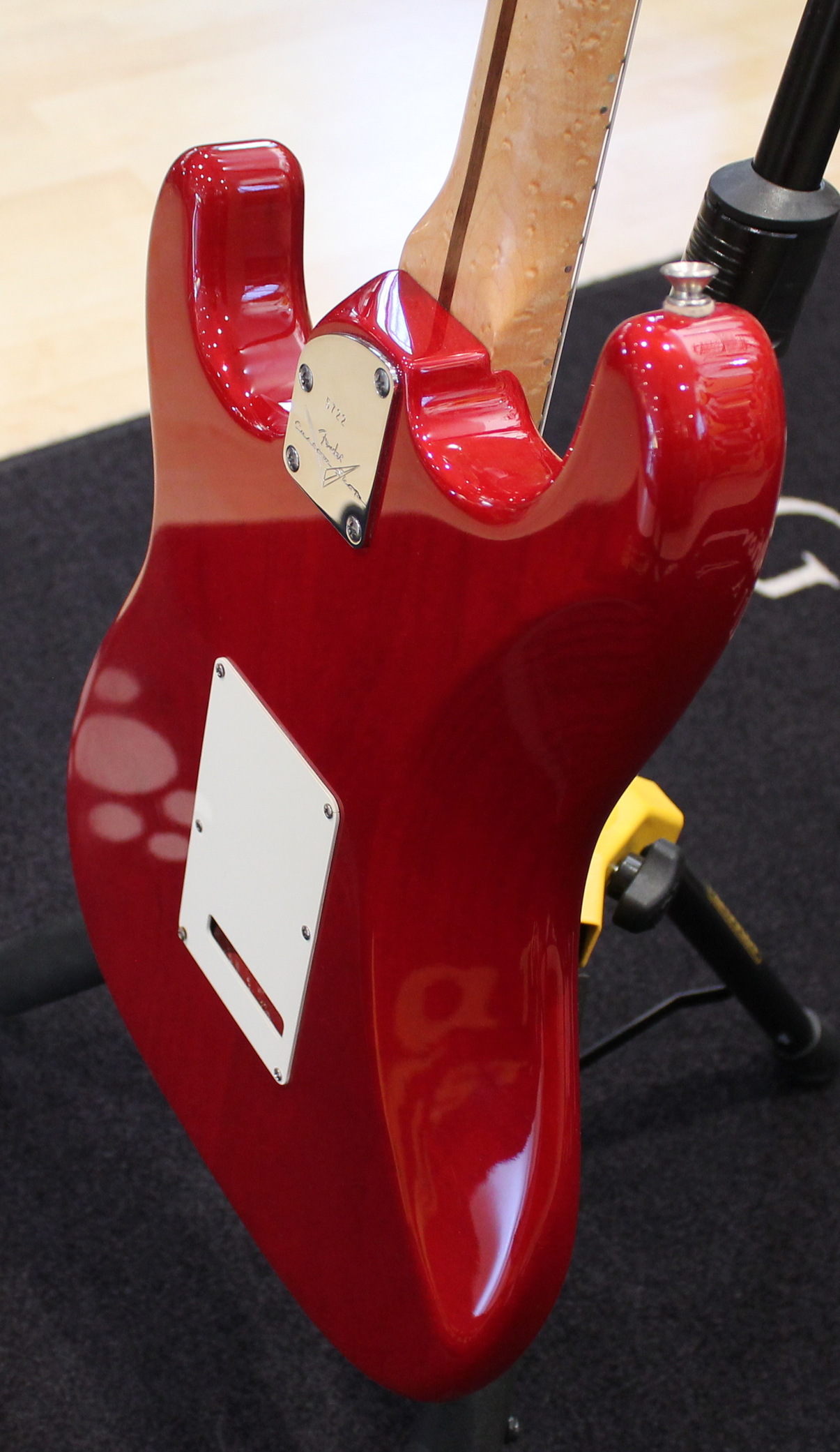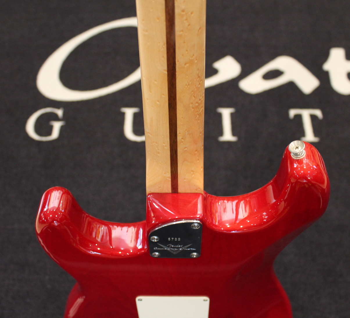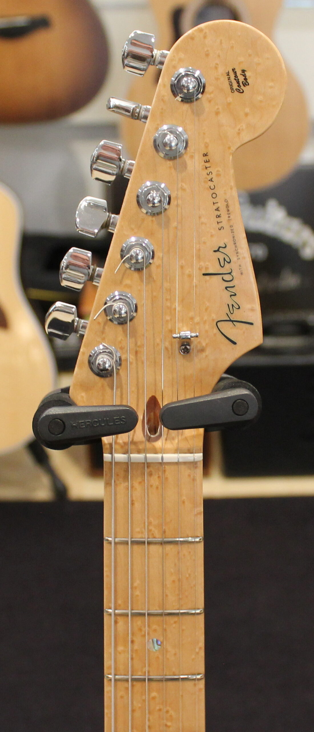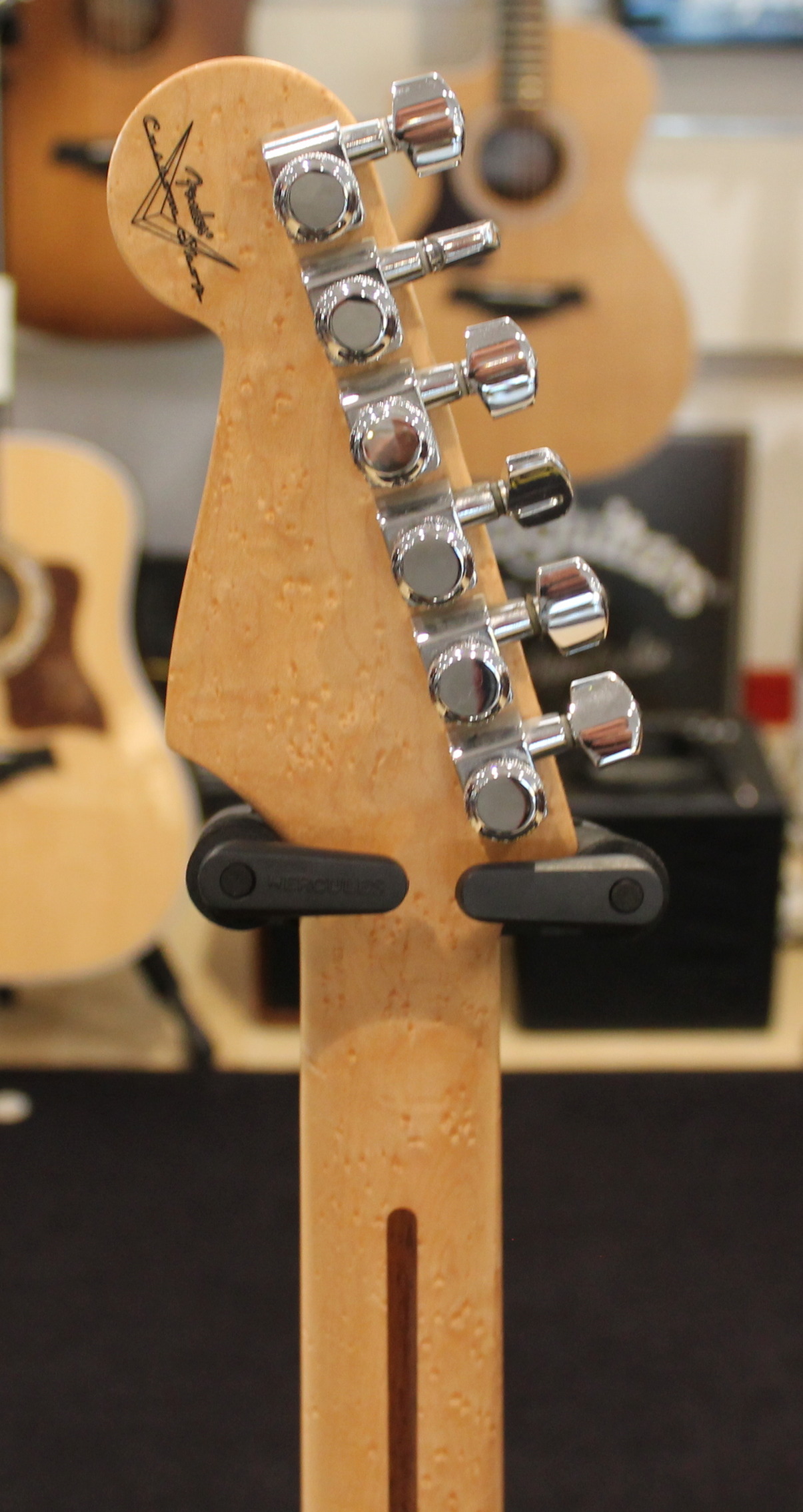 Alder body, large “C” AA birdseye maple neck, maple fingerboard, abalone dot inlays, Access neck heel, synchronized tremolo bridge, Master Built Custom pickups, Fender/Schaller tuners, Urethane finish, parchment pickguard and knobs, 5-way switchblade selector, Custom Shop hardcase, COA, Made in USA by Fender Custom Shop