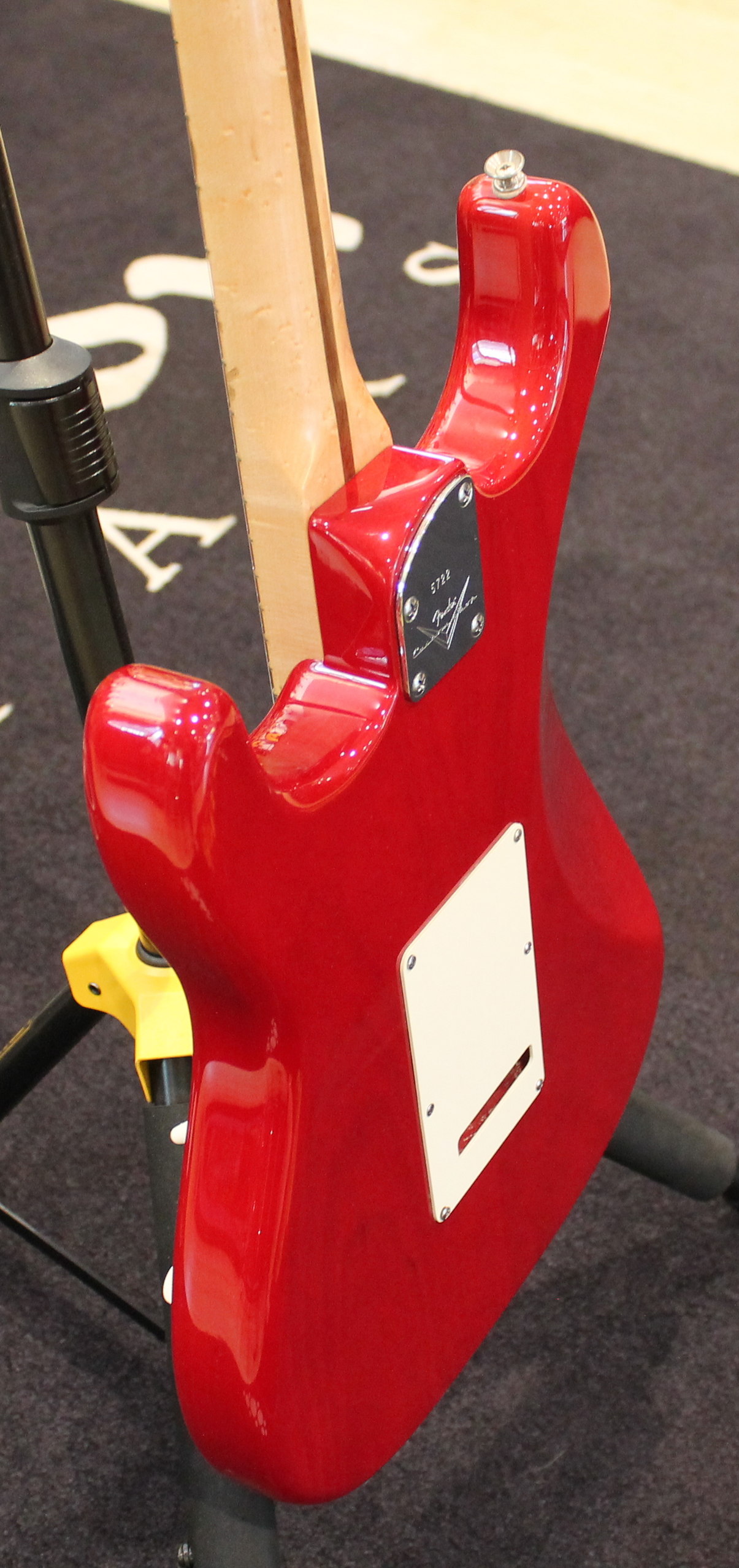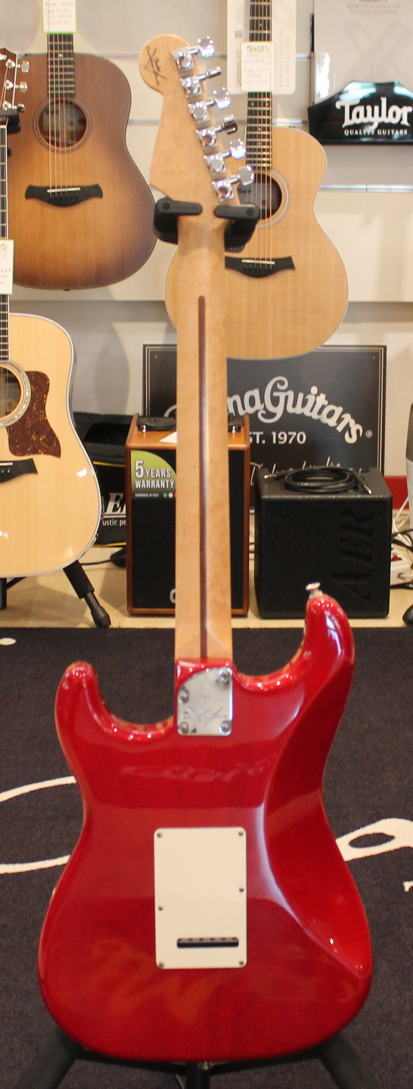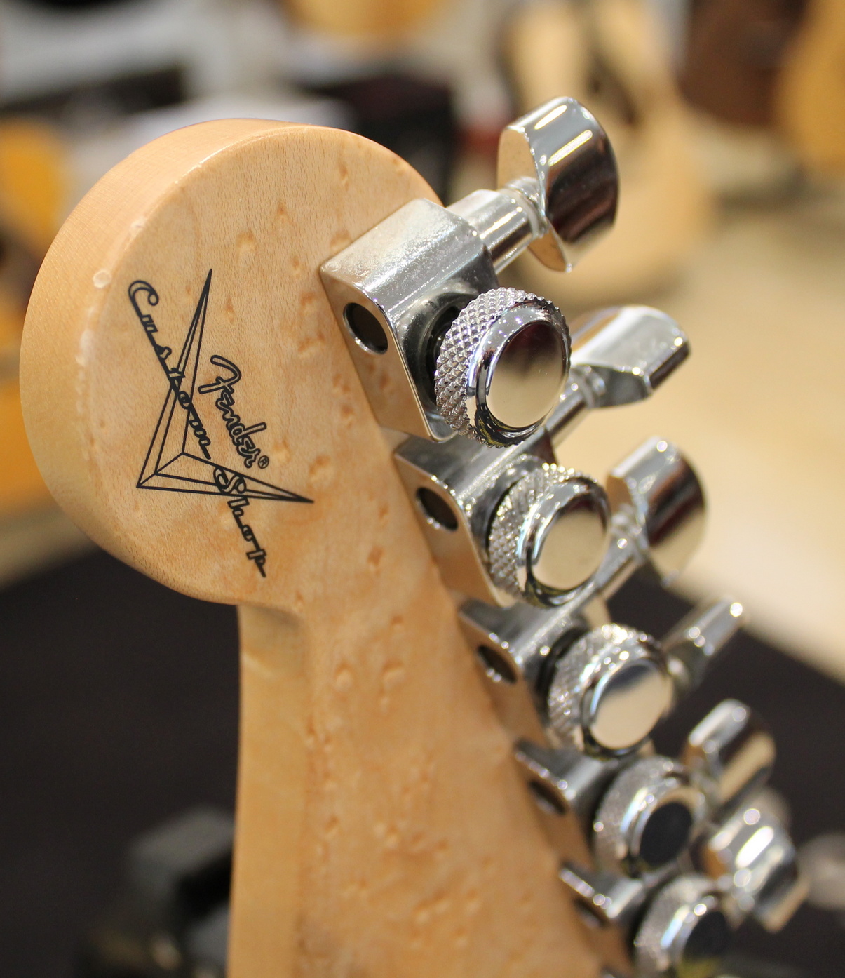 Alder body, large “C” AA birdseye maple neck, maple fingerboard, abalone dot inlays, Access neck heel, synchronized tremolo bridge, Master Built Custom pickups, Fender/Schaller tuners, Urethane finish, parchment pickguard and knobs, 5-way switchblade selector, Custom Shop hardcase, COA, Made in USA by Fender Custom Shop
