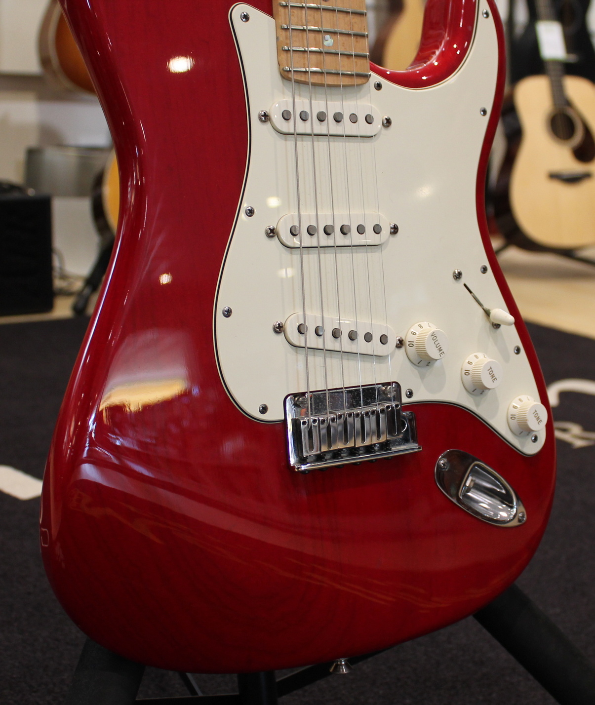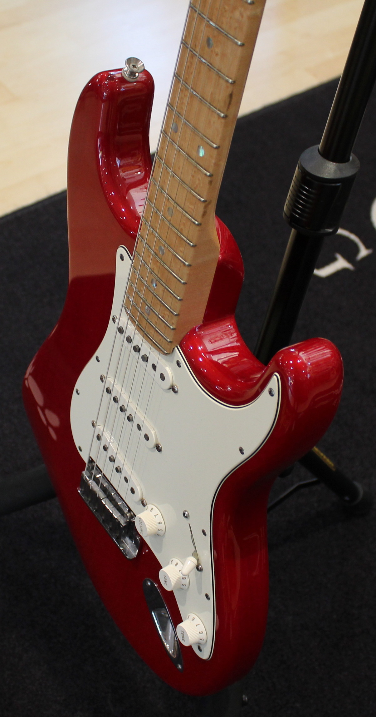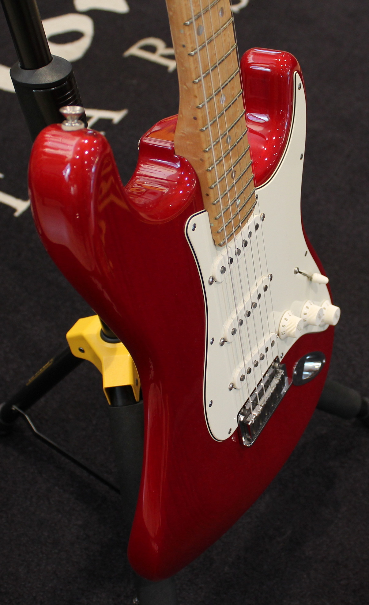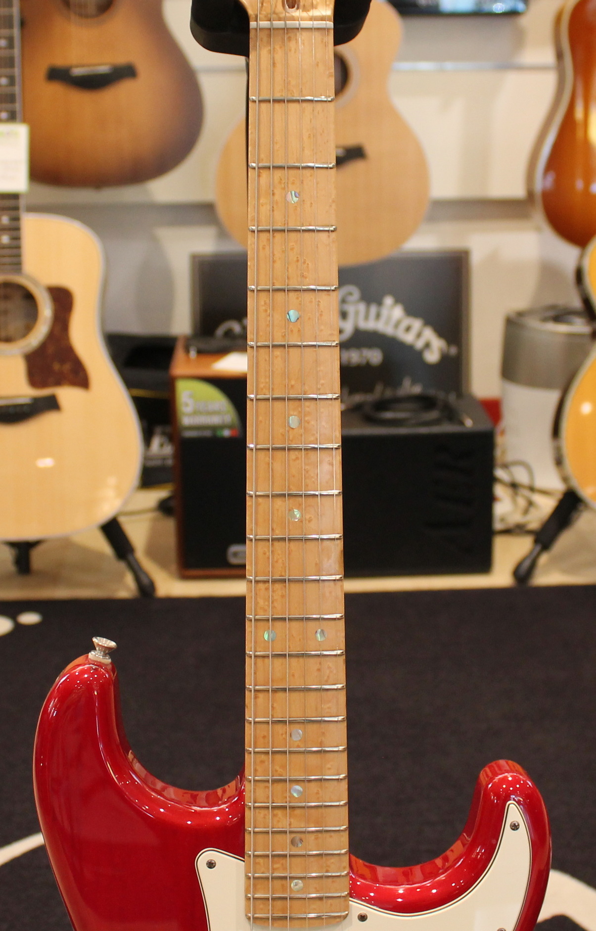 Alder body, large “C” AA birdseye maple neck, maple fingerboard, abalone dot inlays, Access neck heel, synchronized tremolo bridge, Master Built Custom pickups, Fender/Schaller tuners, Urethane finish, parchment pickguard and knobs, 5-way switchblade selector, Custom Shop hardcase, COA, Made in USA by Fender Custom Shop