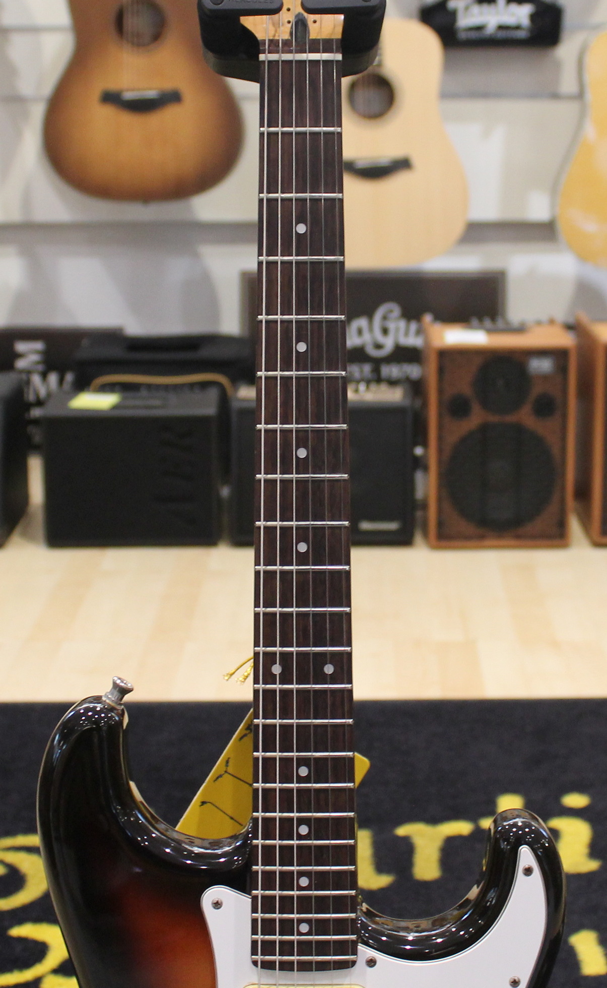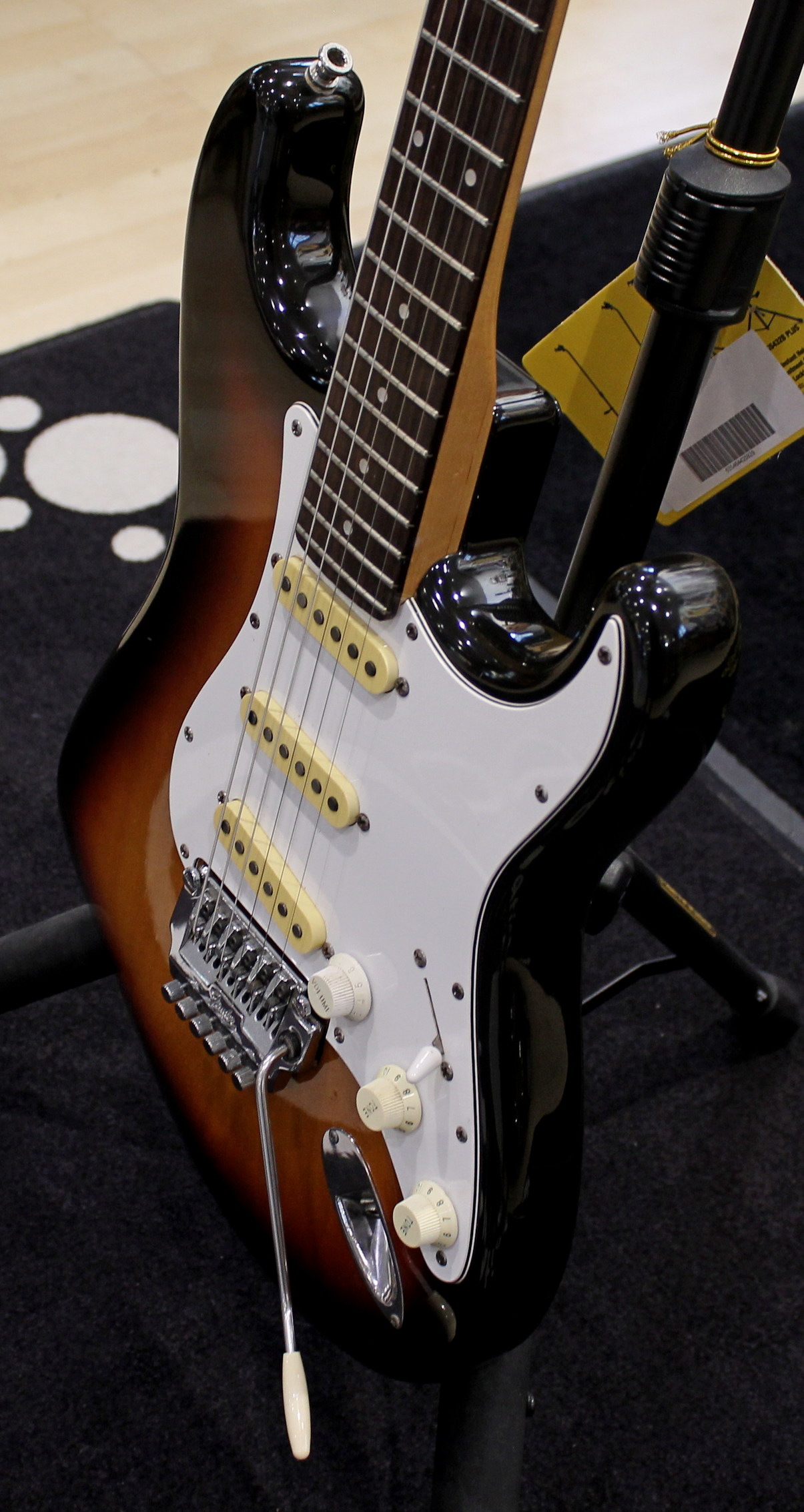 3 color sunburst, alder body, maple neck, rosewood fingerboard, 22 frets, Fender locking tremolo bridge, SSS pickups configuration, 1 x volume, 2 x tone, 5-way, Made in Japan