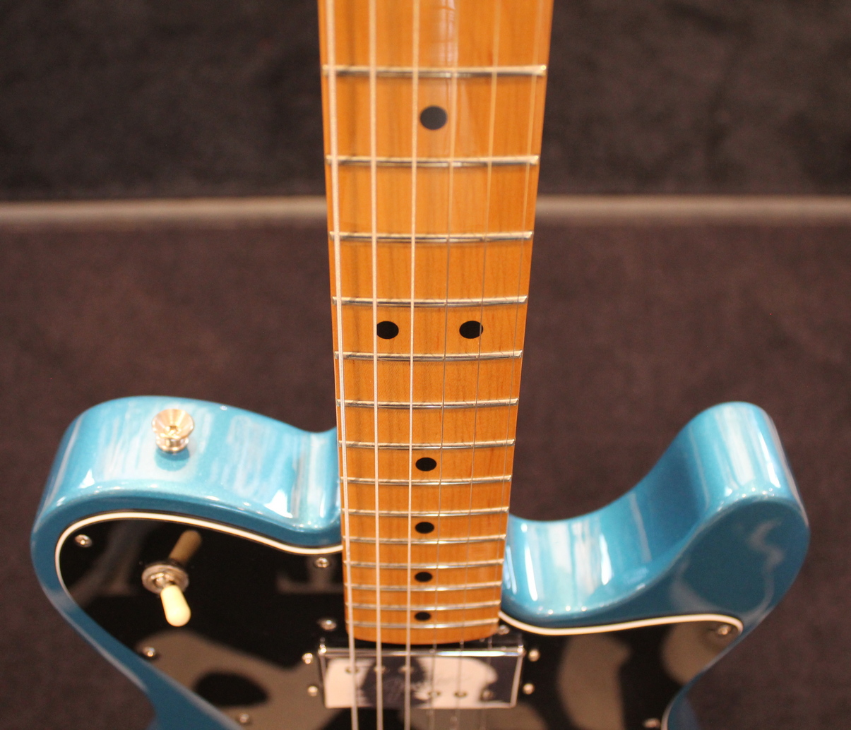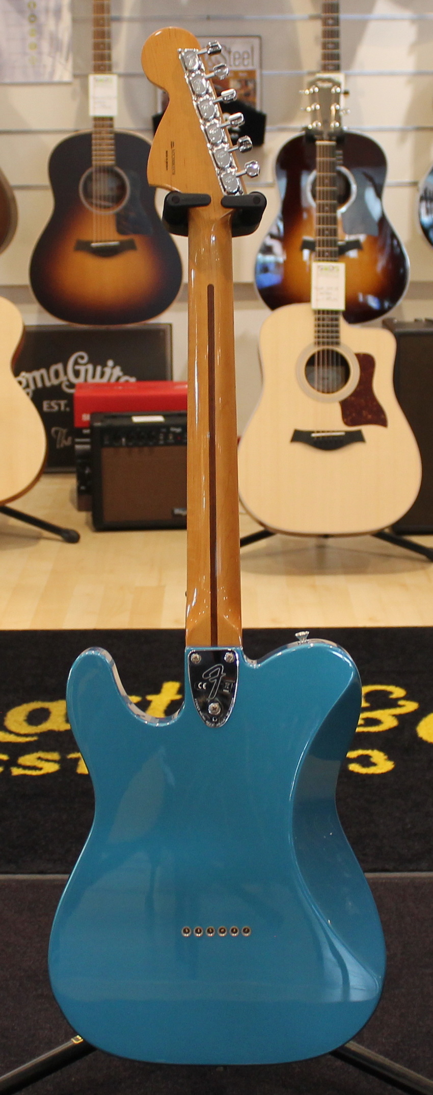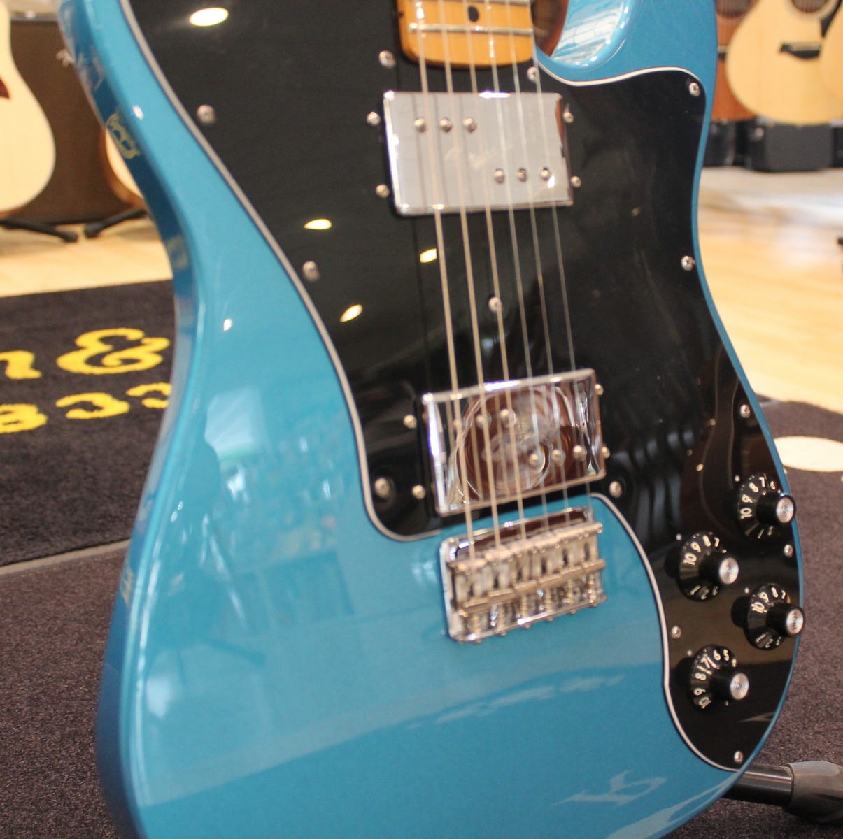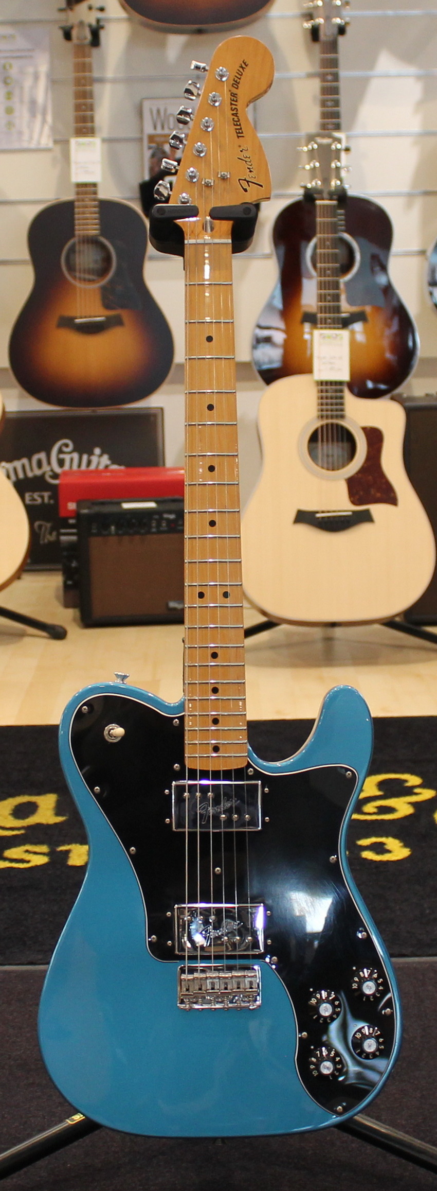 Fender Vintera 70s Telecaster Deluxe MN Electric Guitar, Lake Placid Blue color. The Fender Vintera 70s Telecaster Deluxe is a 6-string electric guitar. Maple neck and fingerboard, with Thin C profile, 9.5″ radius and 21 Medium Jumbo frets. Alder body with Nitrocellulose coating. Two refurbished Wide Range humbucking pickups for increased output. Separate volume and tone controls for each pickup, 3-position selector switch. Chrome-plated mechanisms and hardware.