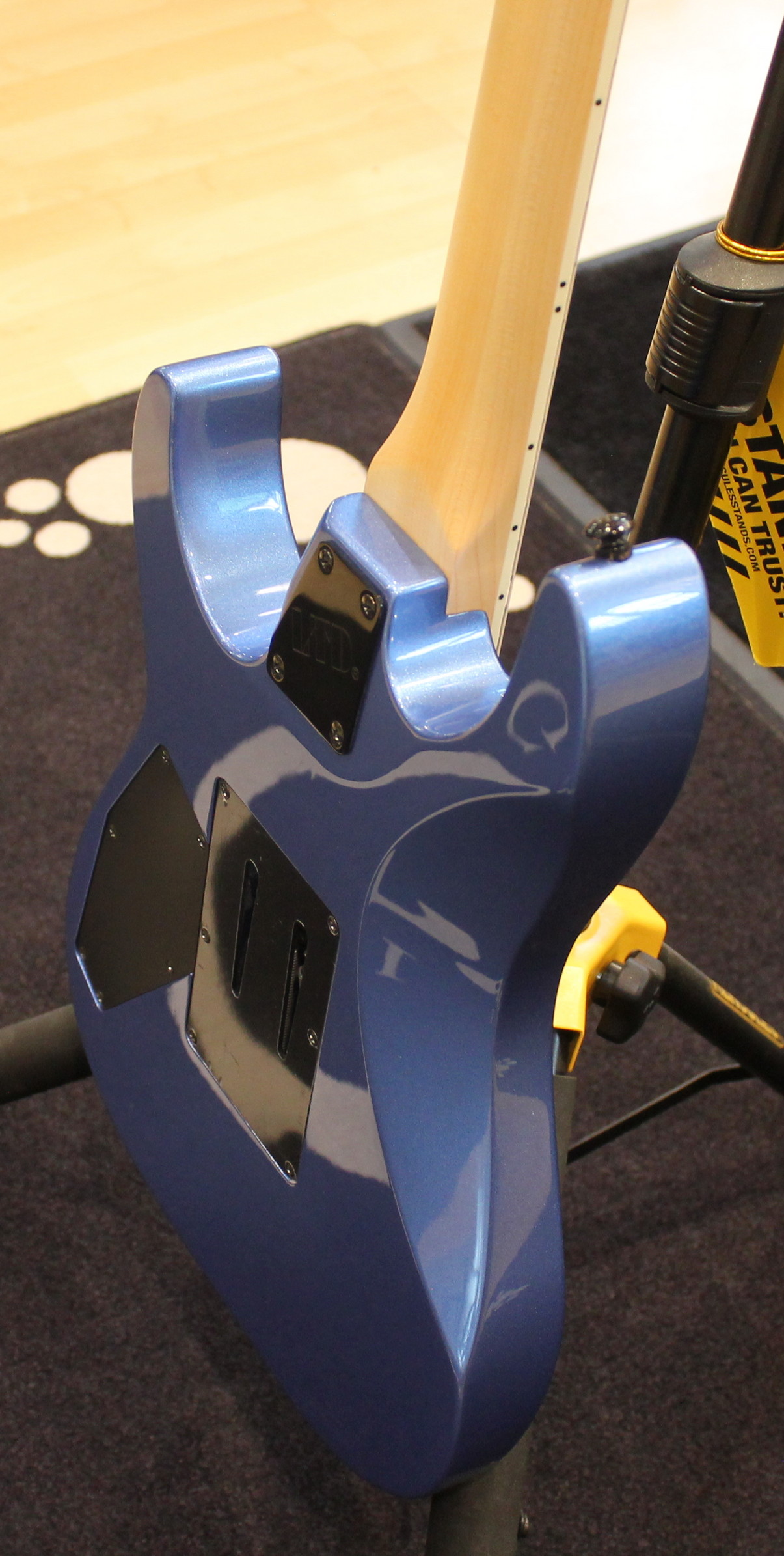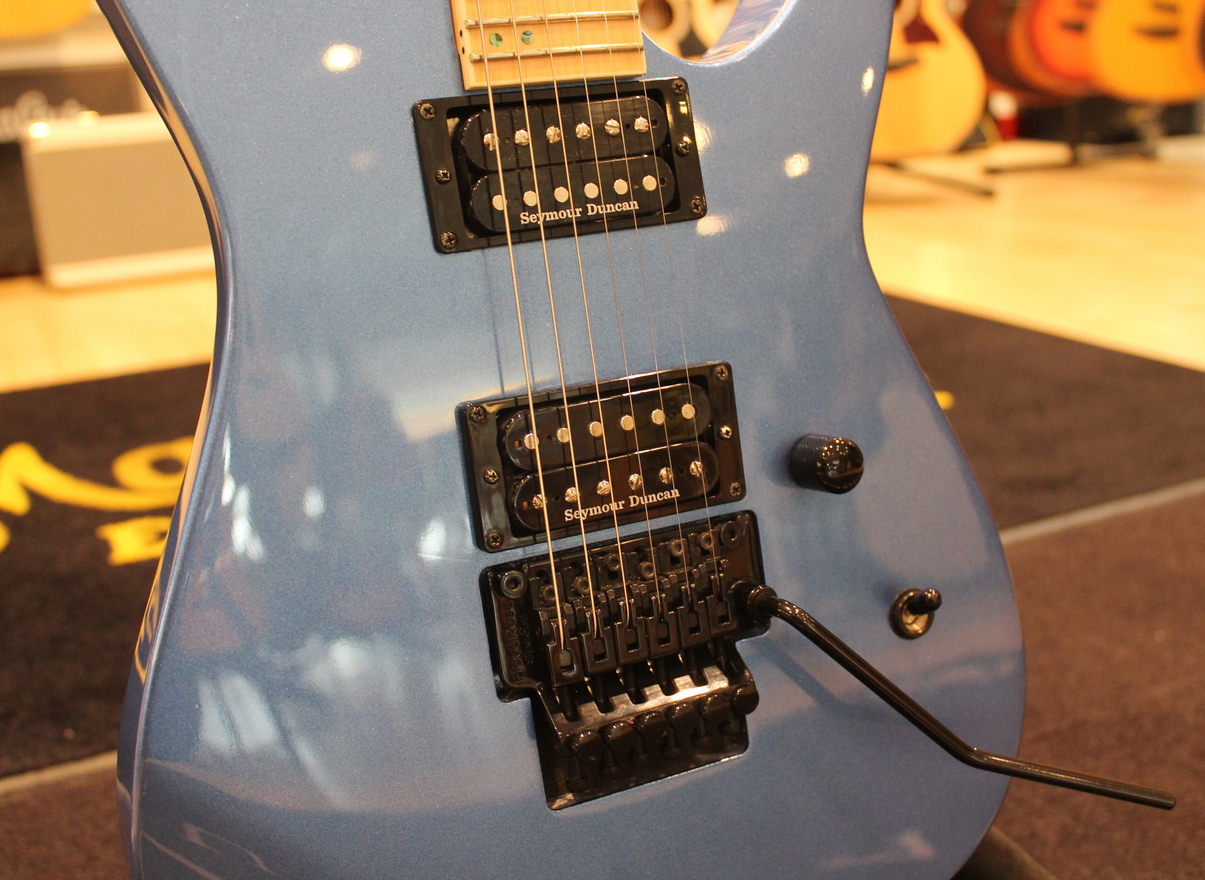 Construction: Bolt-On Scale: 25.5″ Body: Mahogany Neck :3Pc Maple Fingerboard: Maple Fingerboard Radius: 350MM Finish: Blue Chrome Metallic Nut Width: 43mm Nut Type: Locking Neck Contour: Extra Thin Flat Frets/Type: 24 XJ Hardware Colour: Black Strap Button: Standard Tuners: Grover Bridge: Floyd Rose Special Neck PU: Seymour Duncan SH-1 Bridge PU: Seymour Duncan TB-4 Electronics: Passive Electronics Layout: Vol/Toggle Switch