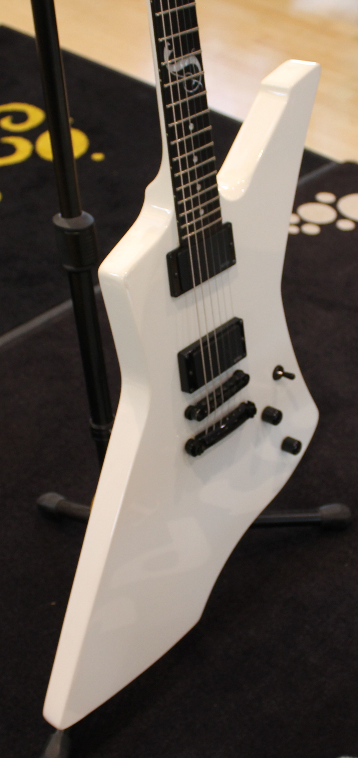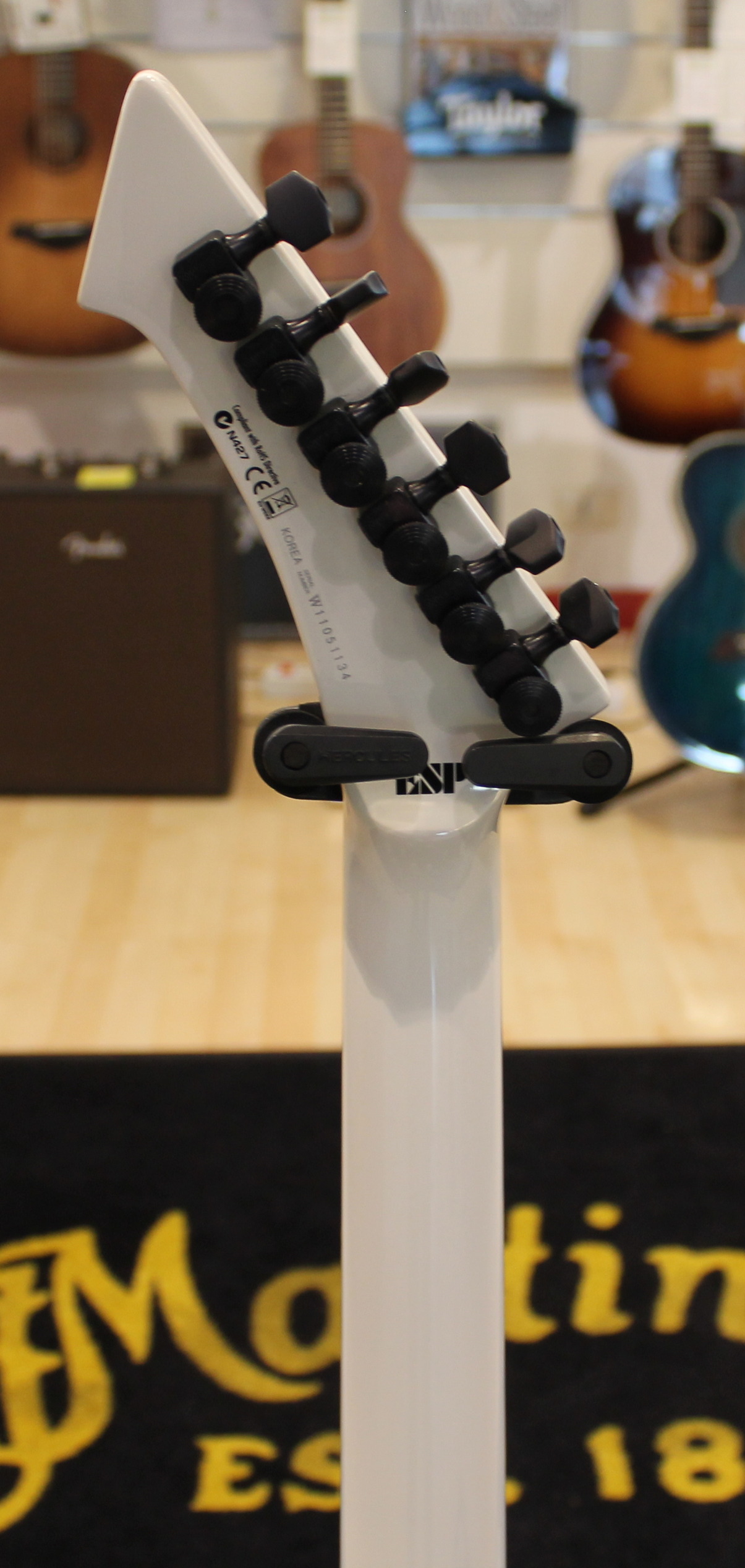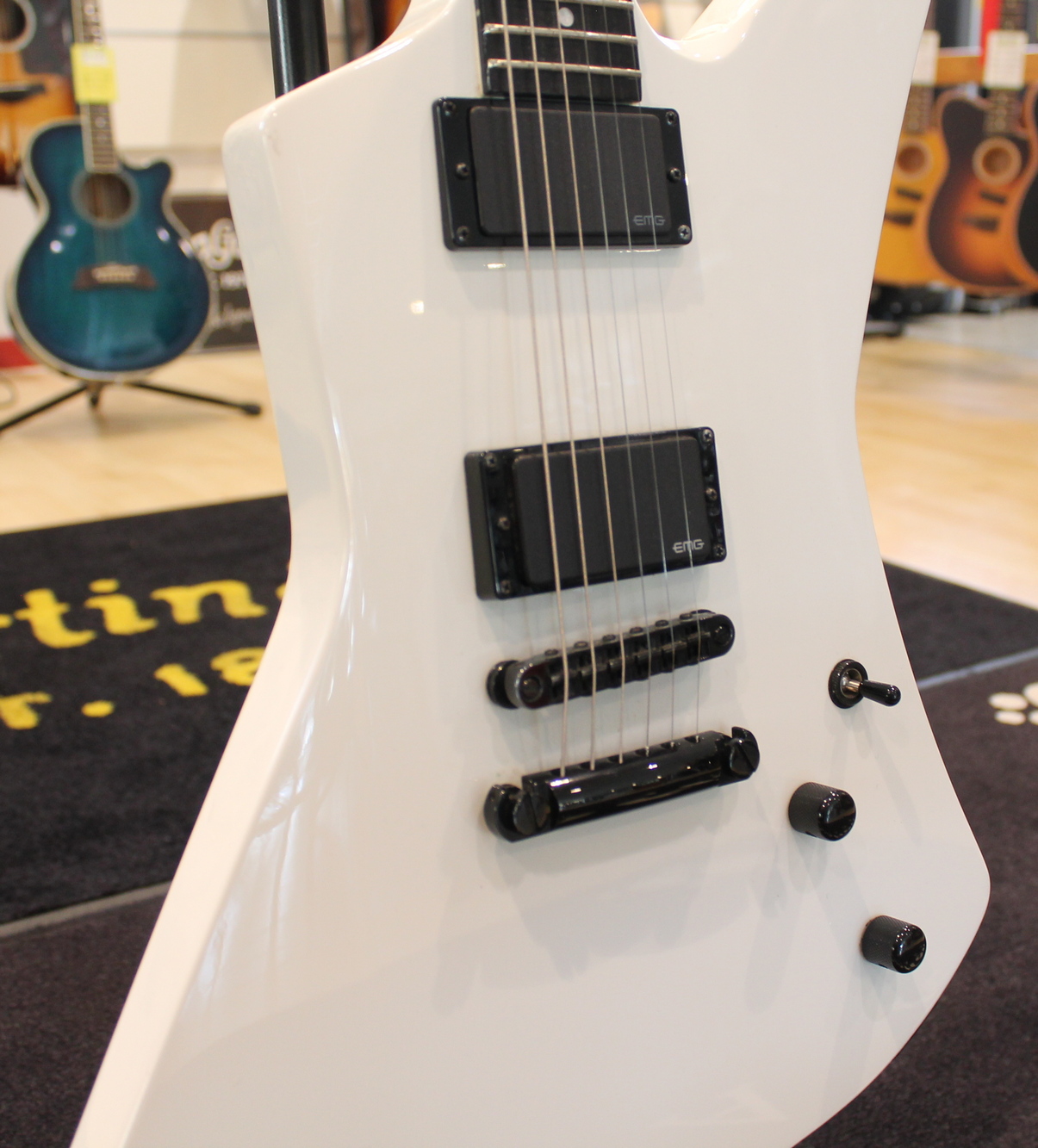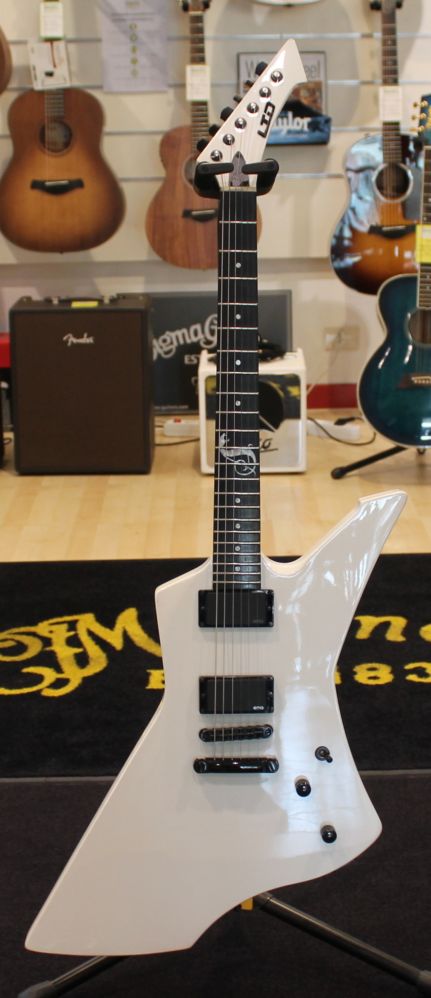 The LTD Snakebyte is a Signature Series model by James Hetfield, frontman of Metallica and one of the world’s most respected rhythm guitarists in any genre. The Snakebyte was created based on an original design by James. It features set-neck construction on a 24.75″ scale, with a mahogany body and three-piece mahogany neck, ebony fingerboard and 22 extra-jumbo frets with an inlay at the 12th fret. The LTD Snakebyte is equipped with James’ EMG JH Set of active pickups, and includes a TonePros locking TOM bridge and tailpiece. Available in Snow White or Black Satin finishes, as well as a left-handed version.