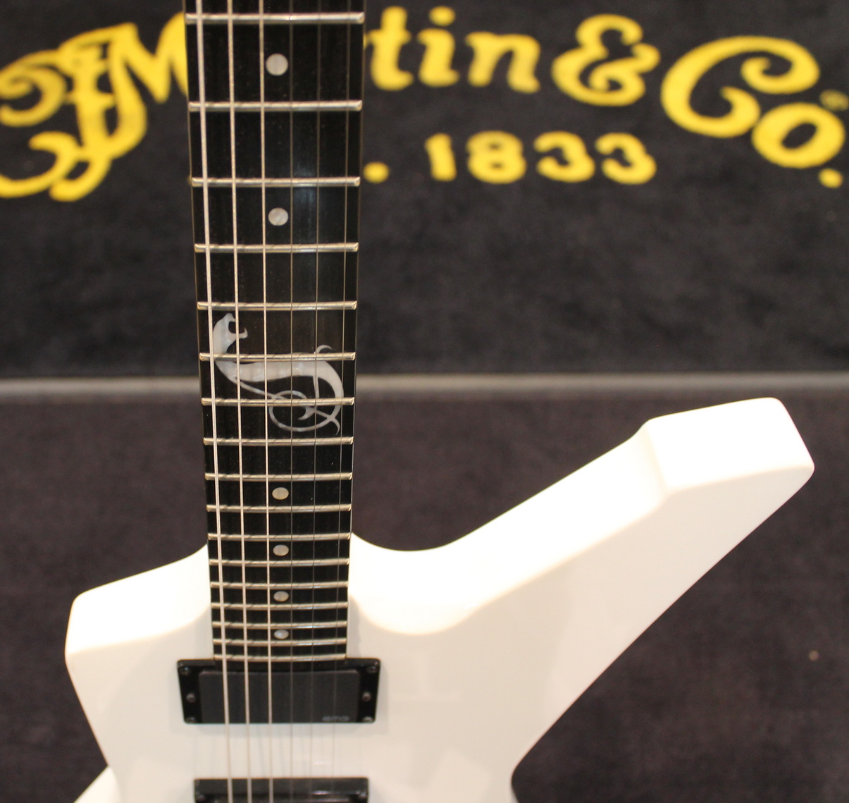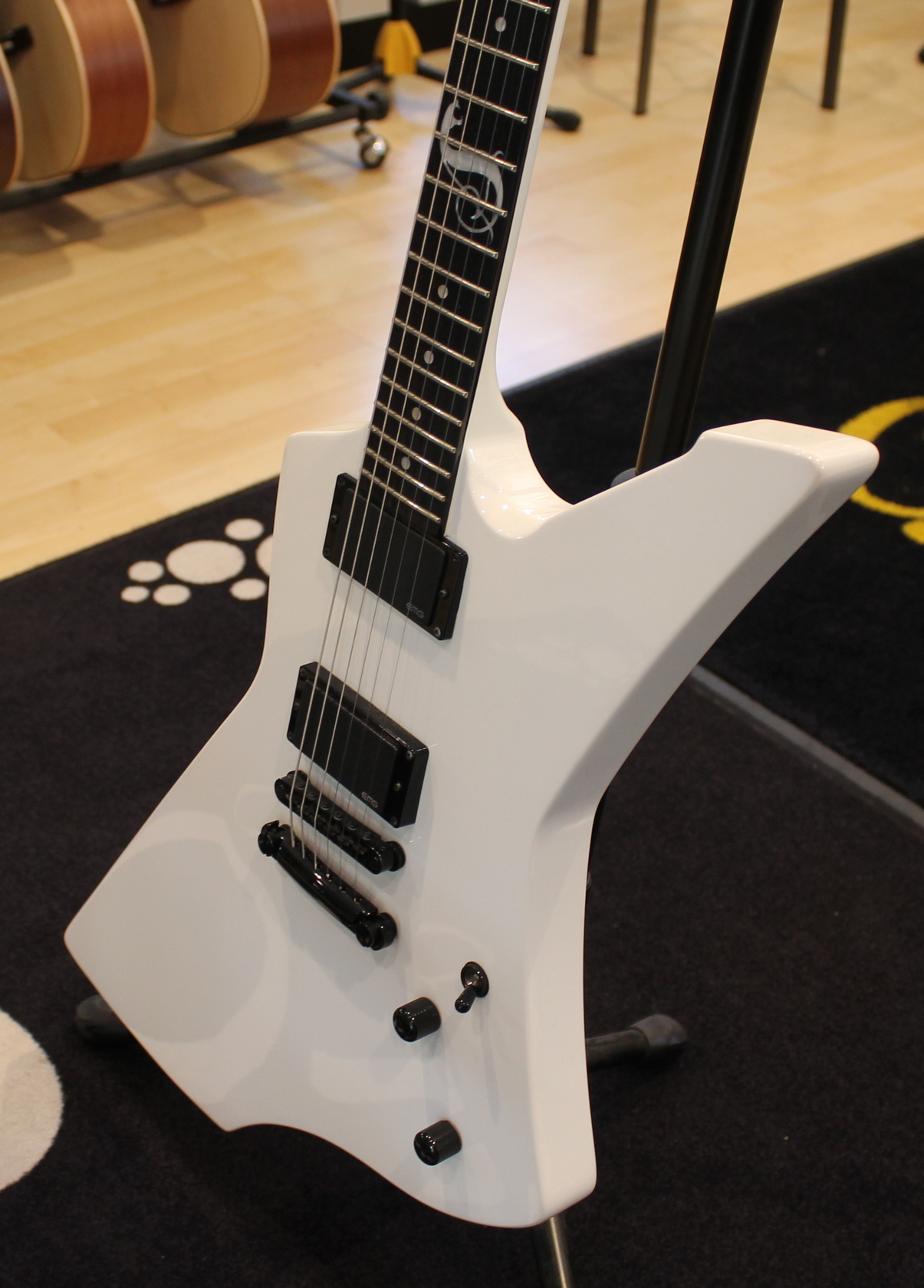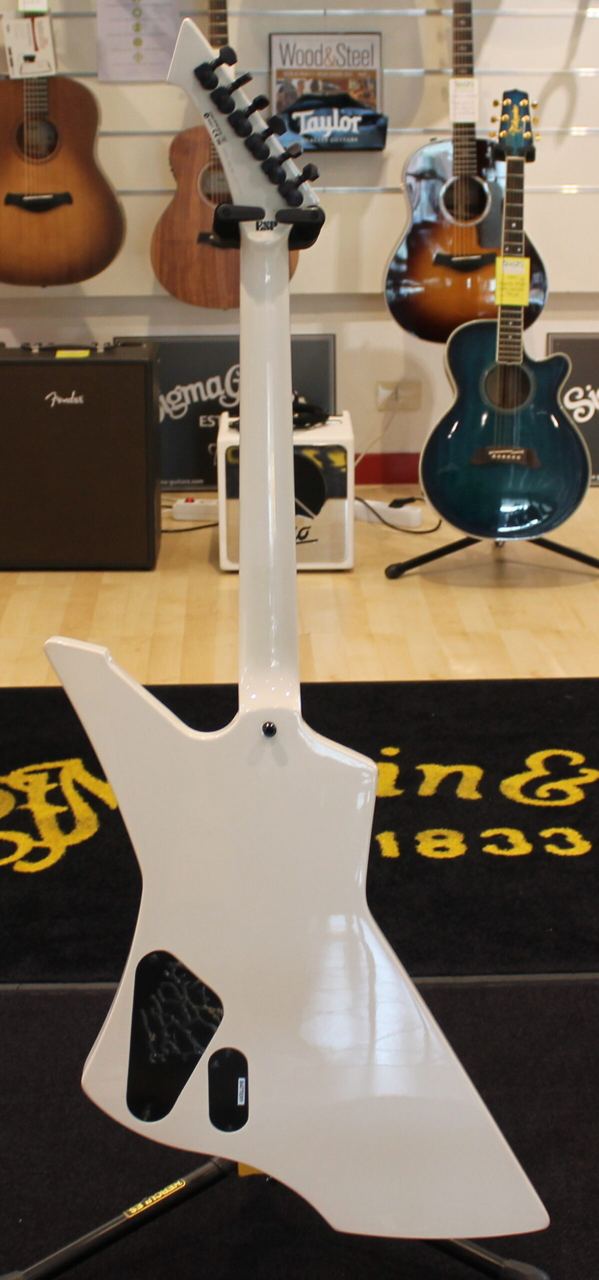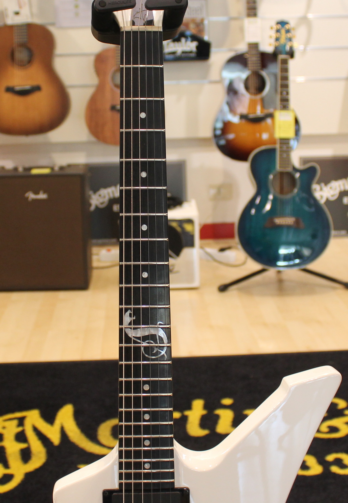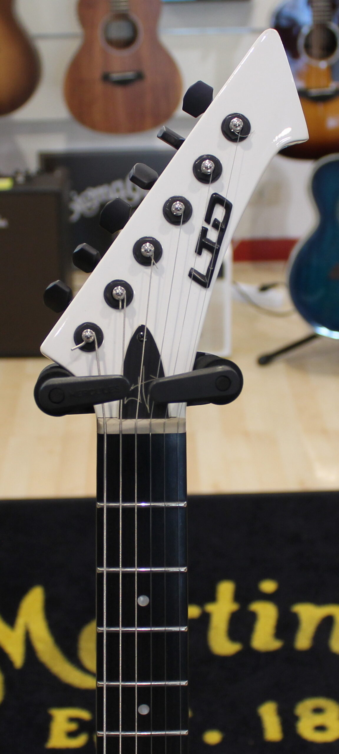 The LTD Snakebyte is a Signature Series model by James Hetfield, frontman of Metallica and one of the world’s most respected rhythm guitarists in any genre. The Snakebyte was created based on an original design by James. It features set-neck construction on a 24.75″ scale, with a mahogany body and three-piece mahogany neck, ebony fingerboard and 22 extra-jumbo frets with an inlay at the 12th fret. The LTD Snakebyte is equipped with James’ EMG JH Set of active pickups, and includes a TonePros locking TOM bridge and tailpiece. Available in Snow White or Black Satin finishes, as well as a left-handed version.