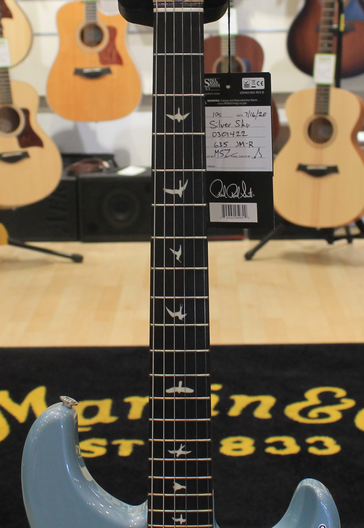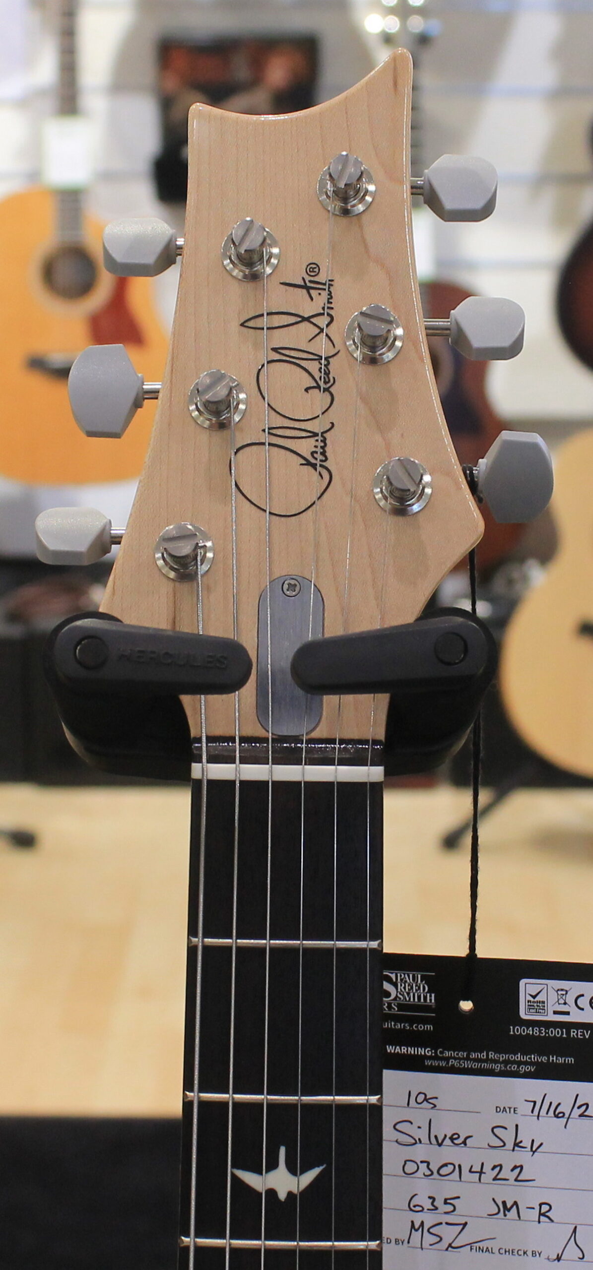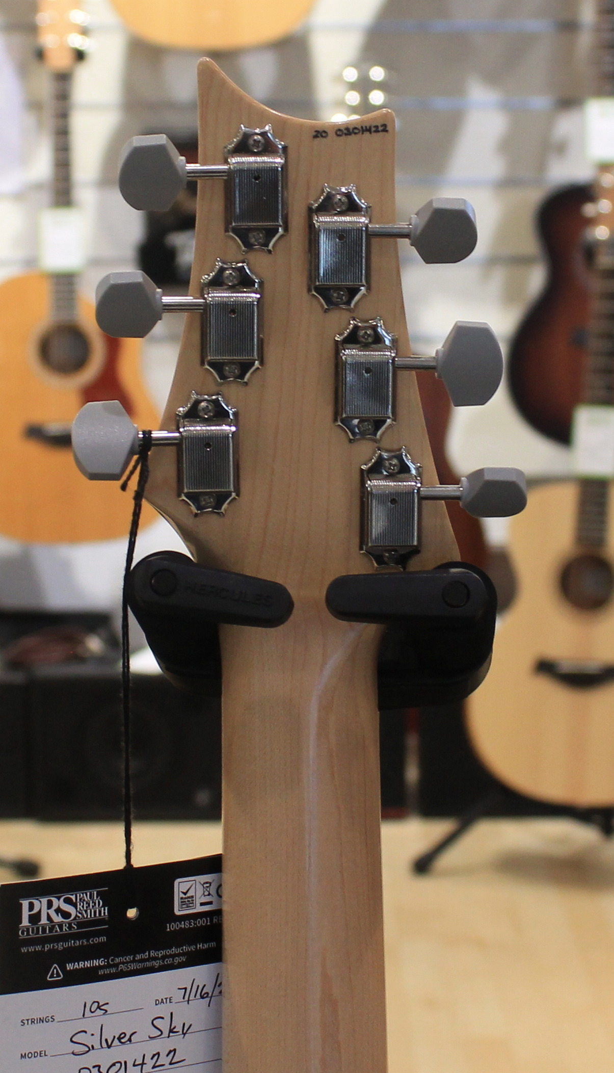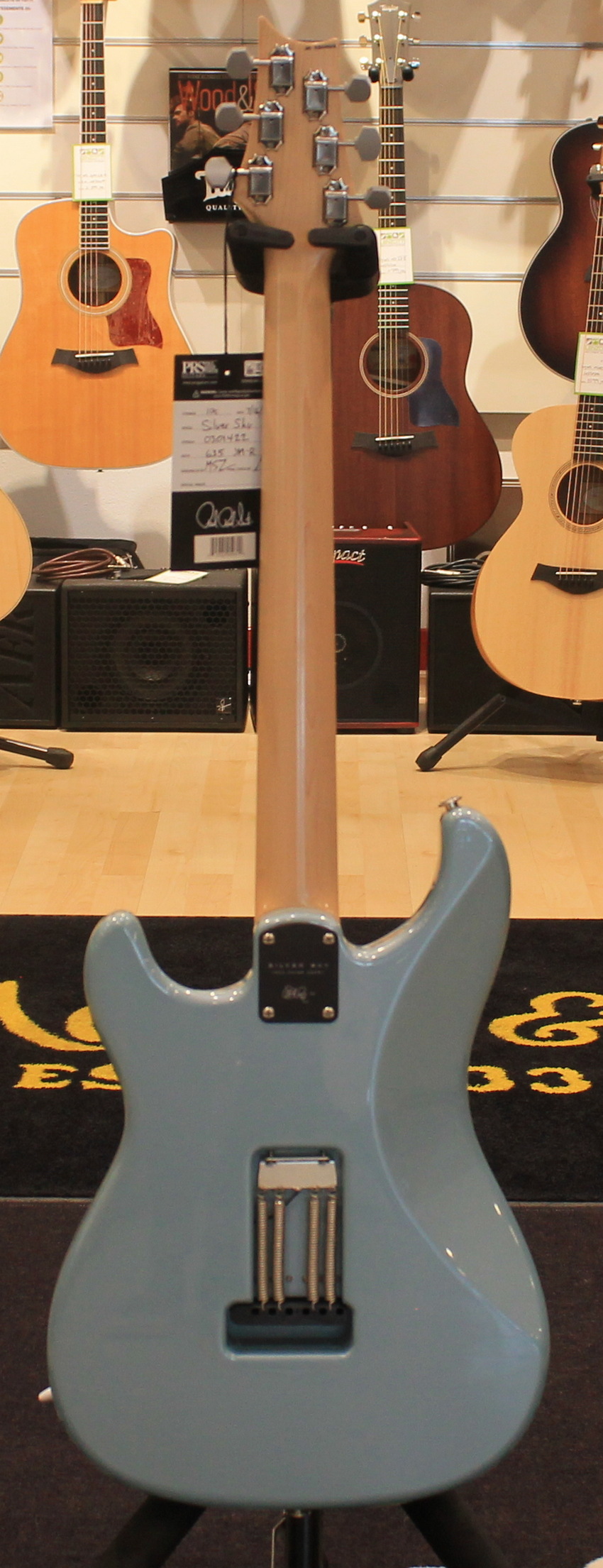 La chitarra elettrica PRS Silver Sky è il risultato della collaborazione tra Paul Reed Smith e John Mayer. Il modello Silver Sky è uno strumento dalle caratteristiche Vintage e si basa sul perfetto mix tra due strumenti Vintage, uno del 1963 ed uno del 1964, di proprietà degli stessi John Mayer e Paul Reed Smith. Le caratteristiche includono un particolare shape della paletta basata sullo stile PRS ma invertita, per adattarsi al meglio allo stile di John Mayer e mantenere allo stesso tempo una consistente lunghezza delle corde prima del nut per un’accordatura più stabile. Le meccaniche sono in stile vintage, il manico è un perfetto mix tra i manici degli strumenti del 1963 e del 1964, la tastiera è in Palissandro o Acero e il ponte tremolo in acciaio offre una risonanza migliore grazie al contatto con il corpo ed è dotato di molte delle caratteristiche presenti nel ponte GEN III. I pickup sono single coil 635JM dal suono pieno e rotondo. La chitarra è disponibile nelle colorazioni Dodgem Blue, Frost, Golden Mesa, Midnight Rose, Moc Sand, Orion Green, Tungsten, Polar Blue