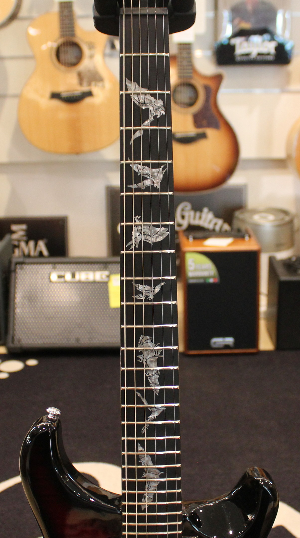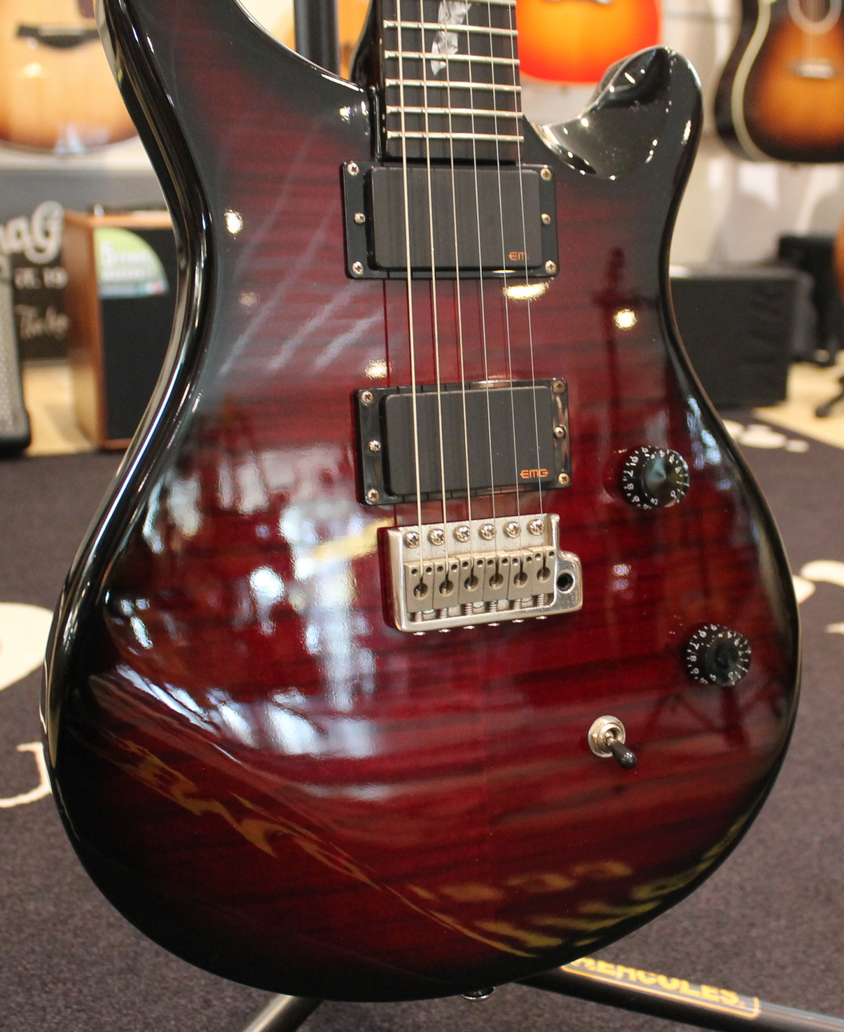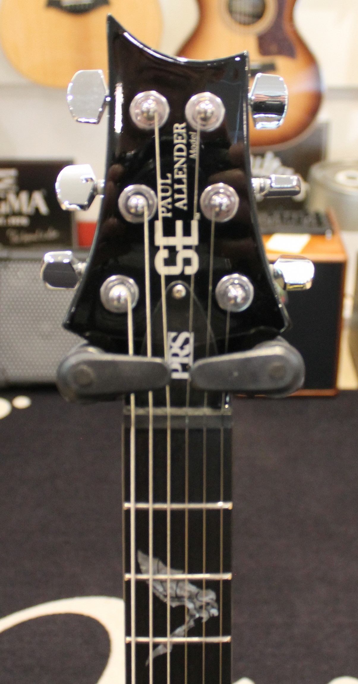 The Paul Reed Smith SE Paul Allender model is a stunning signature edition for the Cradle of Filth guitarist. The combination of a mahogany back and a maple top makes the SE Paul Allender a beautiful-looking, great-sounding guitar that also features a 25″-scale fingerboard. The rosewood fingerboard features the distinctive “flying bats” inlay, while nickel-plated hardware adorns the tuners and bridge. You’ll also notice two high-output EMG pickups on the SE Paul Allender.