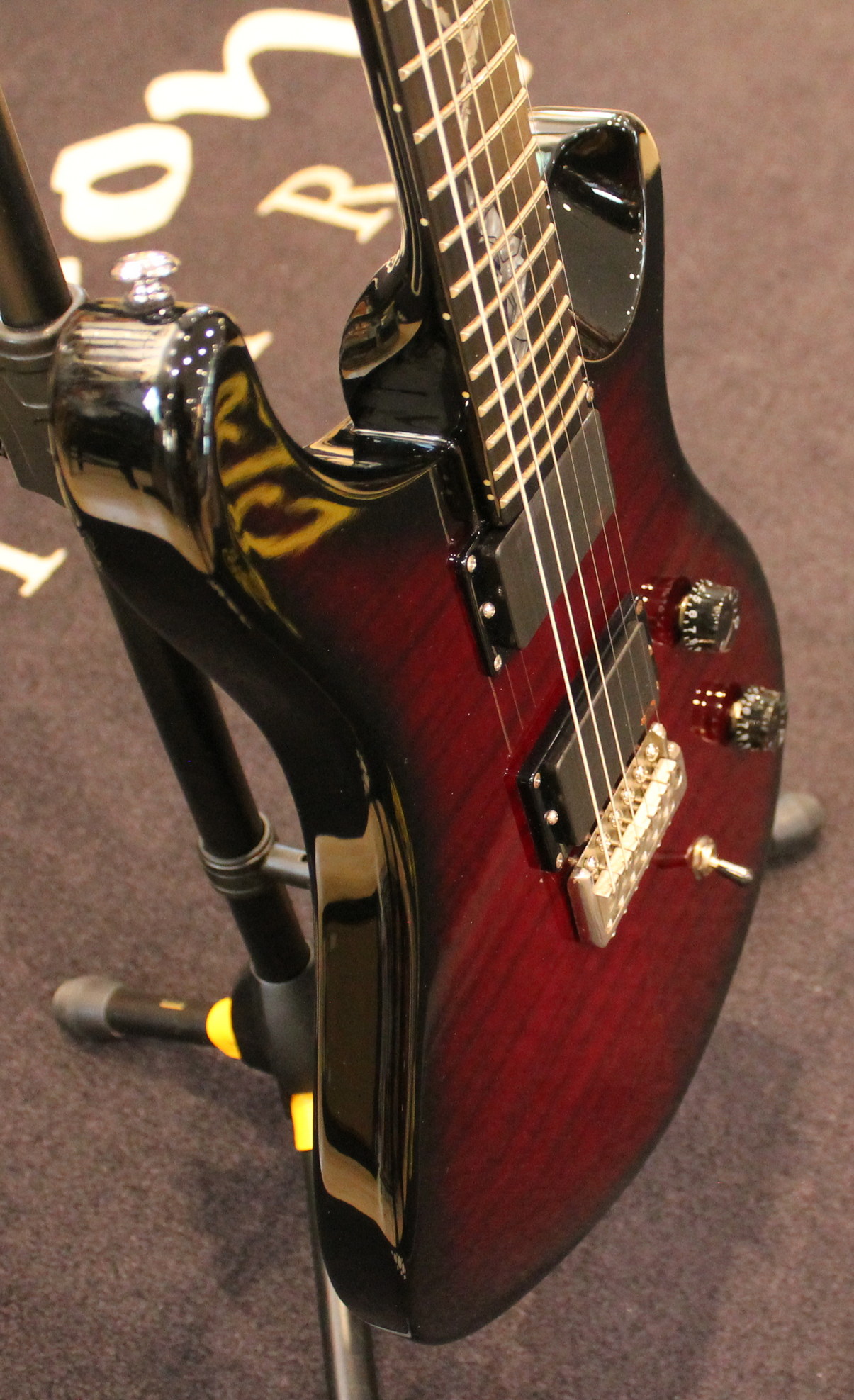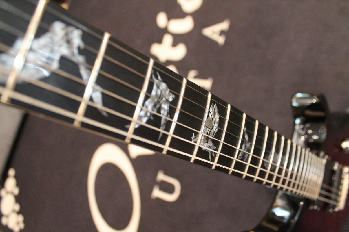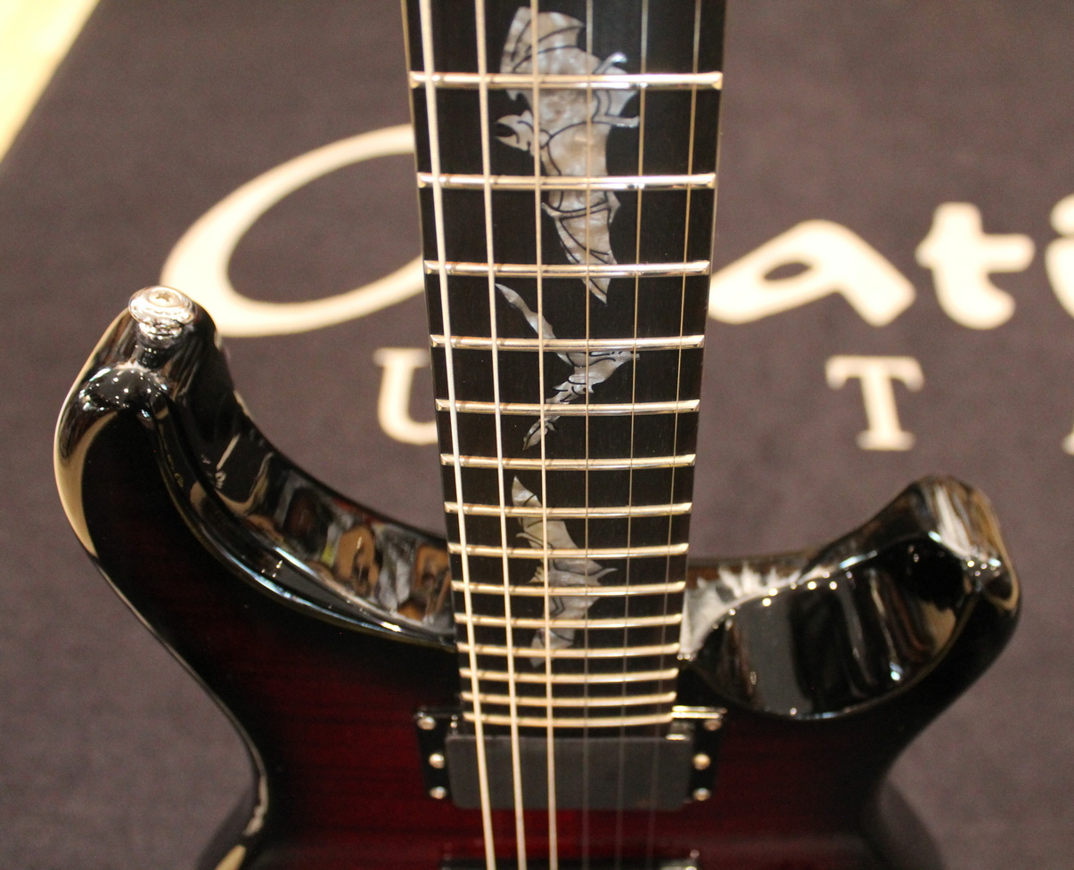 The Paul Reed Smith SE Paul Allender model is a stunning signature edition for the Cradle of Filth guitarist. The combination of a mahogany back and a maple top makes the SE Paul Allender a beautiful-looking, great-sounding guitar that also features a 25″-scale fingerboard. The rosewood fingerboard features the distinctive “flying bats” inlay, while nickel-plated hardware adorns the tuners and bridge. You’ll also notice two high-output EMG pickups on the SE Paul Allender.