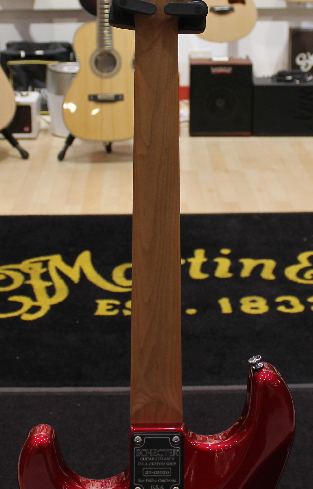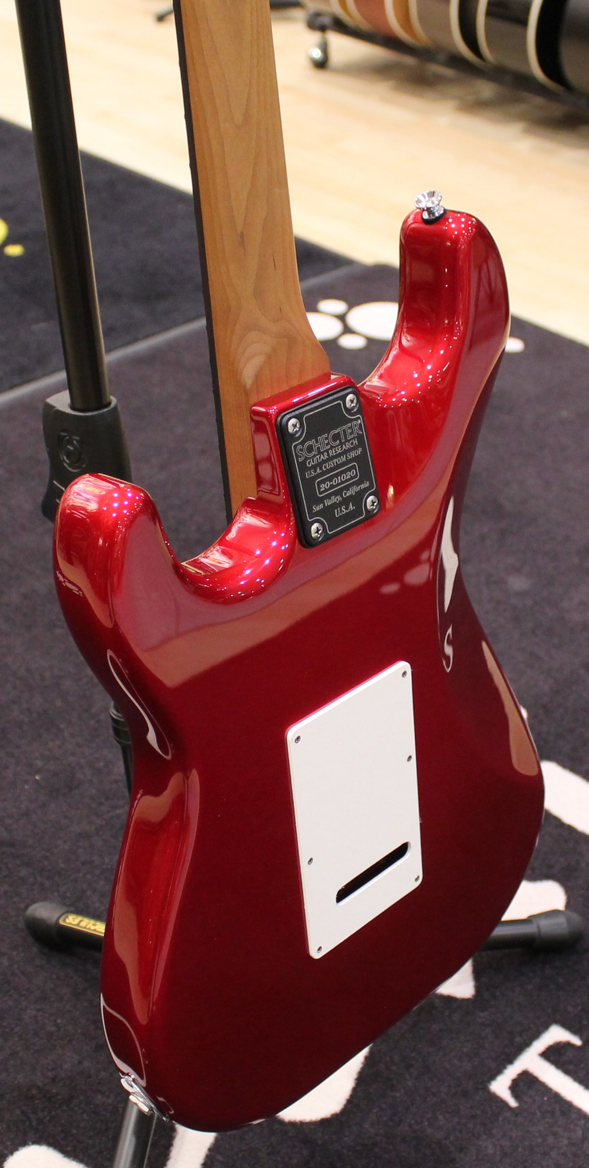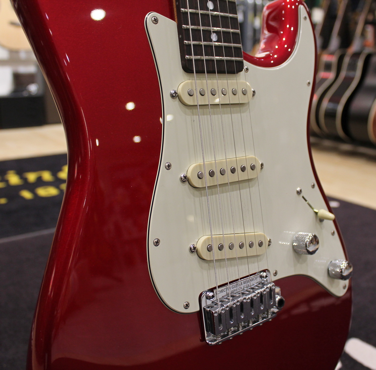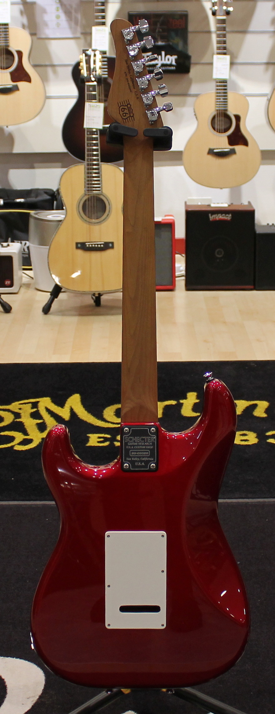 TRADITIONAL ROUTE 66 CAR S/S/S 6 String Electric Guitar Route 66 Series Made USA Made in the Schecter Custom Shop in California Construction: Bolt-on Body: Alder Neck: Custom C roasted maple with vintage satin finish Scale: 25.5″ (648mm) Fingerboard: Ebony 22 frets Jumbo Jescar Premium German Radius: 14” Nutstock: Graph Tech XL Black Tusq 42mm Inlays: Dots Pickguard White three layers Pickups: 3x Single Coil Schecter Custom Shop USA Pasadena VS-1 Controls: 1x Tone + 1x Volume + 5-position selector switch Bridge: Schecter Vintage Tremolo Tuner: Schecter self-locking tuners Hardware Finish: Chrome Color: Candy Apple Red Finish: Polished Rectangular hard Schecter case included