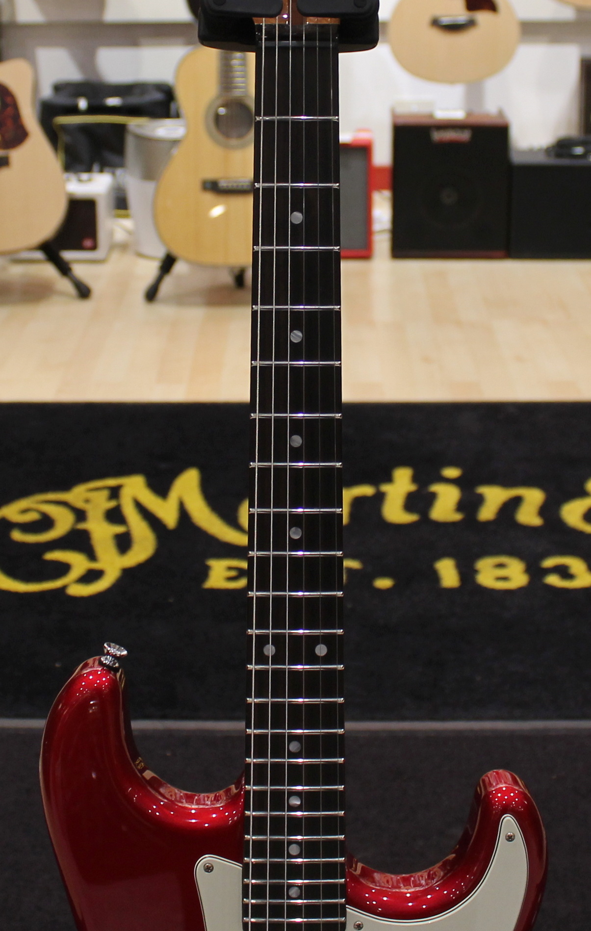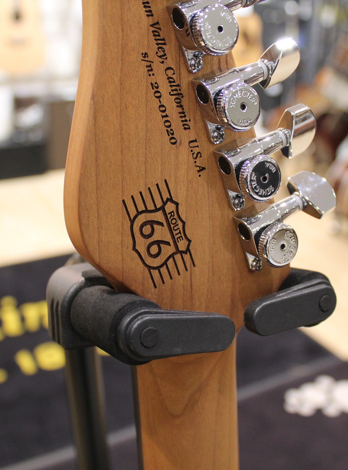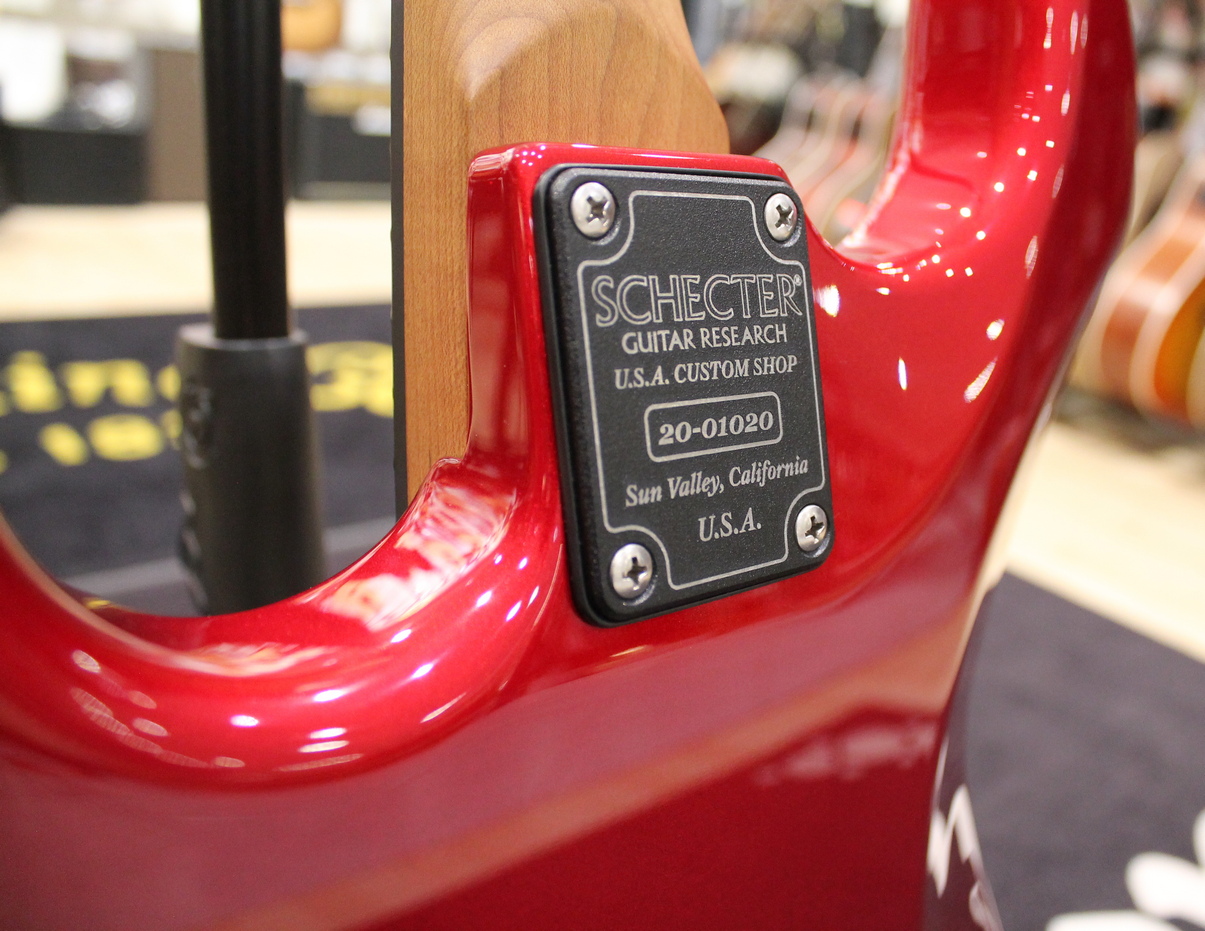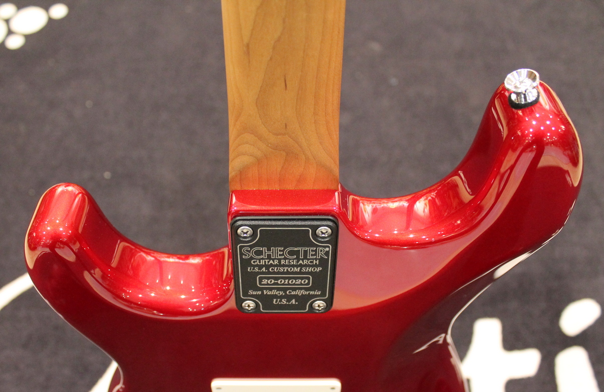 TRADITIONAL ROUTE 66 CAR S/S/S 6 String Electric Guitar Route 66 Series Made USA Made in the Schecter Custom Shop in California Construction: Bolt-on Body: Alder Neck: Custom C roasted maple with vintage satin finish Scale: 25.5″ (648mm) Fingerboard: Ebony 22 frets Jumbo Jescar Premium German Radius: 14” Nutstock: Graph Tech XL Black Tusq 42mm Inlays: Dots Pickguard White three layers Pickups: 3x Single Coil Schecter Custom Shop USA Pasadena VS-1 Controls: 1x Tone + 1x Volume + 5-position selector switch Bridge: Schecter Vintage Tremolo Tuner: Schecter self-locking tuners Hardware Finish: Chrome Color: Candy Apple Red Finish: Polished Rectangular hard Schecter case included
