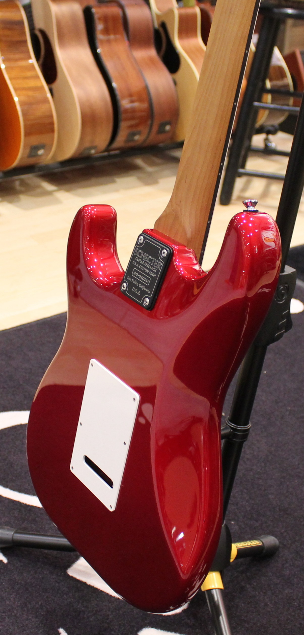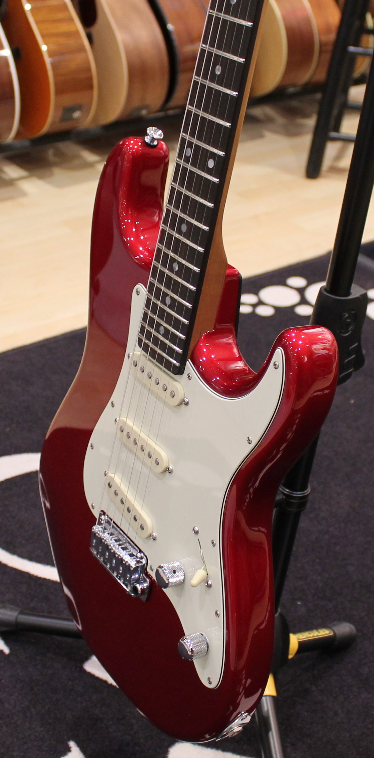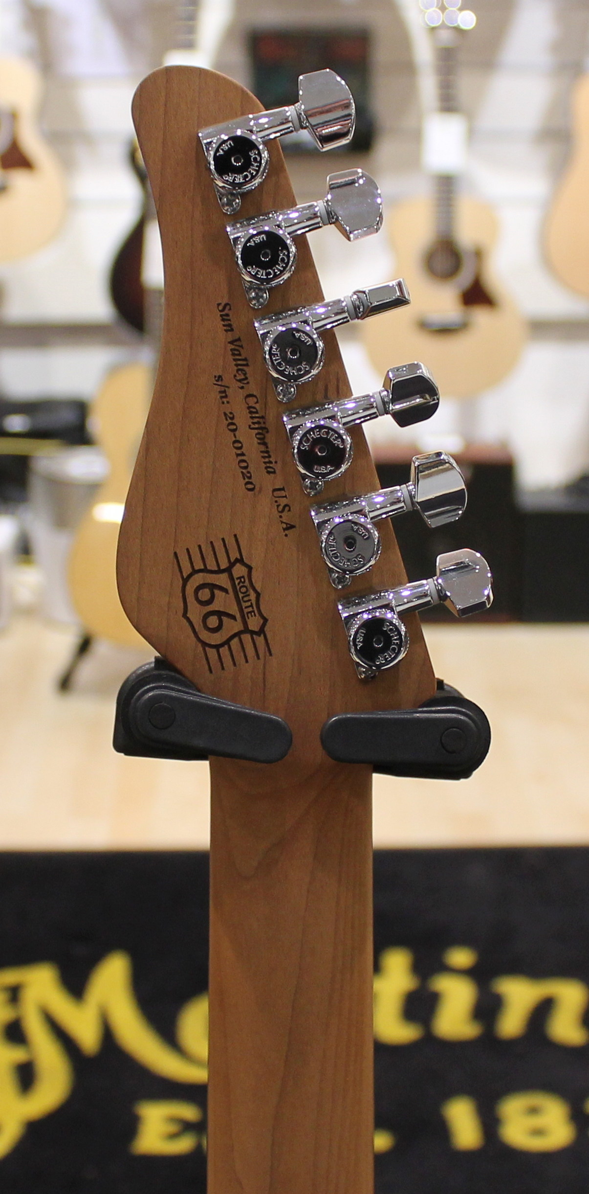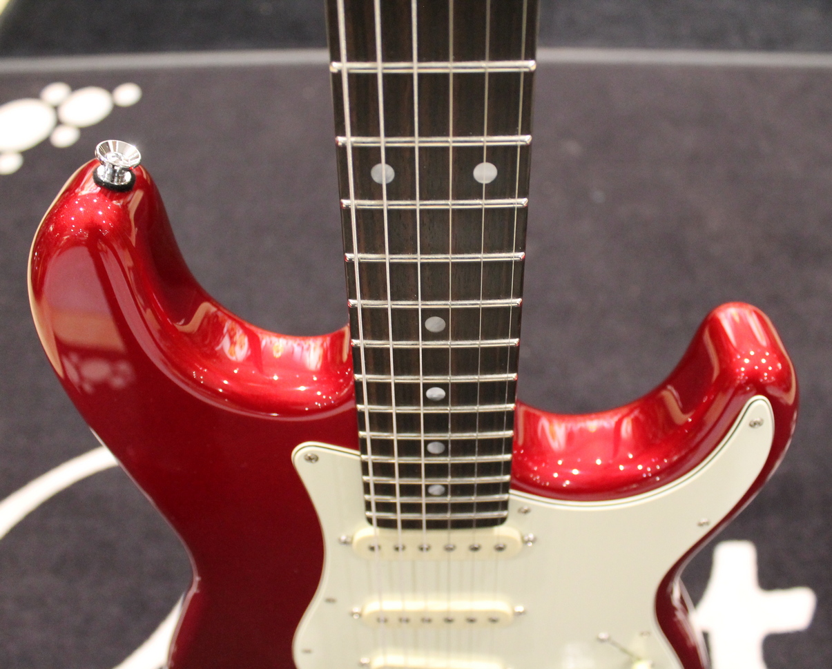 TRADITIONAL ROUTE 66 CAR S/S/S 6 String Electric Guitar Route 66 Series Made USA Made in the Schecter Custom Shop in California Construction: Bolt-on Body: Alder Neck: Custom C roasted maple with vintage satin finish Scale: 25.5″ (648mm) Fingerboard: Ebony 22 frets Jumbo Jescar Premium German Radius: 14” Nutstock: Graph Tech XL Black Tusq 42mm Inlays: Dots Pickguard White three layers Pickups: 3x Single Coil Schecter Custom Shop USA Pasadena VS-1 Controls: 1x Tone + 1x Volume + 5-position selector switch Bridge: Schecter Vintage Tremolo Tuner: Schecter self-locking tuners Hardware Finish: Chrome Color: Candy Apple Red Finish: Polished Rectangular hard Schecter case included