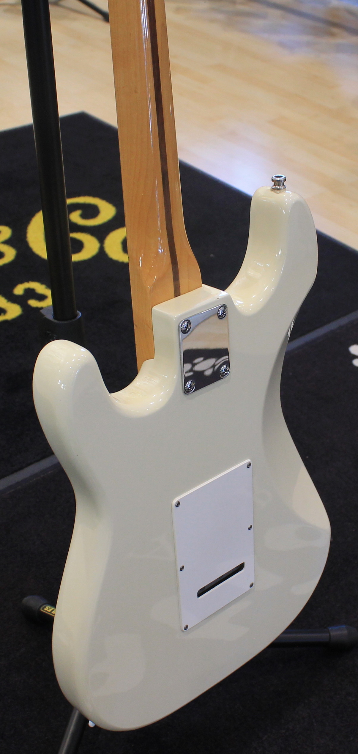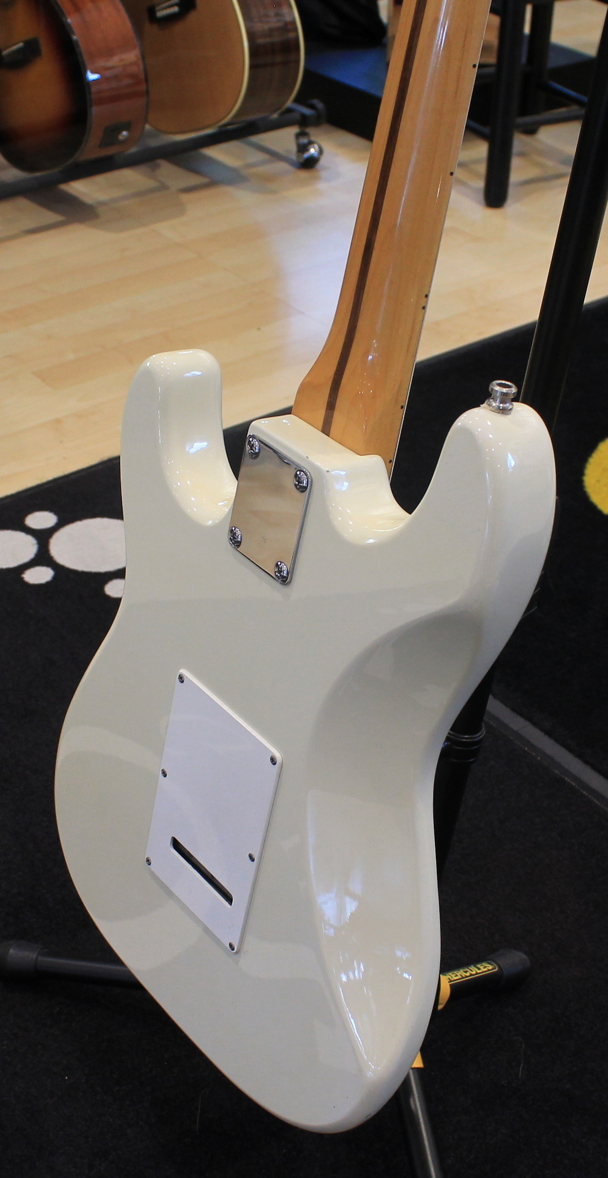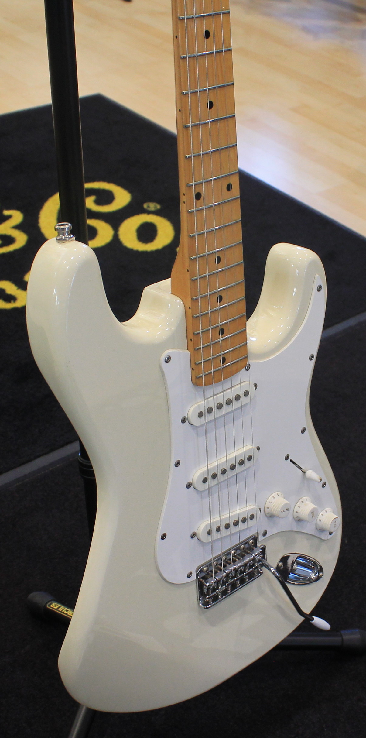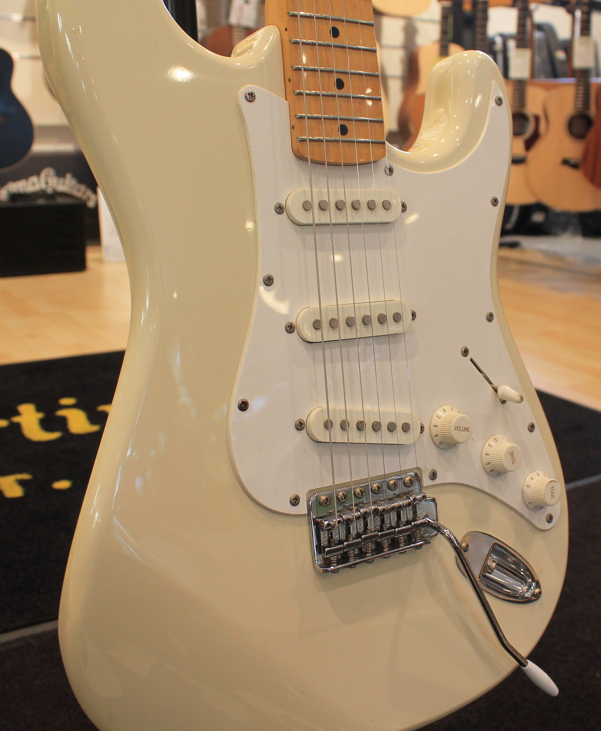 Olympic White finish, hardwood body, maple neck, maple fingerboard, 3 x single-coil, 1 x volume, 1 x tone, synchronized tremolo bridge, chrome hardware, Made in Korea in 1989