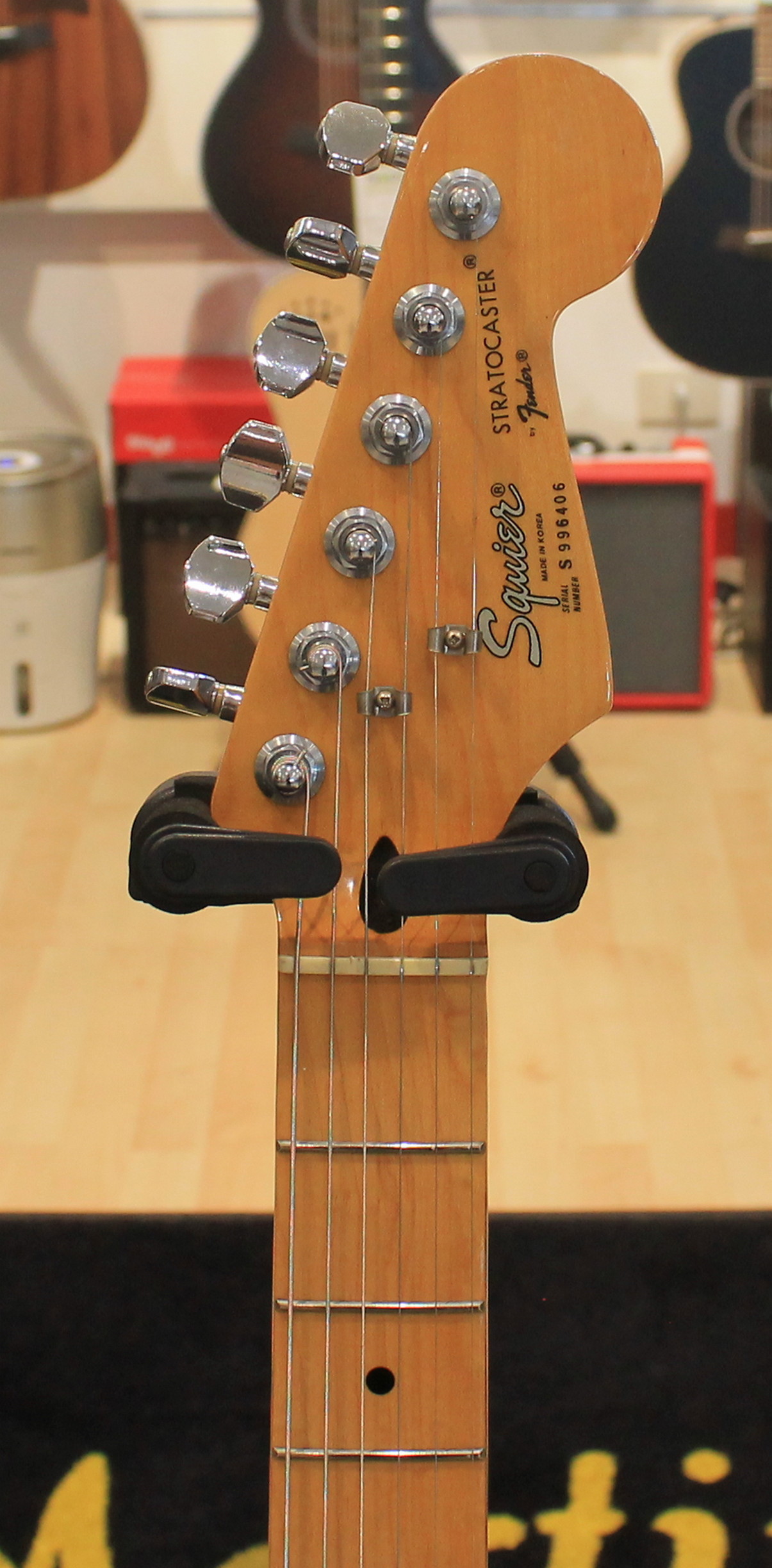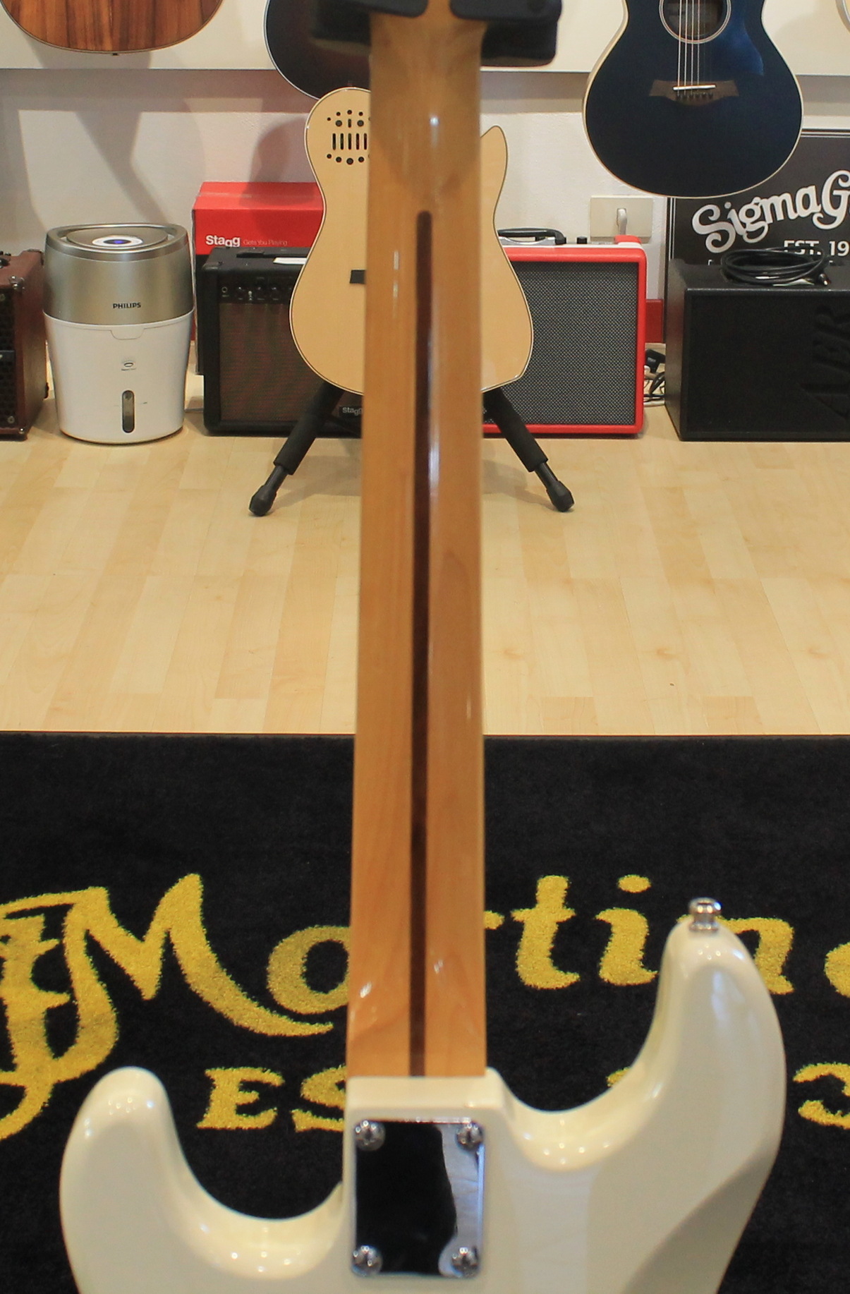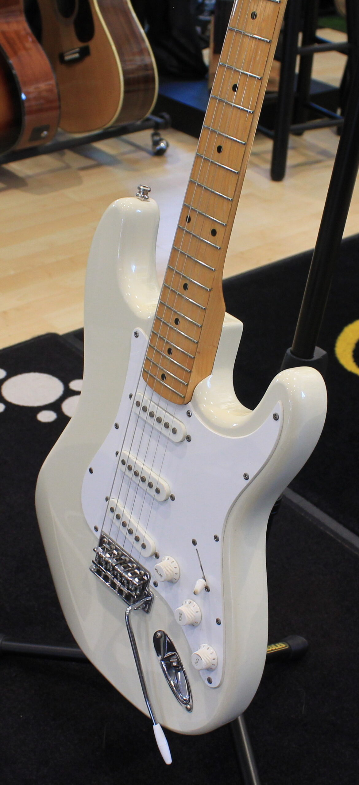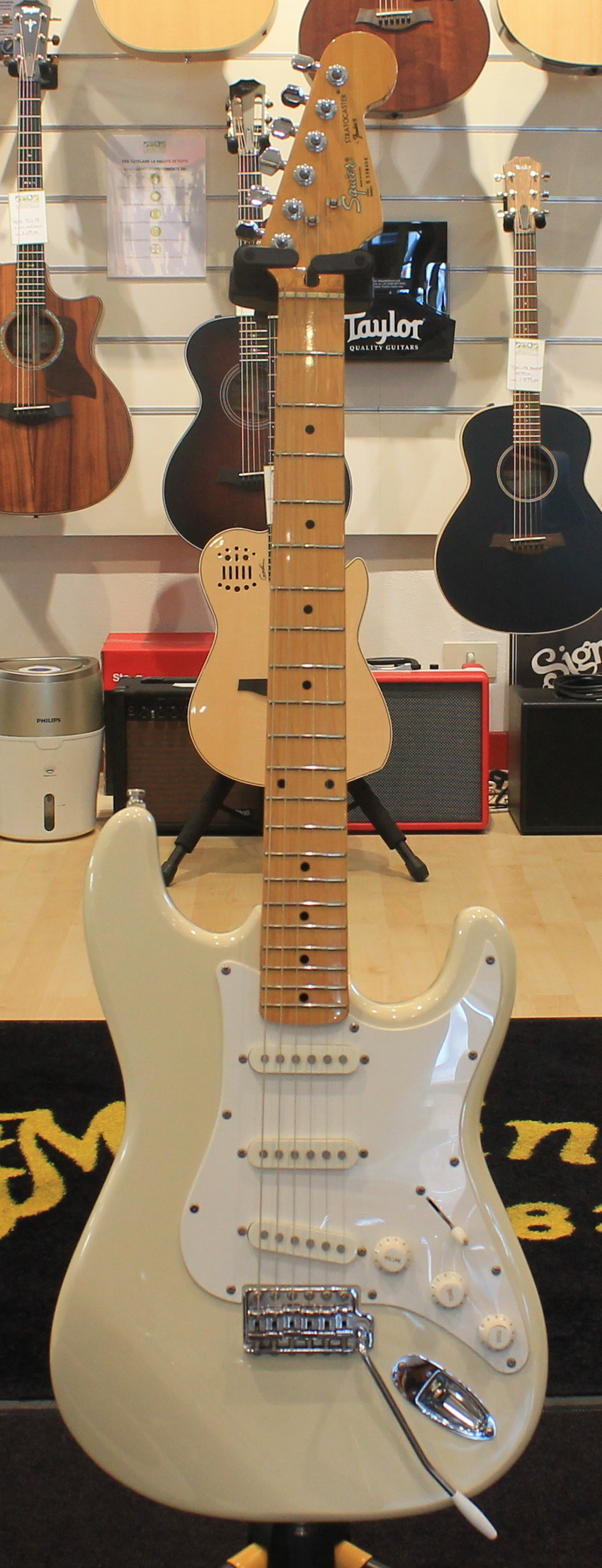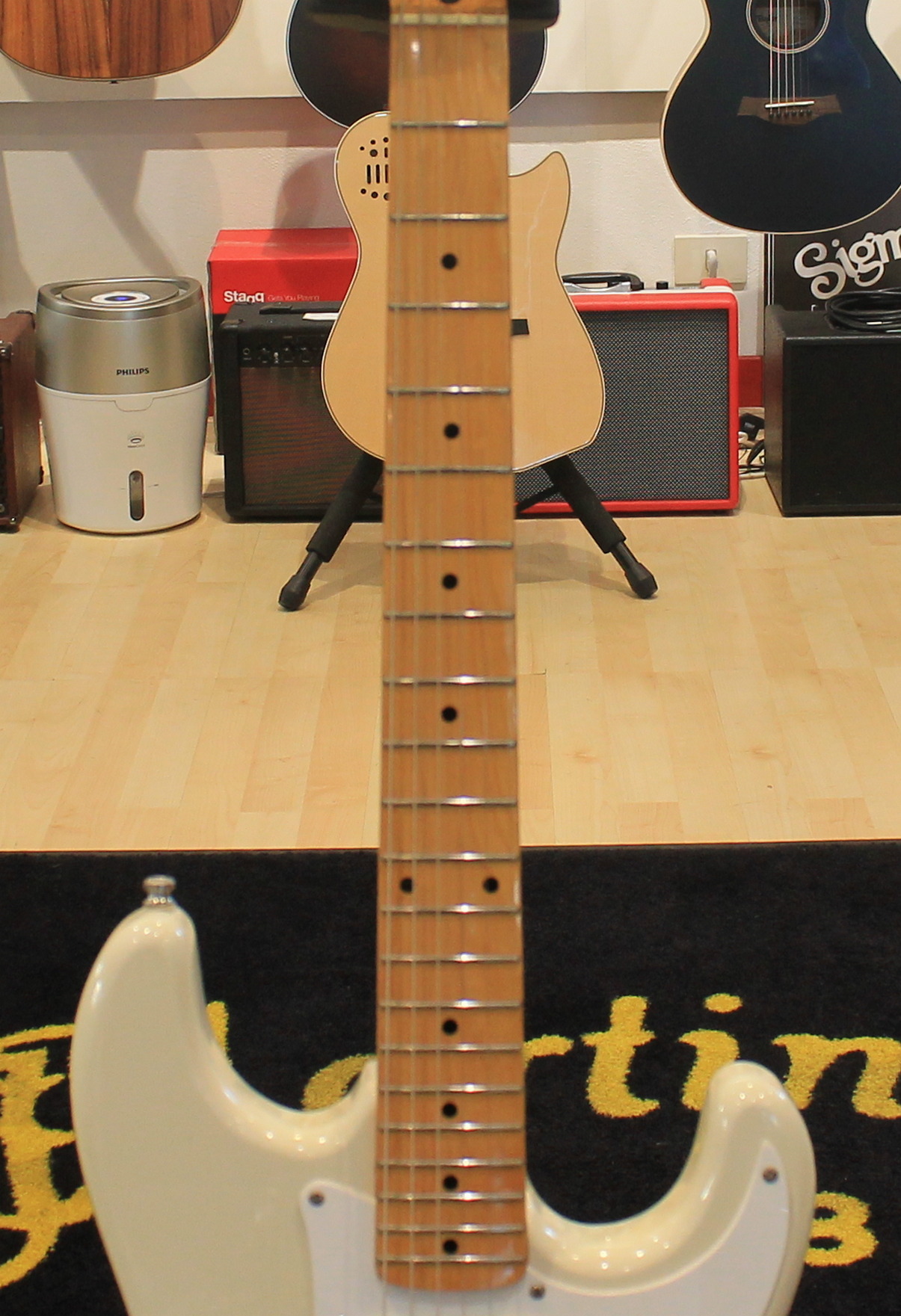 Olympic White finish, hardwood body, maple neck, maple fingerboard, 3 x single-coil, 1 x volume, 1 x tone, synchronized tremolo bridge, chrome hardware, Made in Korea in 1989