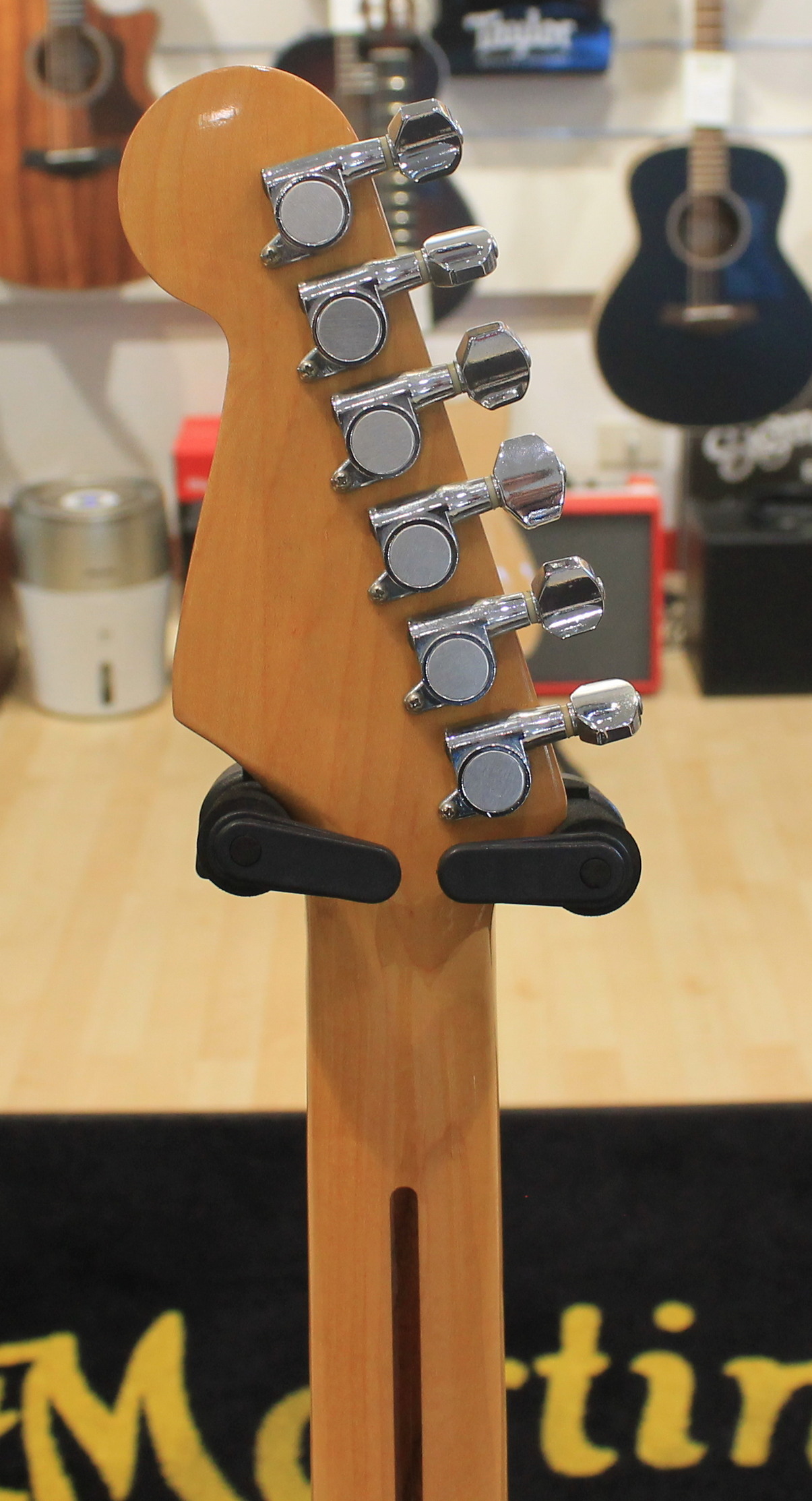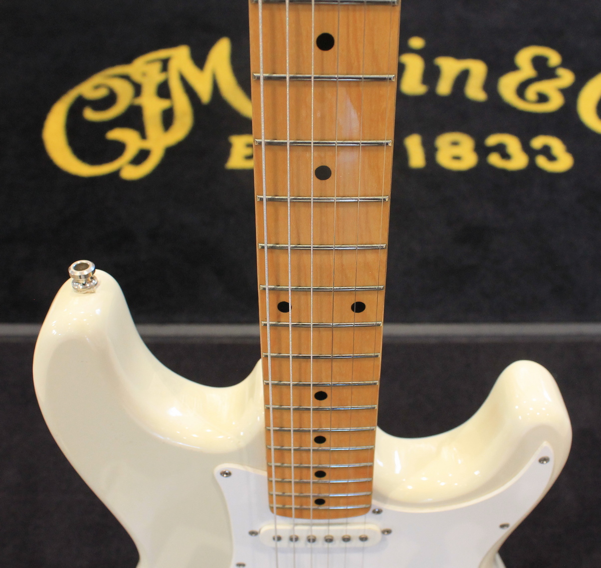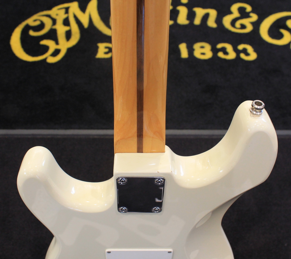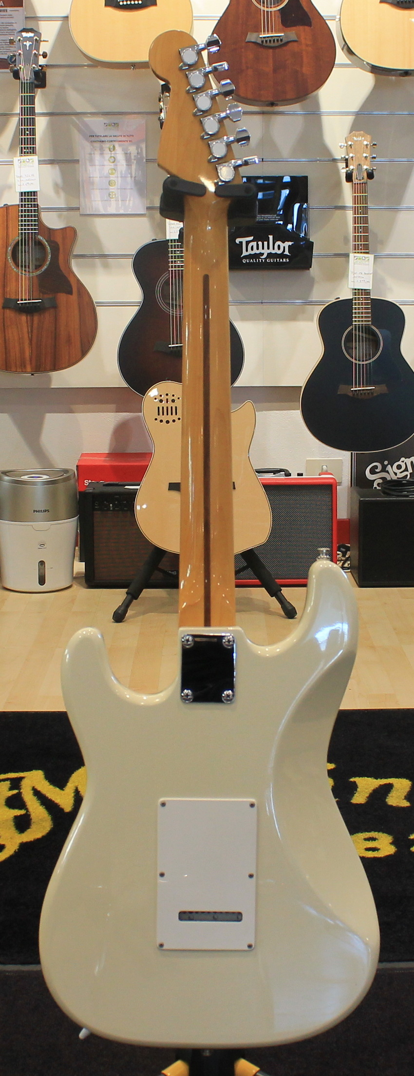 Olympic White finish, hardwood body, maple neck, maple fingerboard, 3 x single-coil, 1 x volume, 1 x tone, synchronized tremolo bridge, chrome hardware, Made in Korea in 1989