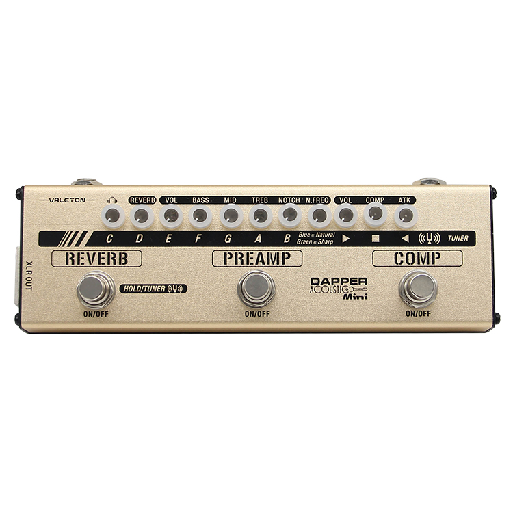 DAPPER ACOUSTIC MINI – Mini Pedaliera/Pre per chitarra acustica – Effect Strip Series – Chassis in alluminio – Tutto ciò di cui hai bisogno per il tuo suono acustico, in una pedaliera microscopica che puoi mettere nella custodia – Effetti: Tuner + Comp + Preamp + Reverb – Controlli COMP: Vol + Comp + Atk – Controlli PREAMP: Vol + Bass + Mid + Treble + Notch + N.Freq – Controlli REVERB: Reverb – Switches: 3x On/Off True-Bypass – Tenendo premuto lo switch del Reverb si attiva il Tuner – Connessioni: Input + Output + Phones + XLR Balanced Out – Alimentazione: 9 Volt DC – Consumo: 140mA – Dimensioni: 197x65x42mm – Peso: 435g.