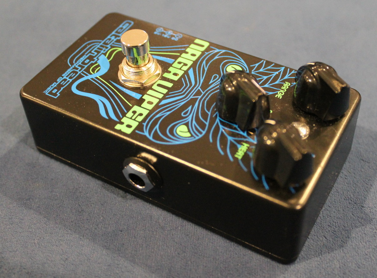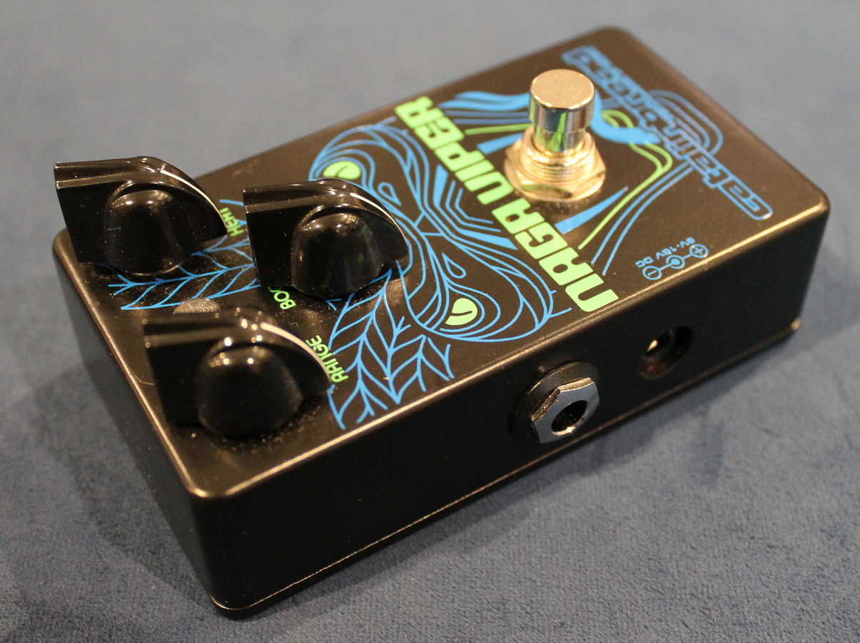 The Naga Viper is hommage to this famous circuit. Beyond it’s basic tuning, the Naga enhances the classic circuit with the addition of two extra controls – Range and Heat. The original Rangemaster had just one control – Boost which everybody dimed anyway but essentially controlled the output volume. Our RANGE knob is a continuous control which allows you to go from classic treble-boost to a full-range boost and anywhere in-between – as the original could only function as a set frequency “treble-booster”. The HEAT knob gives you control over the gain level saturation, unlike the original which was fixed at maximum gain.