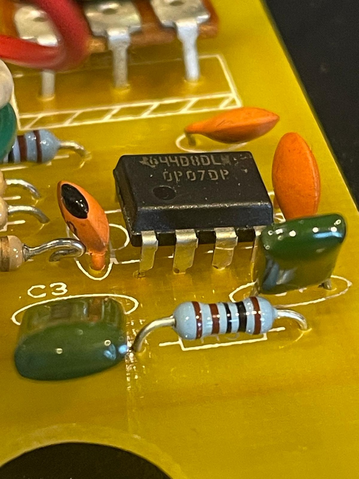 Guitar distortion/fuzz pedal, DISTORTION – FILTER – VOLUME controls, 90s/2000s big box reissue. Serial number 114028. Texas Instruments OP07DP opamp. Made in USA