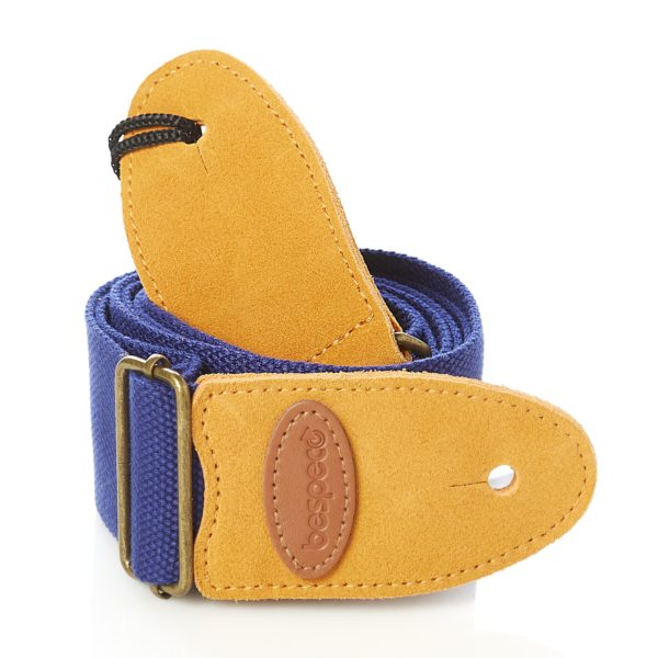 Tracolla professionale per chitarra, in cotone rinforzato, con terminali in pelle scamosciata e fibbie in metallo. 5 cm di larghezza x 88/156 cm in lunghezza (regolabile). Colore blu.