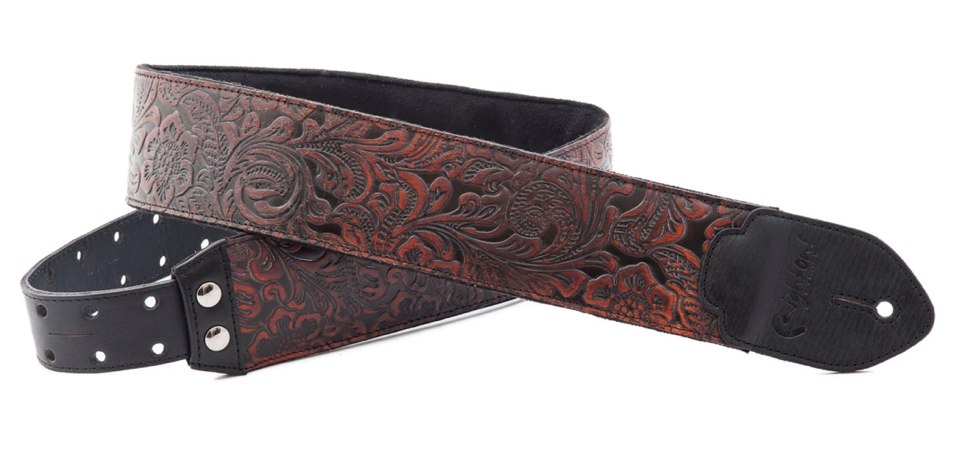 Tracolla artigianale in pelle bovina di alta qualità con decorazioni floreali stampate, con imbottitura in lattice rivestito con microfibra, sistema di regolazione RAS, porta plettri incorporato, estremità in cuoio. Colore nero, larghezza 6 cm, lunghezza regolabile da 90 cm a 150 cm. Indicata per chitarra e basso.