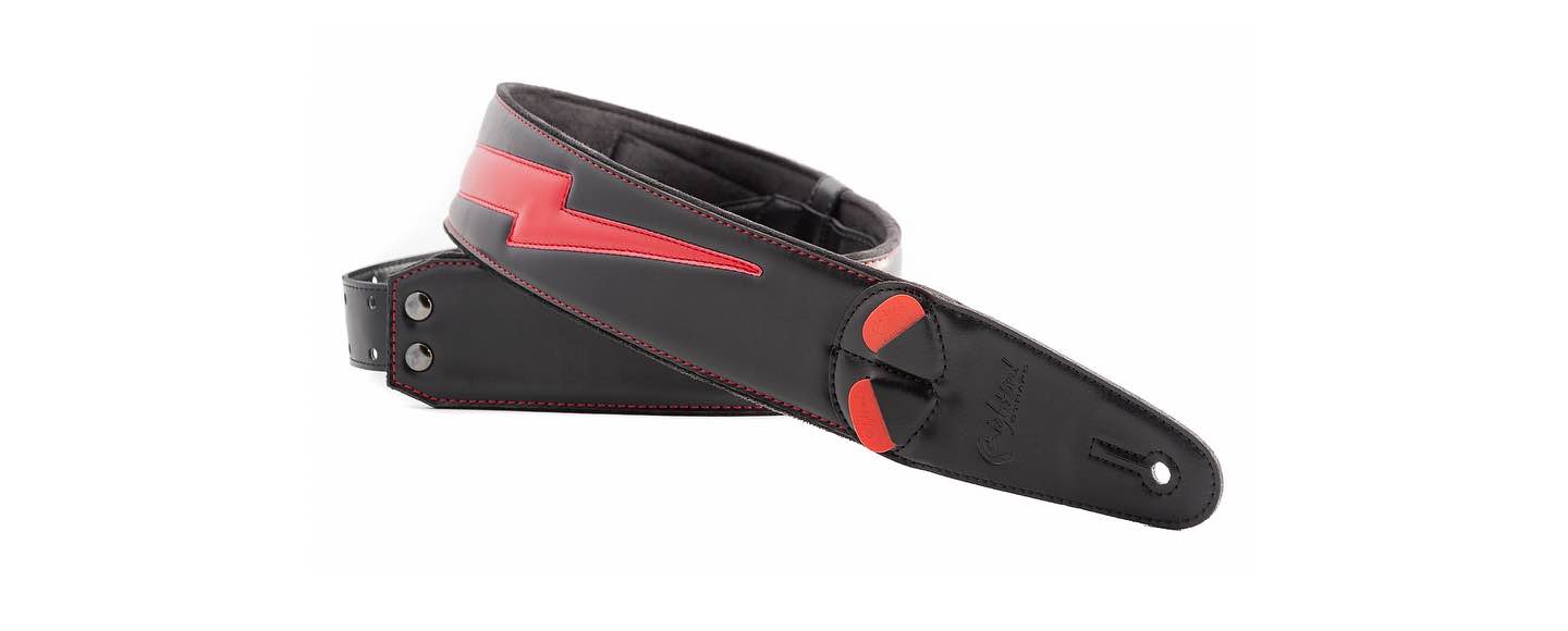 Tracolla realizzata in modo artigianale con materiali ecologici ad alta tecnologia rispettosi dell’ambiente e priva di qualsiasi tessuto animale, finiture curate in ogni dettaglio, caratterizzata da una saetta brillantinata e cuciture colorate, imbottitura in lattice ad alta densità (5 mm), sistema di regolazione RAS, porta plettri incorporato. Colore nero e argento, larghezza 6 cm, lunghezza regolabile da 95 cm a 143 cm, ultra leggera. Indicata per chitarra e basso.