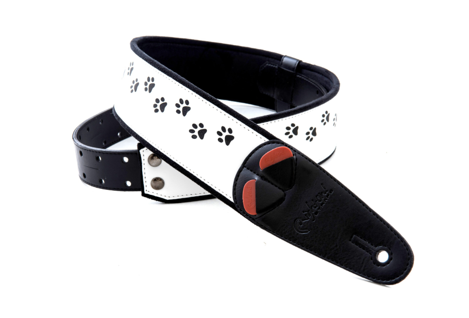 Tracolla realizzata in modo artigianale con materiali ecologici ad alta tecnologia rispettosi dell’ambiente e priva di qualsiasi tessuto animale, caratterizzata da finiture curate in ogni dettaglio, decorazioni a forma di zampa di gatto, imbottitura in lattice ad alta densità (5 mm), sistema di regolazione RAS, porta plettri incorporato. Colore bianco, larghezza 6 cm, lunghezza regolabile da 100 cm a 145 cm, ultra leggera. Indicata per chitarra e basso.