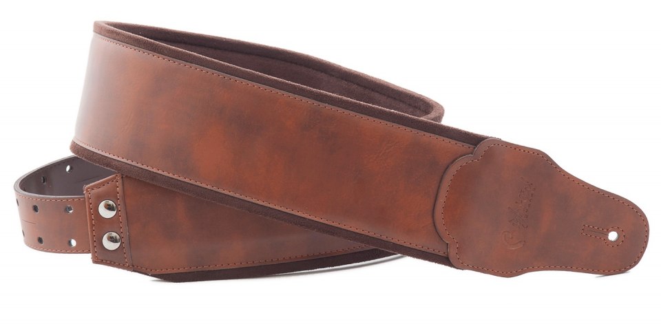Tracolla realizzata in modo artigianale con materiali ecologici ad alta tecnologia rispettosi dell’ambiente e priva di qualsiasi tessuto animale, finitura superiore in ecopelle liscia, imbottitura in lattice rivestito con microfibra, estremità in pelle sintetica, sistema di regolazione RAS e porta plettri incorporato. Colore marrone, larghezza 8 cm, lunghezza regolabile da 98 cm a 153 cm. Indicata per chitarra e basso.