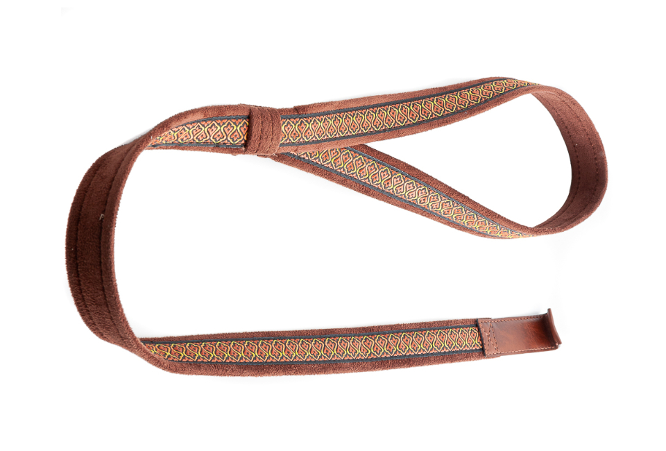 Tracolla per chitarra classica ed acustica realizzata in tessuto decorato, dotata di uno speciale uncino di acciaio ricoperto con pelle sintetica, in grado di sostenere lo strumento senza dover forare il legno. Colore marrone, larghezza 2,5 cm, lunghezza regolabile da 63 cm a 90 cm, imbottitura in lattice rivestito con microfibra.