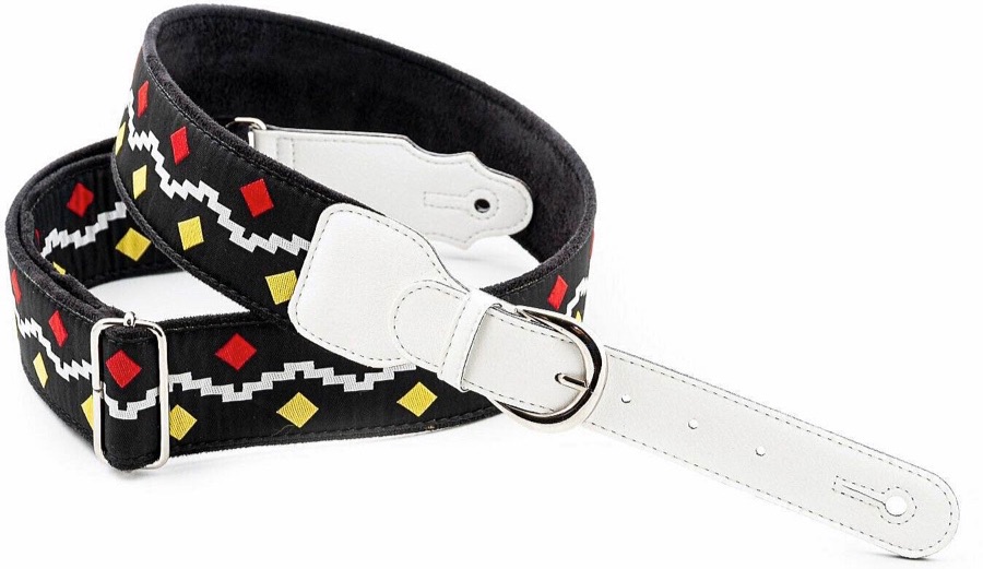 Tracolla in tessuto decorata con un motivo vintage ispirato a al modello indossato da George Harrison/Paul McCartney nel 1969 in microfibra, estremità in pelle sintetica di alta qualità. Colore nero con decorazioni colorate ed estremità bianche, larghezza 5,5 cm, lunghezza regolabile da 85 cm a 150 cm. Indicata per chitarra e basso.