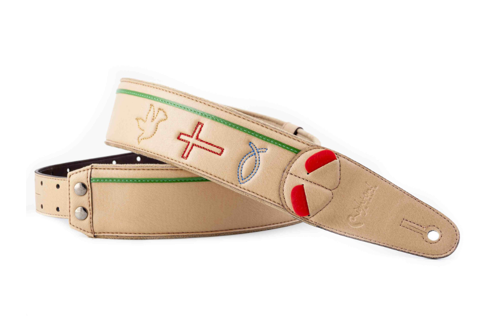 Tracolla realizzata in modo artigianale con materiali ecologici ad alta tecnologia rispettosi dell’ambiente e priva di qualsiasi tessuto animale, finiture curate in ogni dettaglio, caratterizzata da decorazioni con simboli religiosi, imbottitura in lattice ad alta densita (5 mm), sistema di regolazione RAS, porta plettri incorporato. Colore beige, larghezza 6 cm, lunghezza regolabile da 100 cm a 145 cm, ultra leggera. Indicata per chitarra e basso.